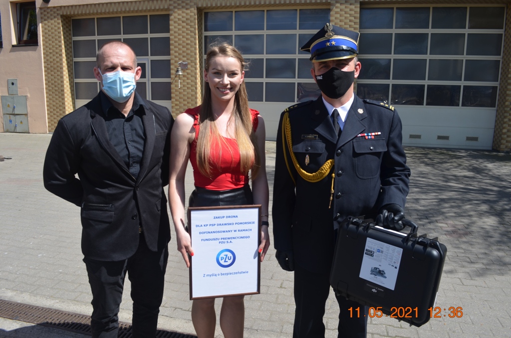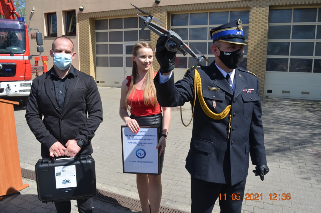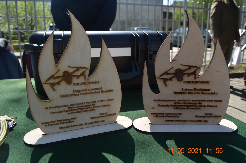 Kolejnym miłym akcentem uroczystości było przekazanie na ręce Komendanta Powiatowego PSP w Drawsku Pomorskim drona ratowniczego wraz z ubezpieczeniem i pakietem szkoleń zakupionego przez funkcjonujące na terenie powiatu drawskiego stowarzyszenie Żarek. Dron wyposażony m.in. w kamerę termowizyjną, oświetlenie pola pracy i zestaw komunikacji głosowej zakupiony został w ramach dofinansowania uzyskanego w ramach Funduszu Prewencyjnego PZU S.A., środków własnych Stowarzyszenia Żarek oraz darowizn przekazanych przez nadleśnictwa z terenu powiatu drawskiego.