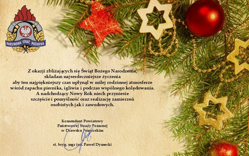 Życzenia Komendanta Powiatowego Państwowej Straży Pożarnej w Drawsku Pom. z okazji świat Bożego Narodzenia 2022 22.12.2022 Zdjęcia (1) Pokaż zdjęcie 1 z galerii.