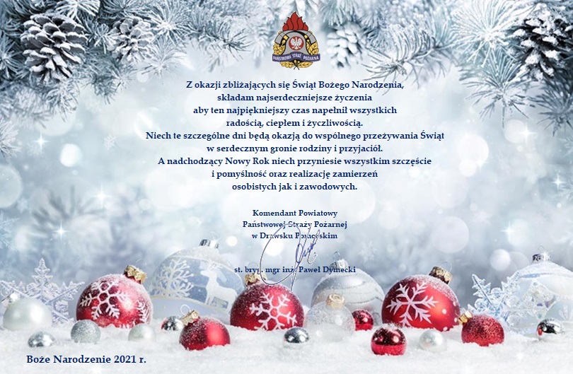 Życzenia Komendanta Powiatowego PSP w Drawsku Pom. z okazji Świąt Bożego Narodzenia 23.12.2021 Zdjęcia (1) Pokaż zdjęcie 1 z galerii.