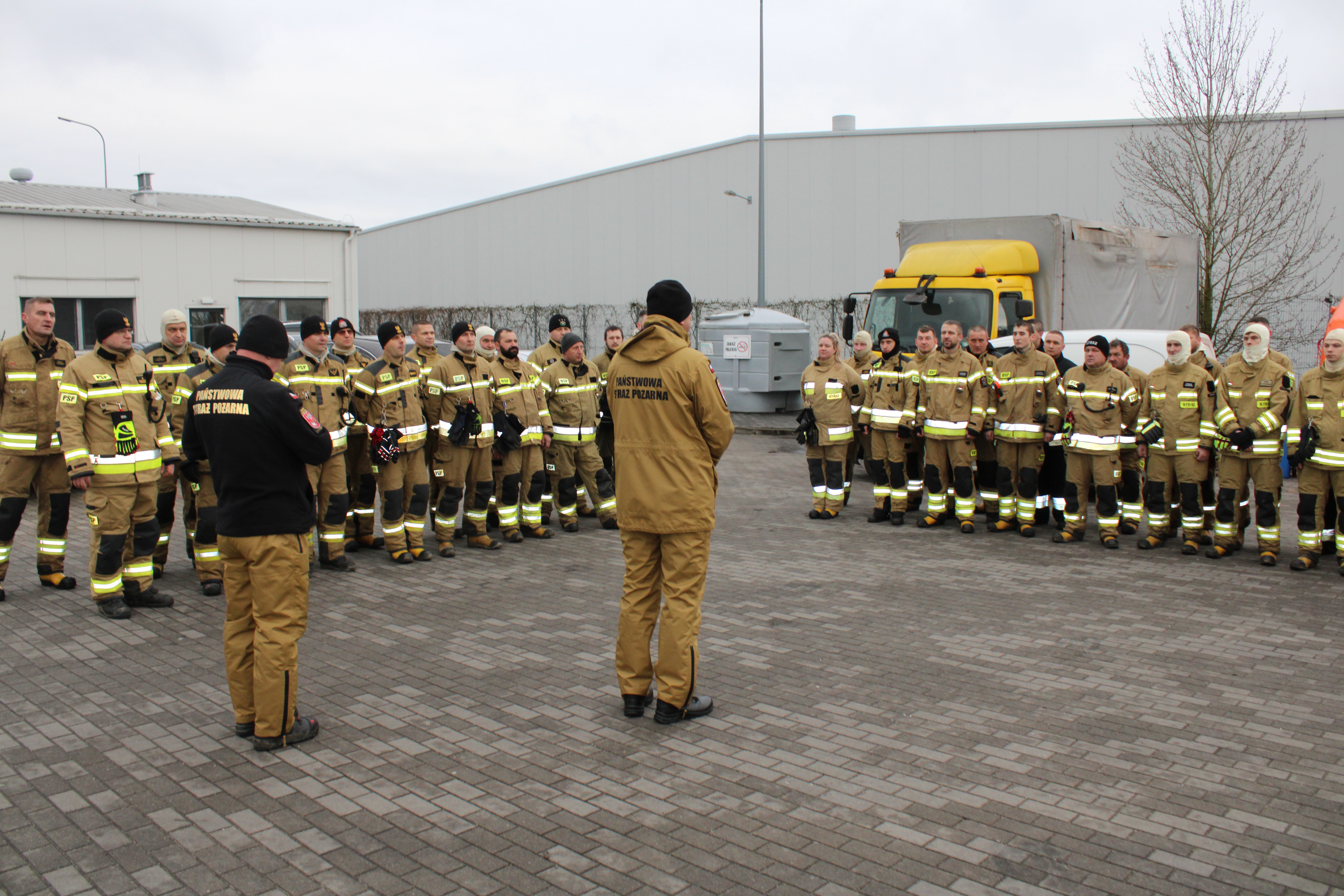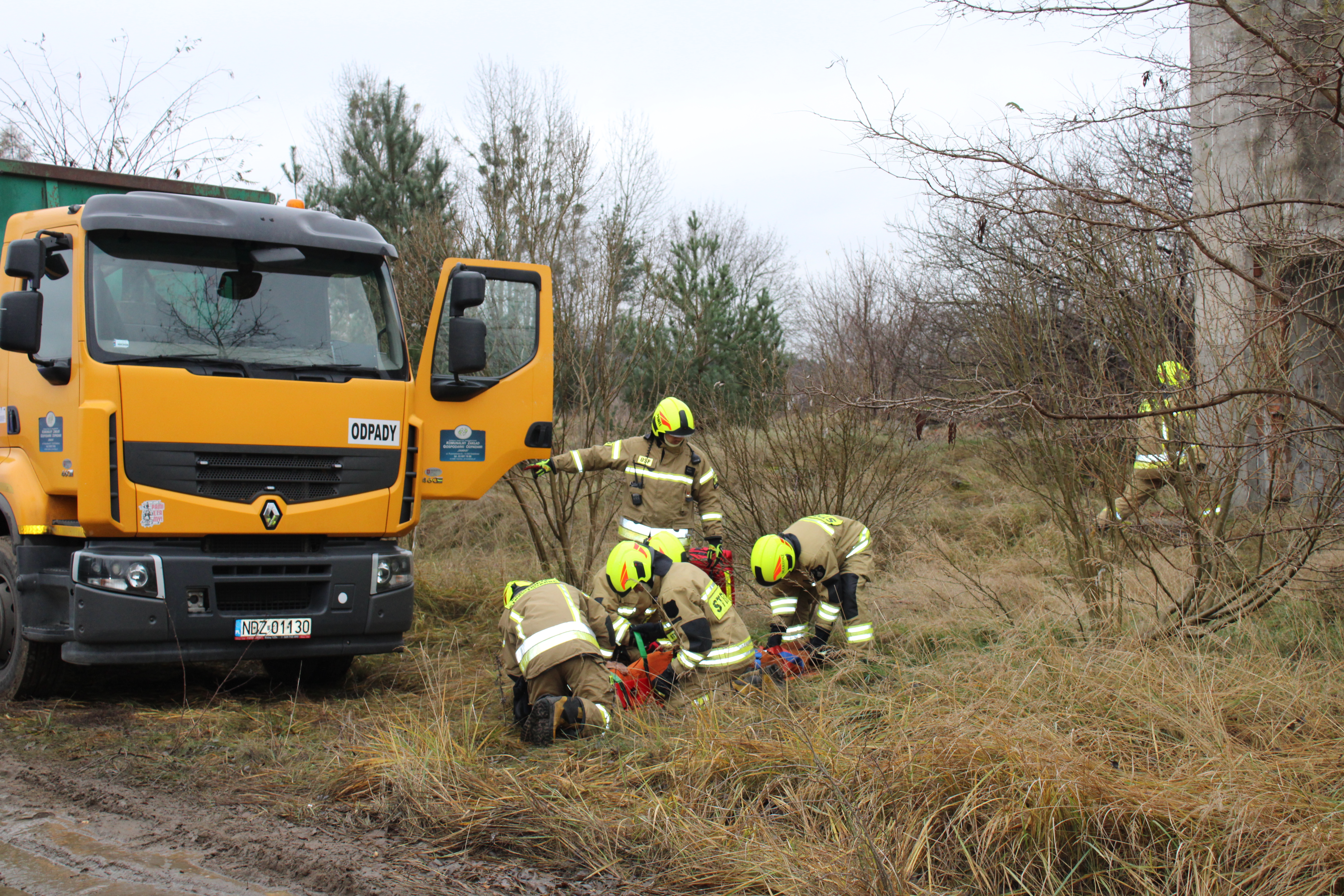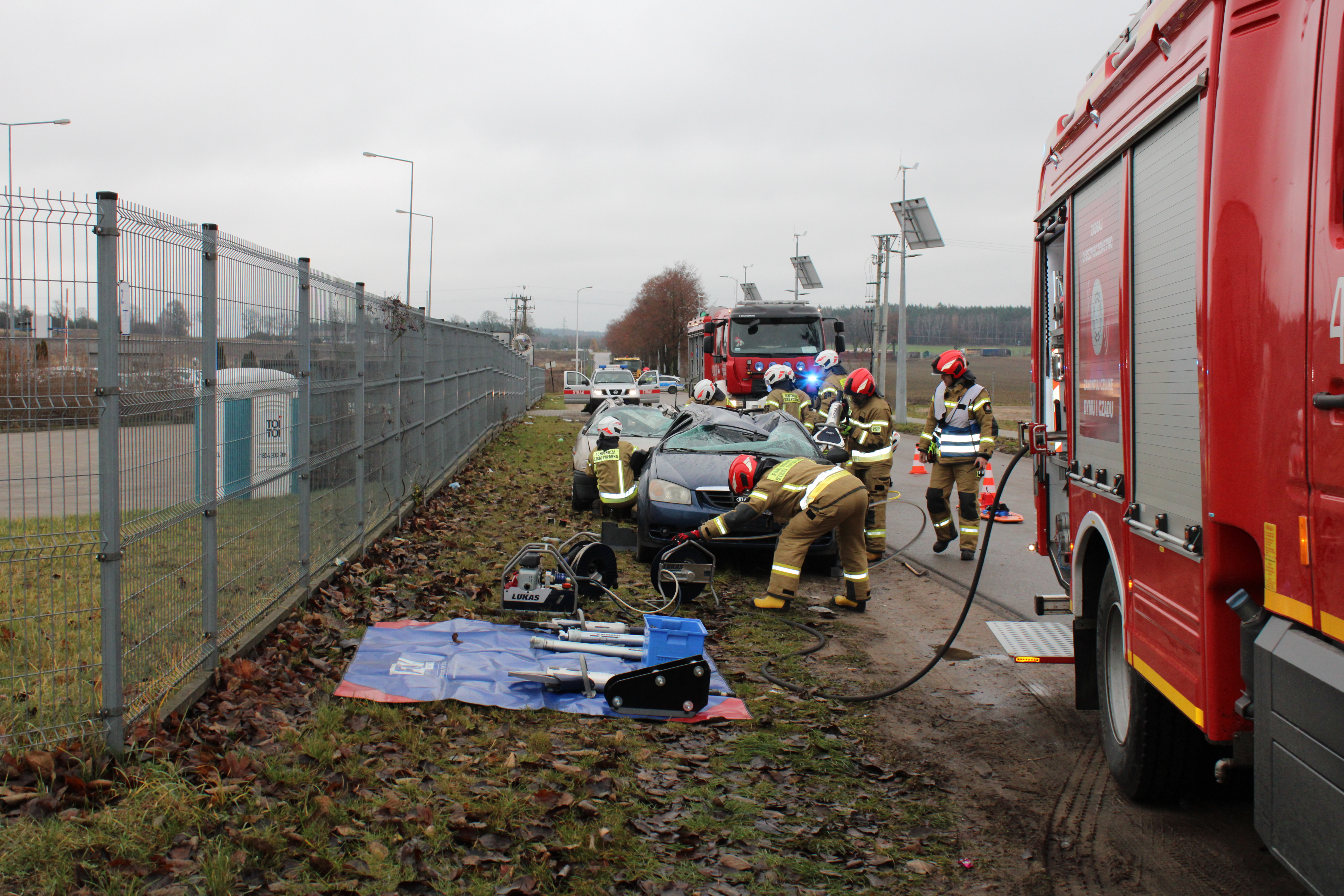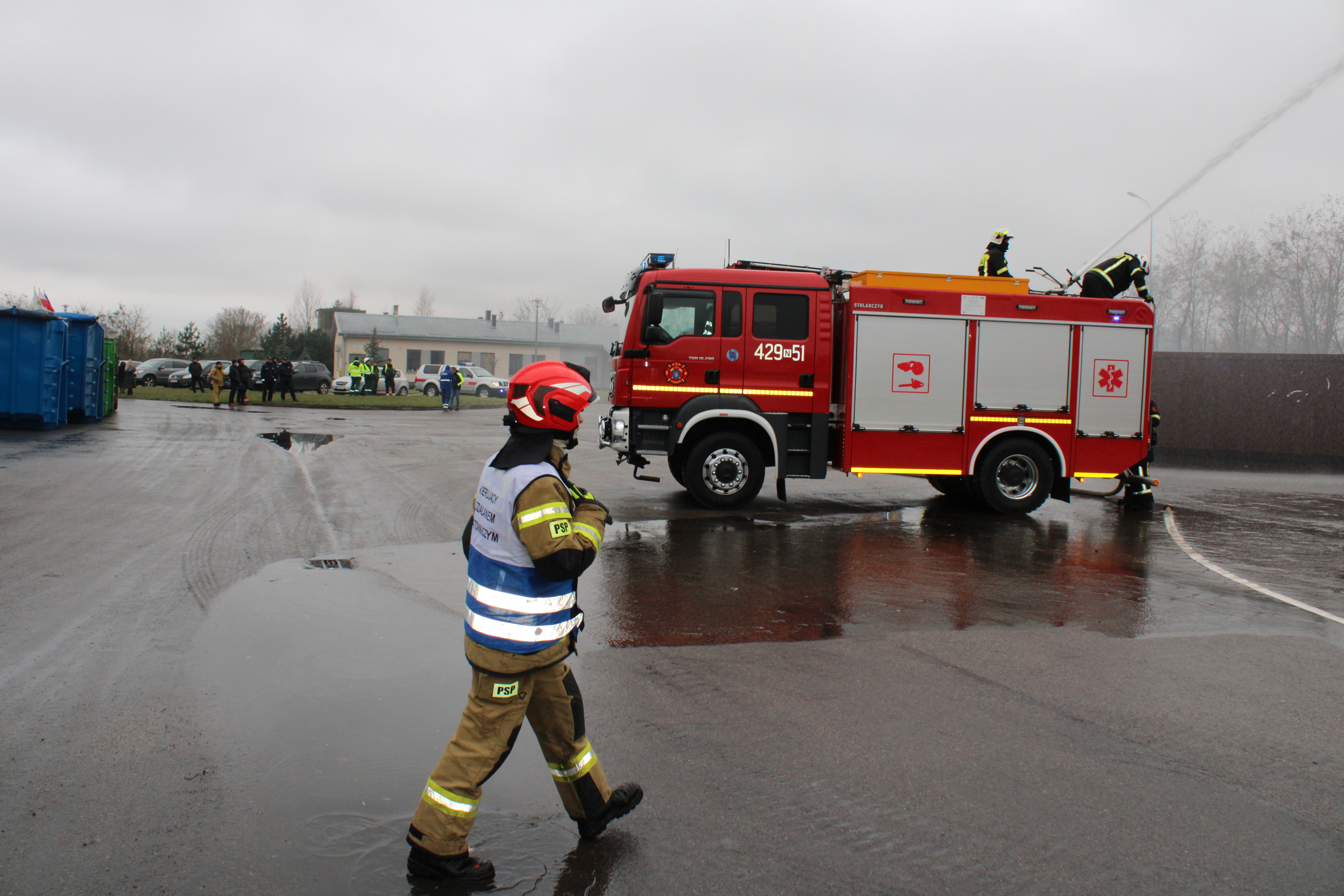 W dniu 29 listopada 2024 roku przeprowadzono ćwiczenia zgrywające z udziałem sił i środków Komendy Powiatowej PSP w Działdowie oraz OSP z terenu powiatu działdowskiego. Scenariusz ćwiczeń zakładał rozległe działania. Na wjeździe do zakładu gospodarki odpadami ustawiły się dwa samochody osobowe. Kierowca samochodu ciężarowego, wiozący odpady w kontenerze zasłabł, a samochód przez niego prowadzony staranował zatrzymane pojazdy, po czym sam znalazł się na polnej drodze, obok budynku stacji transformatorowej, w którym konserwację przeprowadzał pracownik zakładu energetycznego. W wyniku zdarzenia, rozszczelnieniu uległ zbiornik paliwowy samochodu ciężarowego, a wyciekające paliwo zapaliło się. Powstały pożar rozprzestrzeniał się w kierunku budynku stacji transformatorowej, następnie po gęstwinie zarośli w kierunku wiaty z odpadami, która finalnie również objęta została płomieniami. Dodatkowo pożar rozprzestrzenił się na zbiornik w którym zgromadzona była płynna substancja palna. Poszkodowanych zostało 6 osób - 4 osoby w samochodach osobowych, 1 kierowca samochodu ciężarowego i 1 osoba w stacji transformatorowej. Strażacy musieli wykazać się umiejętnościami skoordynowania wielopłaszczyznowych działań, w których udział brało 11 zastępów. Poniżej przedstawiono wykaz sił i środków. W ćwiczenia zaangażowani byli również przedstawiciele Powiatowego Zespołu Zarządzania Kryzysowego, Policji oraz kierownictwo i pracownicy zakładu.