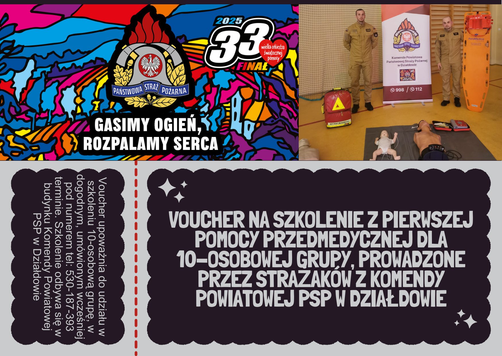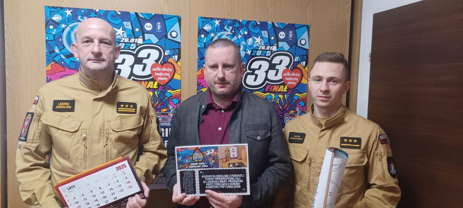 Działdowscy strażacy grają w 33 finale z Wielką Orkiestrą Świątecznej Pomocy. W dniu dzisiejszym do działdowskiego sztabu WOŚP, Komendant Powiatowy PSP w Działdowie st. bryg. Leszek Góralski przekazał na licytację zestaw kalendarzy strażackich oraz voucher na szkolenie z pierwszej pomocy przedmedycznej dla 10-osobowej grupy, które przeprowadzone zostanie przez funkcjonariuszy naszej komendy. Nasi strażacy będą również obecni podczas niedzielnego finału (26.01.2025 r.), który odbywać się będzie w sali gimnastycznej Szkoły Podstawowej nr 2 przy ul. Sportowej. Od godziny 14:00 zapraszamy na nasze stoisko z nauką pierwszej pomocy. Zachęcamy również do licytacji. Pamiętajmy o szczytnym celu tegorocznej zbiórki, gramy dla onkologii i hematologii dziecięcej.