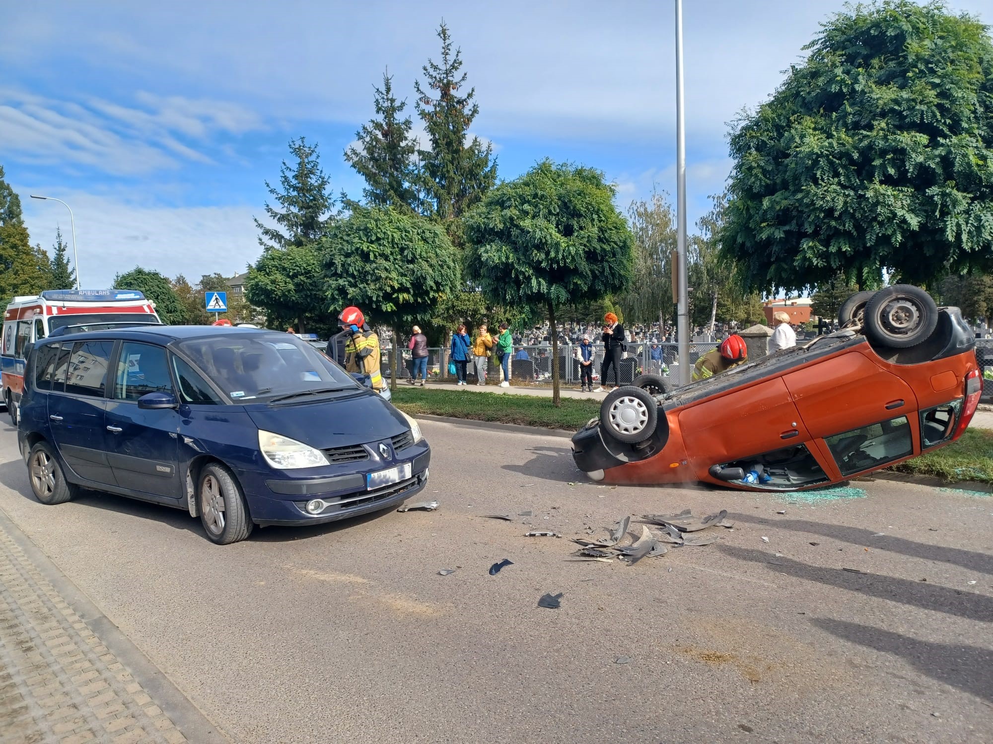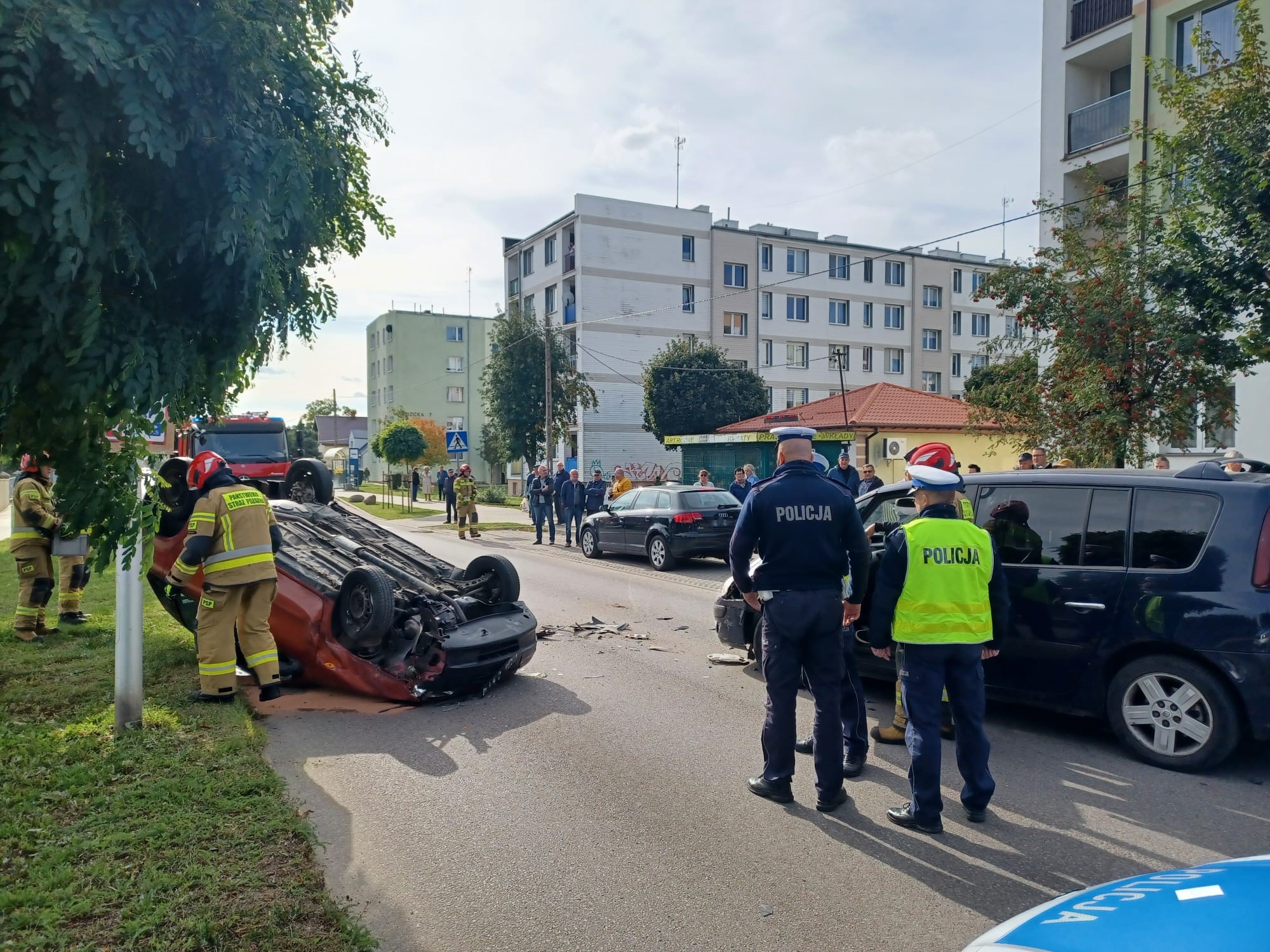 W poniedziałek (09.10.2023 r.) na ulicy Nidzickiej w Działdowie, doszło do groźnie wyglądającego zdarzenia z udziałem dwóch samochodów osobowych. W wyniku zderzenia pojazdów, jeden z nich przewrócił się na dach. Samochodami podróżowały dwie osoby, które o własnych siłach opuściły pojazdy przed przybyciem strażaków. Działania zastępów na miejscu zdarzenia polegały na udzielaniu kwalifikowanej pierwszej pomocy poszkodowanym do momentu przybycia zespołu ratownictwa medycznego, a także zabezpieczenie pojazdów, m.in. przez odłączenie zasilania elektrycznego samochodów i zakręcenie butli z gazem w pojeździe znajdującym się na dachu. Przy użyciu sorbentu (specjalny sypki materiał do wchłaniania cieczy), zabezpieczone zostały również płyny eksploatacyjne, które wyciekły z samochodu na jezdnię. Po przebadaniu poszkodowanych przez zespół ratownictwa medycznego, jedna osoba zabrana została do szpitala a druga nie wymagała hospitalizacji i pozostała na miejscu.