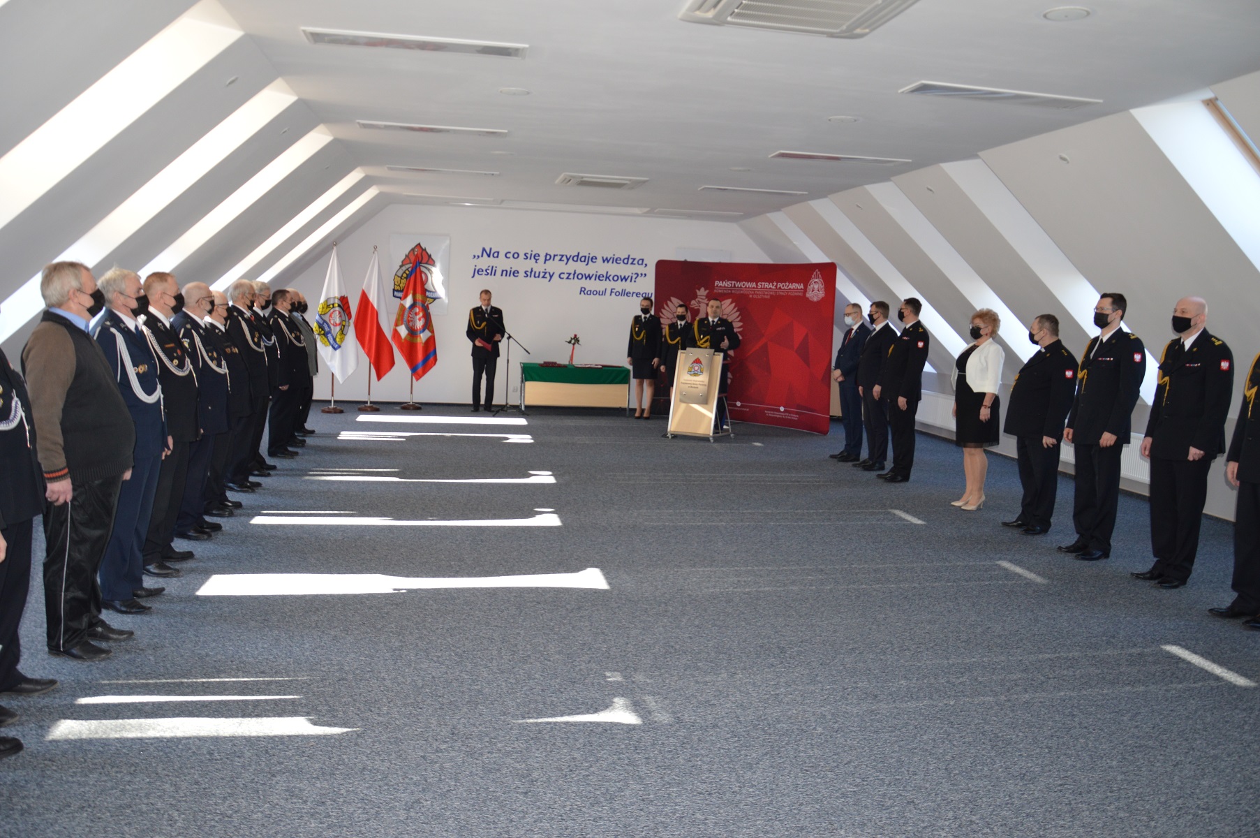 11 marca 2022r. w sali konferencyjnej Ośrodka Szkolenia Komendy Wojewódzkiej PSP w Olsztynie odbyła się uroczysta zbiórka, podczas której Podsekretarz Stanu w Ministerstwie Spraw Wewnętrznych i Administracji Pan Błażej Poboży a także Wojewoda Warmińsko-Mazurski Artur Chojecki i nadbryg. Tomasz Komoszyński- Warmińsko-Mazurski Komendant Wojewódzki PSP, spotkali się ze strażakami z naszego województwa.