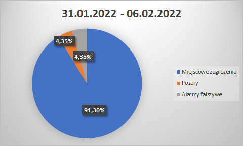 W minionym tygodniu (31.01.2022- 06.02.2022) strażacy z powiatu działdowskiego interweniowali łącznie 23 razy. Względem poprzednich dwóch tygodni, można powiedzieć, że był to wyjątkowo spokojny tydzień . Wykres przedstawia procentowe zestawienie ze względu na rodzaj zdarzeń.