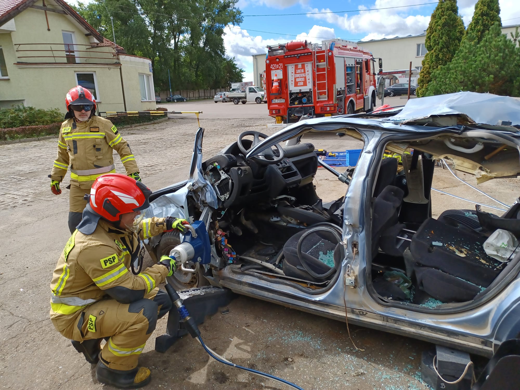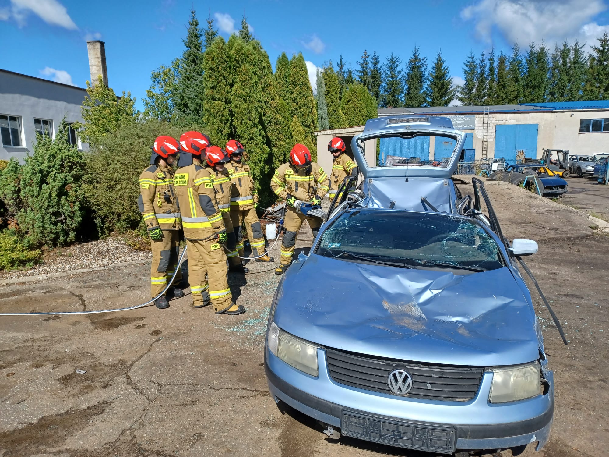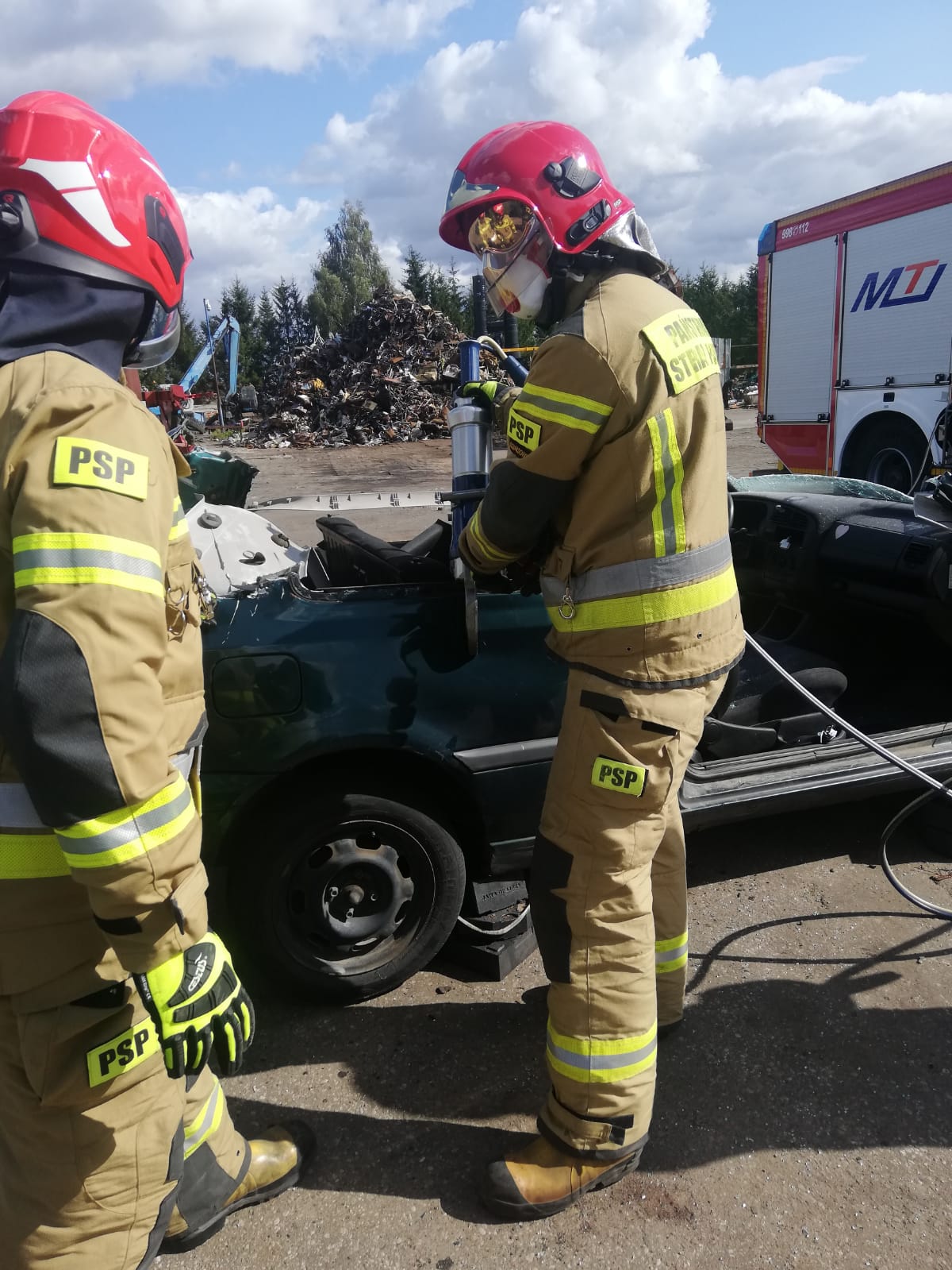 Dzięki temu, strażacy z naszej Jednostki Ratowniczo – Gaśniczej, przez cały rok mają możliwość cyklicznych ćwiczeń doskonalących w warunkach zbliżonych do rzeczywistych. W tym celu, pracownicy firmy zawsze służą pomocą i ciężkim sprzętem odpowiednio uszkadzają oraz ustawiają wraki pojazdów, w zależności od założenia. Wypadki samochodowe, w których dochodzi do zdeformowania pojazdów i uwięzienia poszkodowanych w środku w takim stopniu, że konieczne jest użycie specjalistycznego sprzętu hydraulicznego (sprzęt typu nożyce, rozpieracze, do cięcia i rozpierania elementów oraz karoserii samochodu), na szczęście nie zdarzają się zbyt często. Jednak ze względu na to, strażacy muszą kłaść duży nacisk na doskonalenie z tego obszaru działań, bo gdy zajdzie już potrzeba takiej interwencji, muszą działać szybko i efektywnie. Często w walce o ludzkie życie liczą się nawet nie minuty, a sekundy. Bez możliwości organizowania takich cyklicznych, systematycznych ćwiczeń, optymalizacja działań w zakresie ratownictwa technicznego i minimalizowanie czasu wydobycia osób uwięzionych w pojazdach, nie byłoby możliwe. Dzięki Państwu, możemy utrzymywać wiedzę i umiejętności strażaków z tej dziedziny na wysokim poziomie. Dziękujemy, że bezpieczeństwo mieszkańców naszego powiatu, nie jest Państwu obojętne.