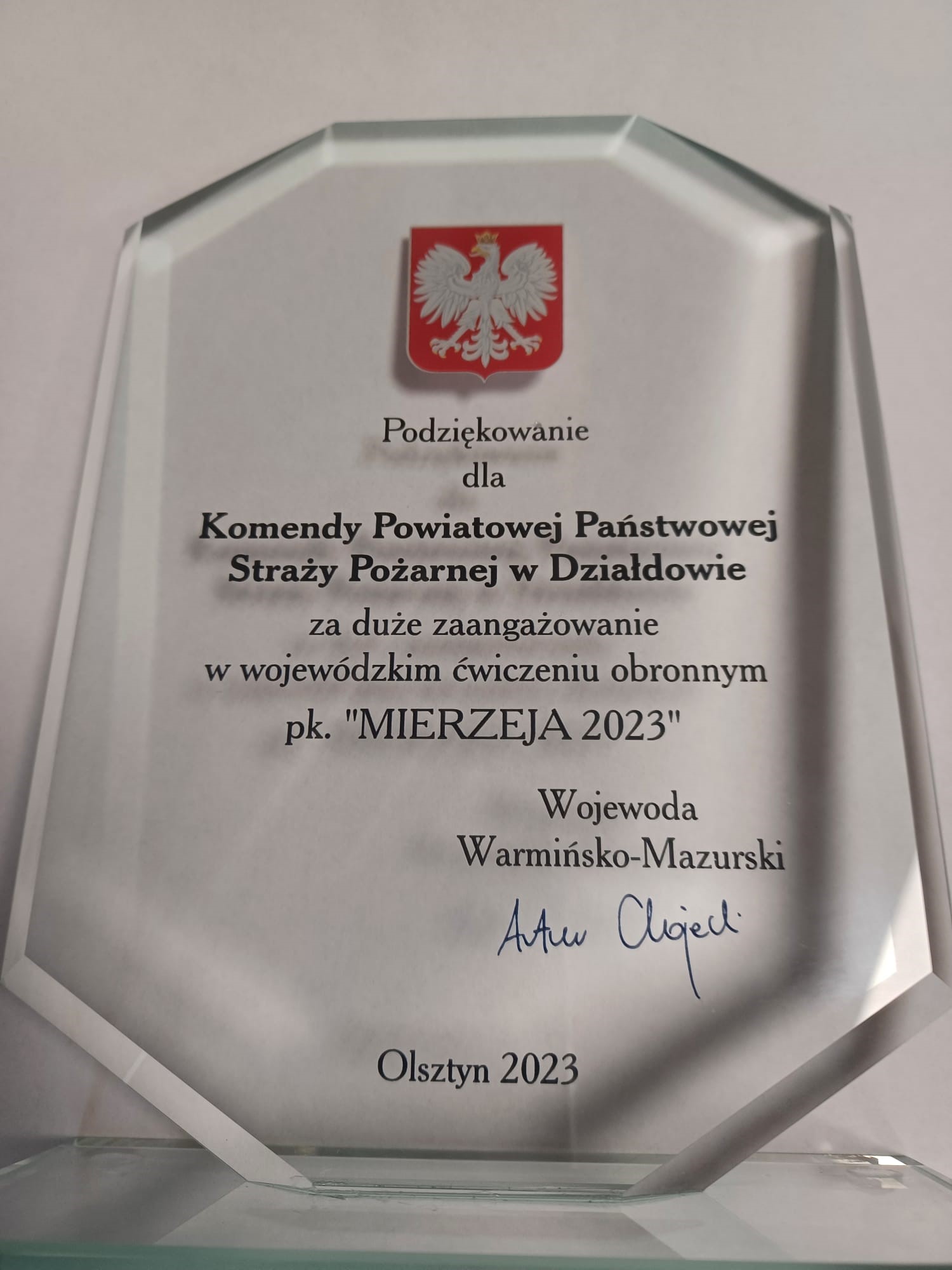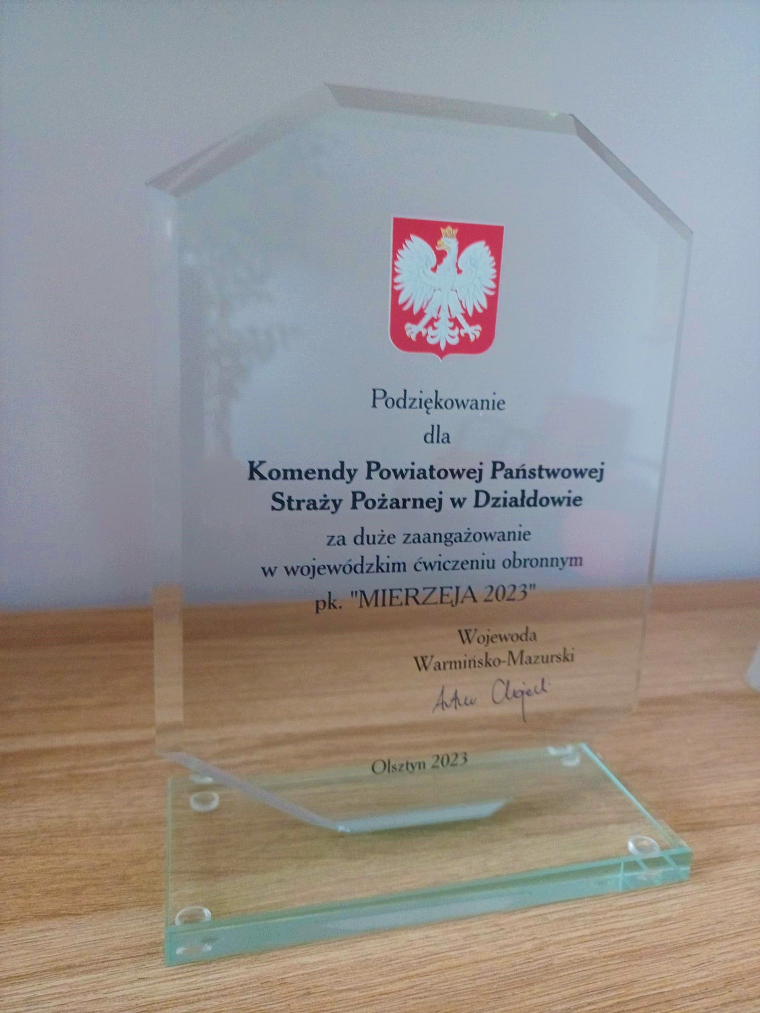 W dniu 02.08.2023 r., na spotkaniu organizowanym przez Starostwo Powiatowe w Działdowie, wręczone zostały podziękowania dla Komendy Powiatowej Państwowej Straży Pożarnej w Działdowie, za duże zaangażowanie w wojewódzkich ćwiczeniach obronnych pk. „MIERZEJA 2023”. W dniu 9 maja, w ramach manewrów „MIERZEJA 2023”, odbyły się ćwiczenia, których scenariusz zakładał wypadek samochodowy na skrzyżowaniu drogi wojewódzkiej 545 z drogą powiatową w miejscowości Komorniki. W wypadku brały udział dwa pojazdy z których jeden przewoził pojemnik z materiałem promieniotwórczym. Na skutek zdarzenia drogowego pojemnik z materiałem promieniotwórczym został uszkodzony. Działania ratownicze z udziałem strażaków polegały na zabezpieczeniu miejsca zdarzenia, wyznaczeniu strefy niebezpiecznej przy wykorzystaniu sprzętu dozymetrycznego, dotarciu do osób poszkodowanych i ich ewakuacji, przygotowaniu punktu dekontaminacji i przeprowadzeniu czynności dekontaminacyjnych wobec osób uczestniczących w zdarzeniu.