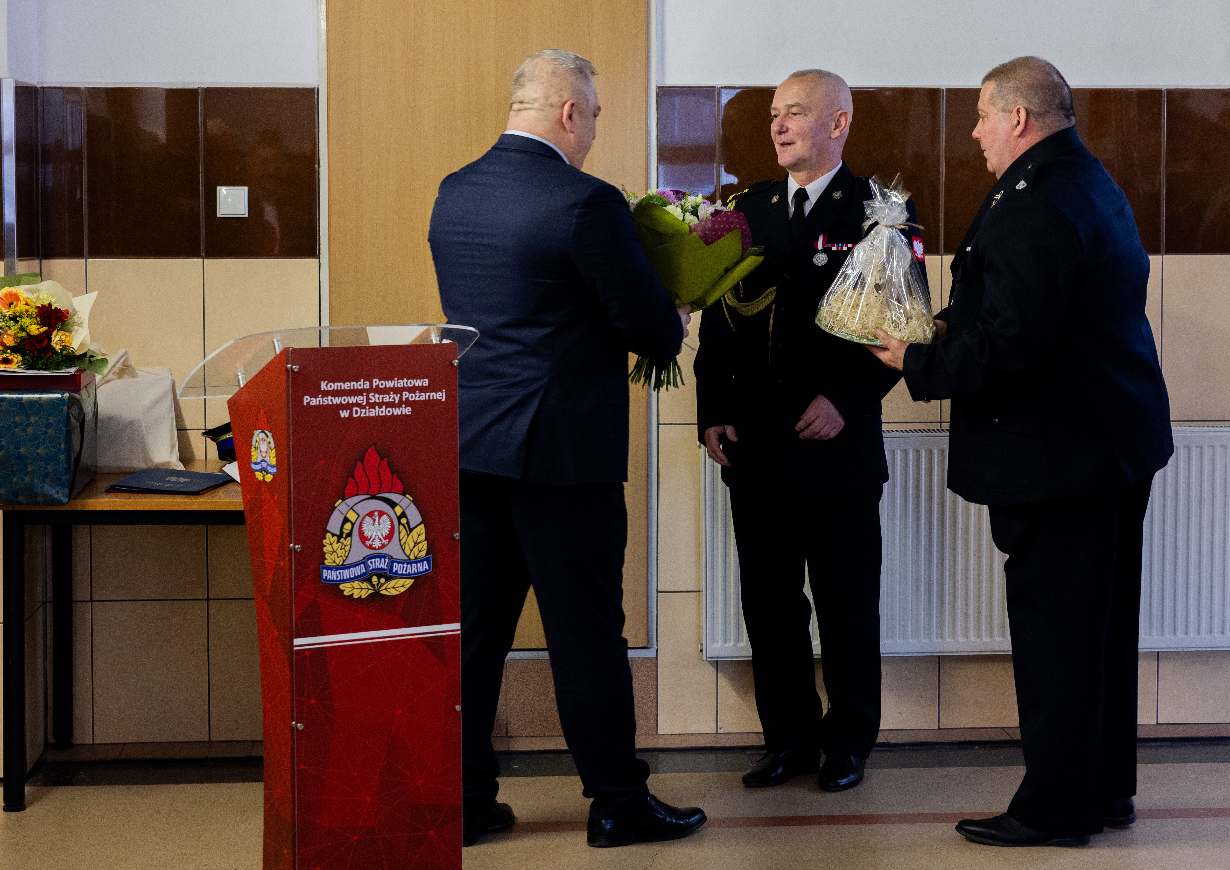 Uroczysta zbiórka z tej okazji, w naszej komendzie odbyła się już wcześniej, bo we wtorek 28 stycznia. Uroczystość uświetnili swoją obecnością m. in. samorządowcy na czele z Burmistrzem Lidzbarka oraz wójtami gmin Rybno, Iłowo-Osada i Płośnica, komendanci gminni ZOSPRP z terenu naszego powiatu, emerytowani funkcjonariusze oraz pracownicy KP PSP w Działdowie i rodzina przyszłego emeryta. Komendant Powiatowy PSP w Działdowie st. bryg. Leszek Góralski w imieniu swoim oraz wszystkich funkcjonariuszy i pracowników naszej komendy, złożył podziękowania za długoletnią, przykładną służbę odchodzącemu na emeryturę strażakowi. Wszyscy dziękujemy za to, że przez lata byłeś w pełni zaangażowanym fundamentem naszej komendy i wsparciem w sprawach służbowych, ale przede wszystkim za to, że zawsze pozostawałeś dobrym, pomocnym i nieobojętnym na drugiego człowieka. Piotrze, życzymy Ci zasłużonego spokoju i odpoczynku oraz wszelkiej pomyślności na nowym etapie życia.