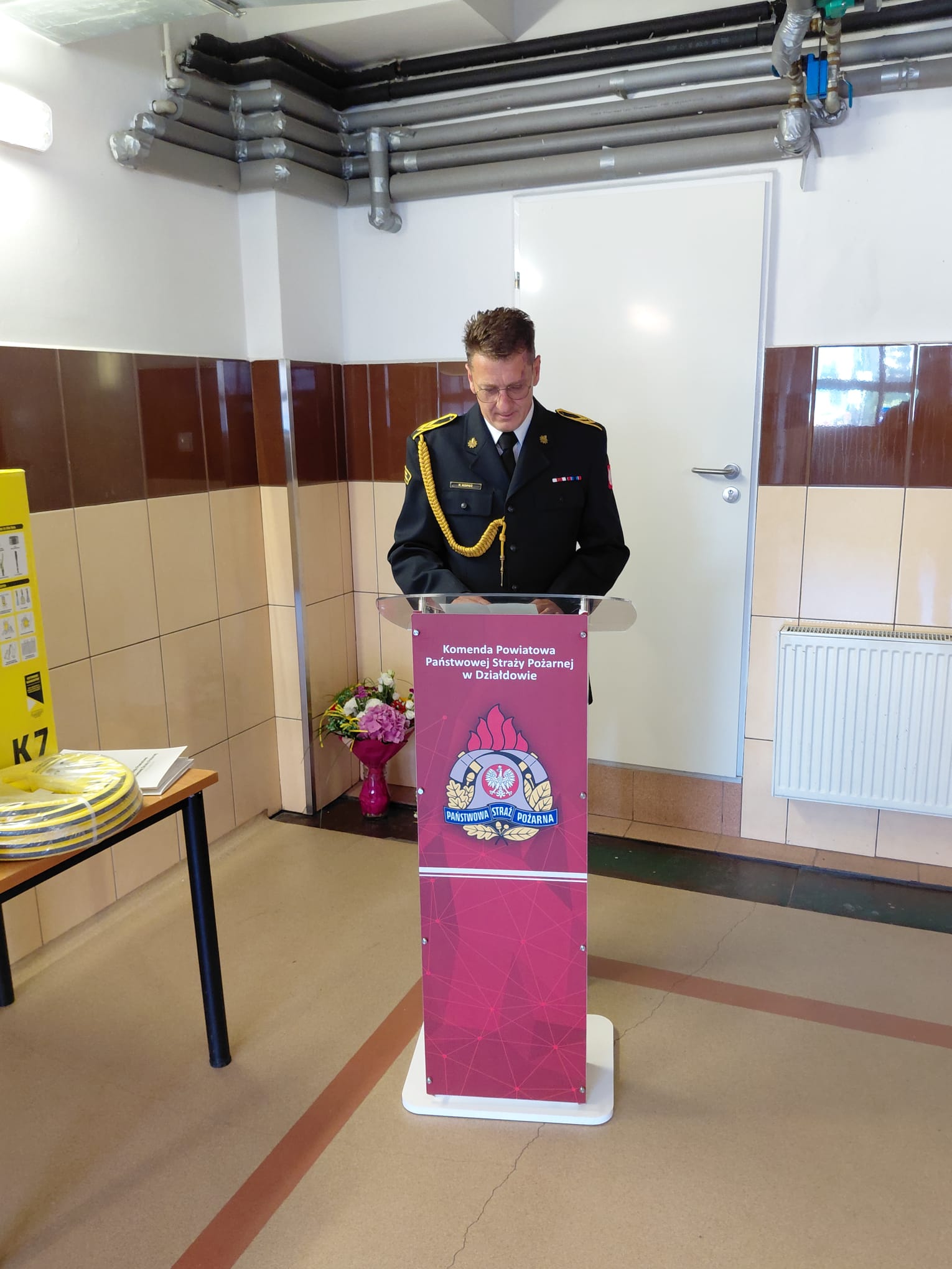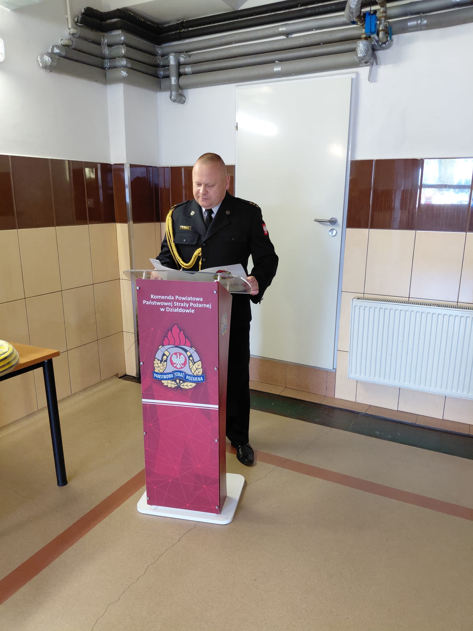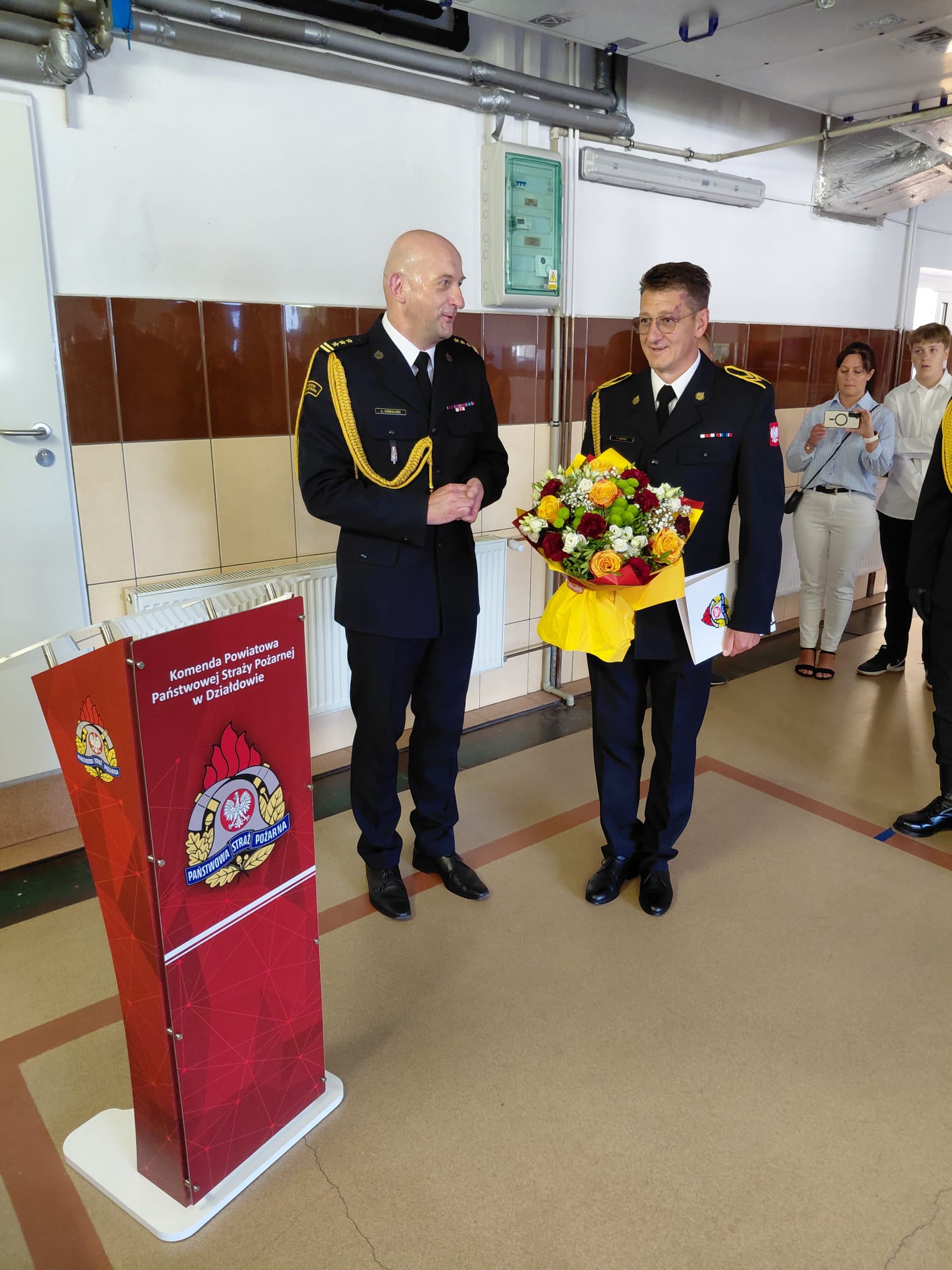 Podczas uroczystej zbiórki Komendant Powiatowy PSP w Działdowie st. bryg. Leszek Góralski po przytoczeniu przebiegu służby w imieniu swoim oraz wszystkich funkcjonariuszy i pracowników cywilnych naszej komendy złożył podziękowania za wzorową służbę odchodzącemu na emeryturę strażakowi.