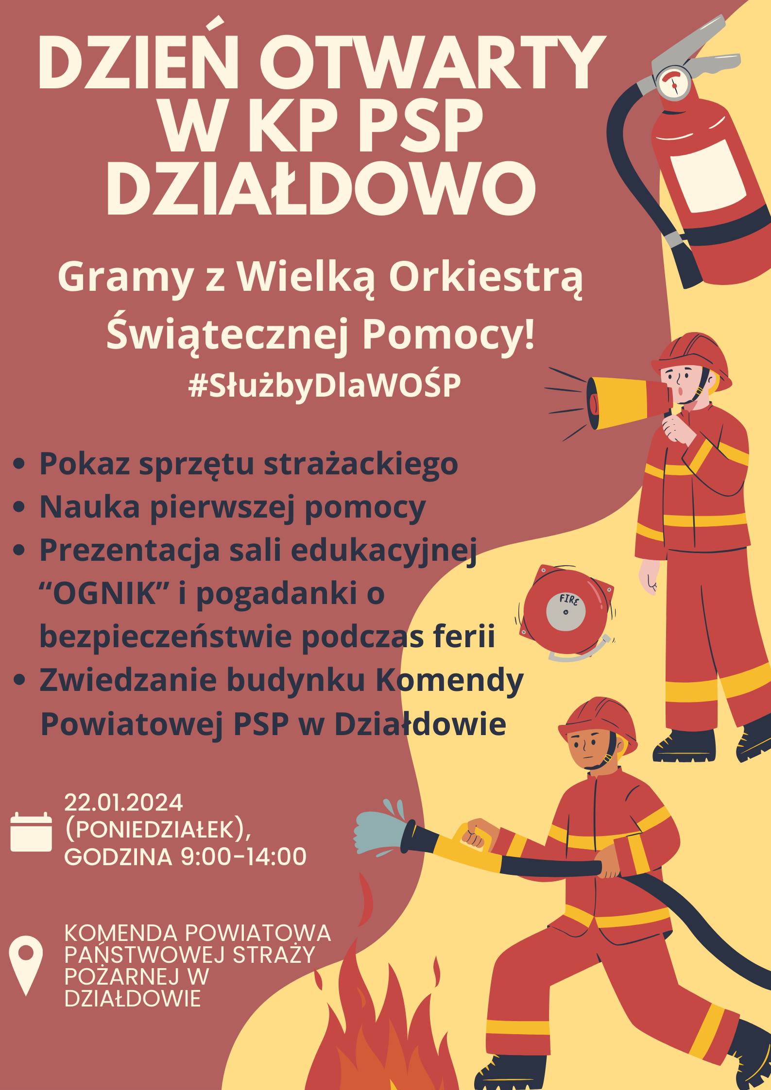 22.01.2024 r. w godzinach 9:00-14:00, zapraszamy serdecznie do udziału w dniu otwartym KP PSP w Działdowie. Dla zwiedzających przygotowaliśmy wiele atrakcji, między innymi: