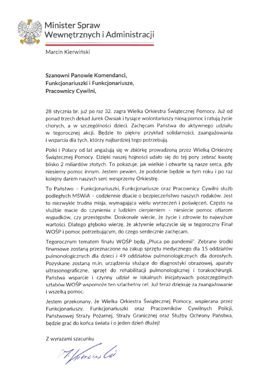 Minister Marcin Kierwiński skierował do funkcjonariuszy i pracowników poszczególnych służb podległych MSWiA list zachęcający do udziału w 32. finale Wielkiej Orkiestry Świątecznej Pomocy. Chcemy, aby funkcjonariuszki, funkcjonariusze oraz pracownicy Policji, Państwowej Straży Pożarnej, Straży Granicznej oraz Służby Ochrony Państwa zaangażowali się w tę piękną i szlachetną inicjatywę.