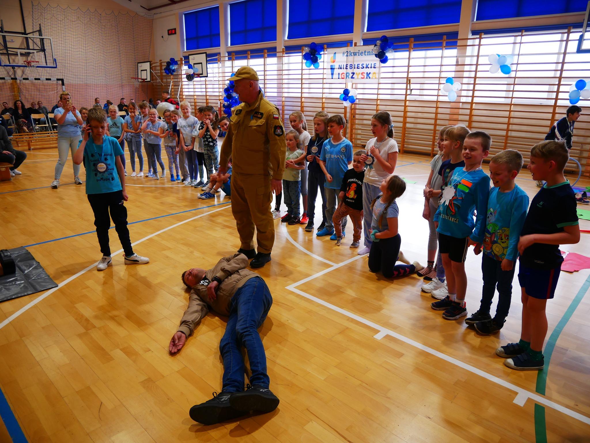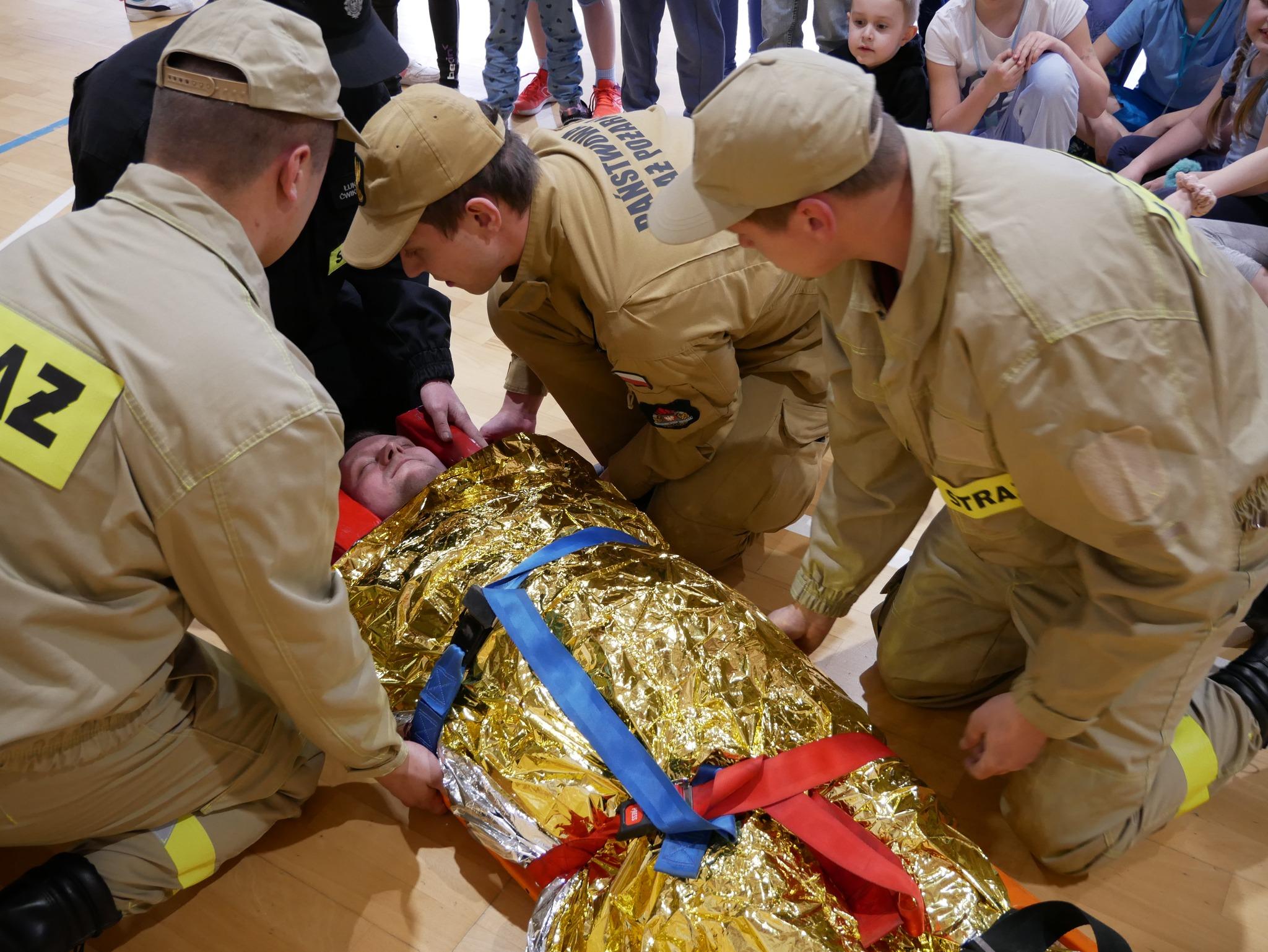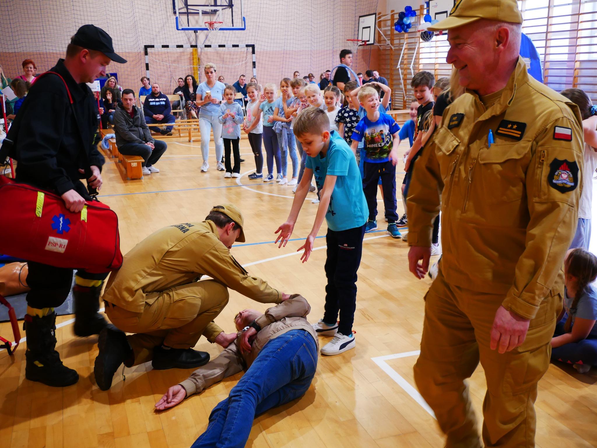 Jedną z atrakcji igrzysk były pokazy i nauka pierwszej pomocy, przeprowadzana przez funkcjonariuszy z Komendy Powiatowej Państwowej Straży Pożarnej w Działdowie oraz druhów z Ochotniczej Straży Pożarnej w Hartowcu. Bardzo cieszy i buduje duże zaangażowanie dzieci oraz chęć nauki tak ważnego zagadnienia jakim jest umiejętność zachowania się i udzielenia pomocy w sytuacjach zagrożenia zdrowia i życia.