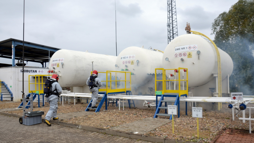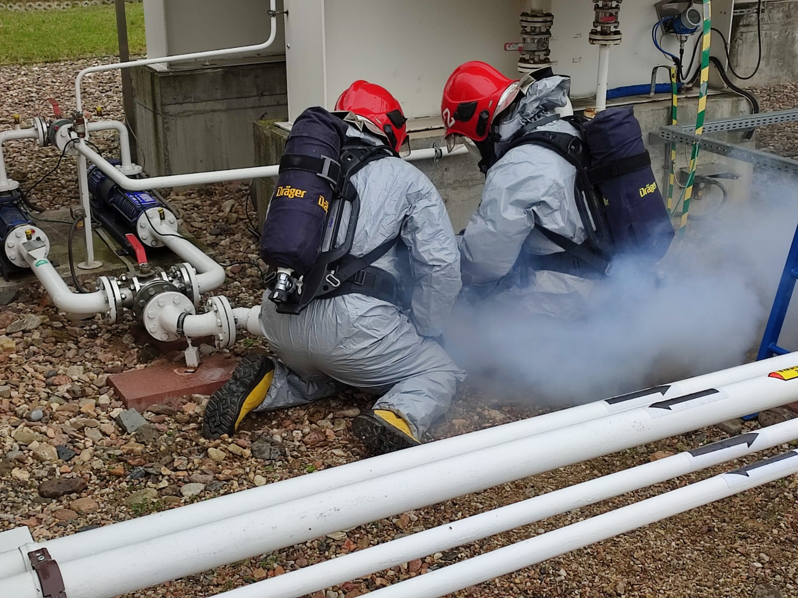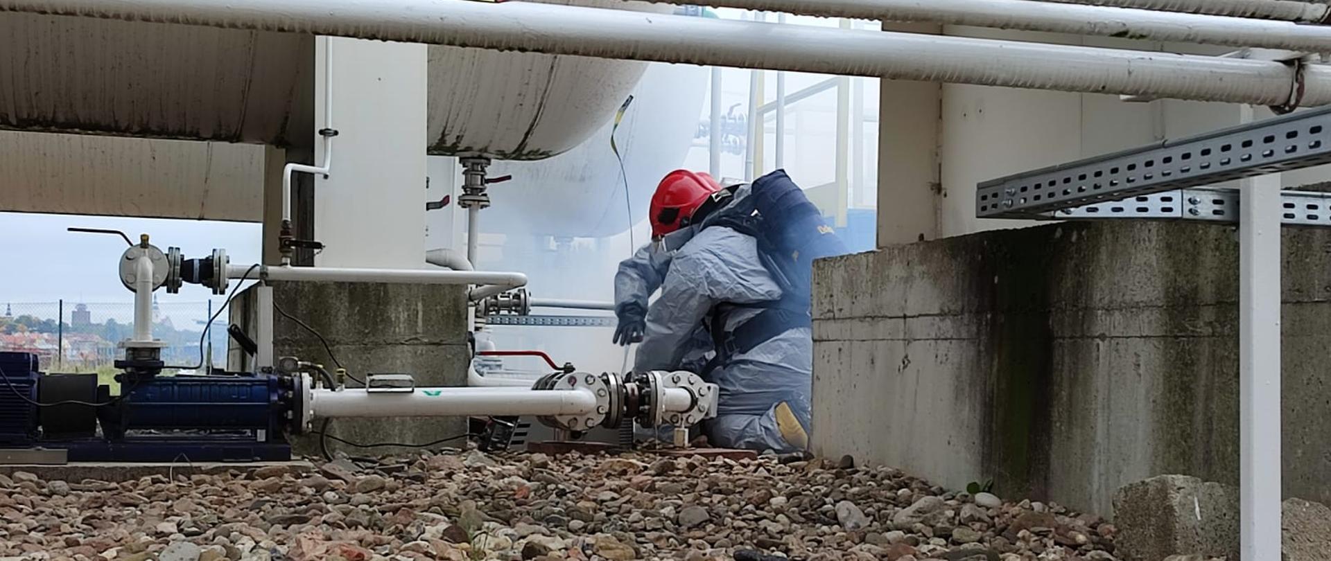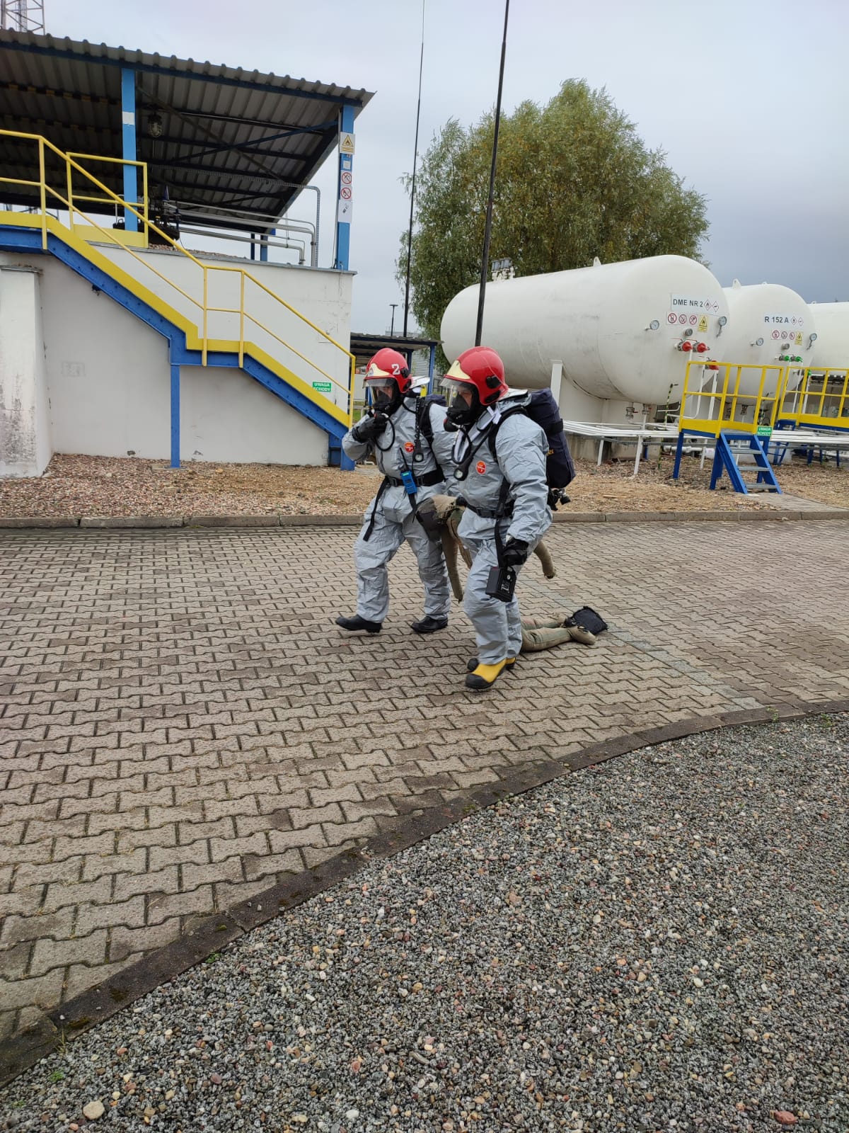 - drugi etap ćwiczeń polegał na uszczelnieniu instalacji przesyłowej zbiornika z substancją niebezpieczną, która w trakcie prowadzonych działań gaśniczych uległa rozszczelnieniu.