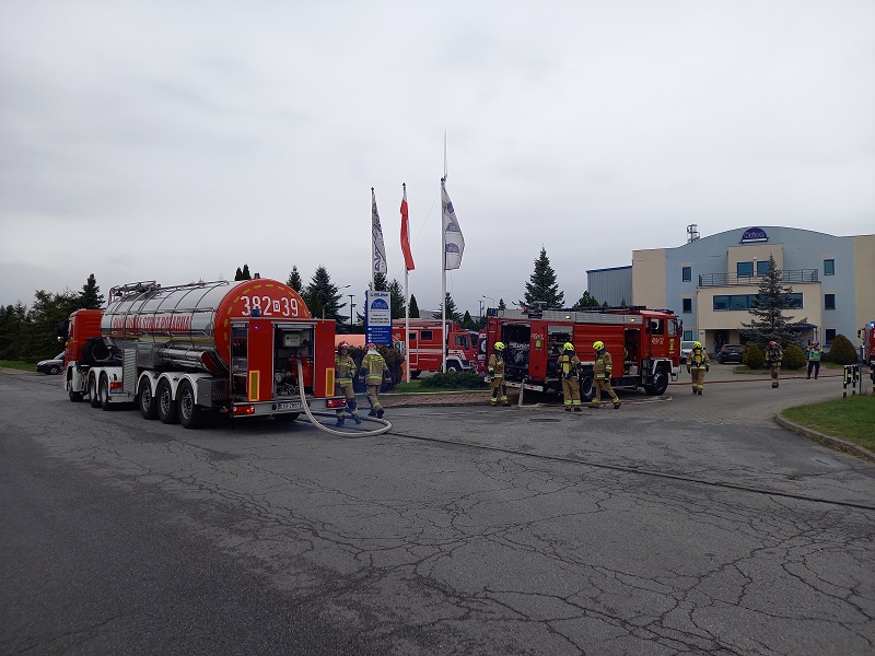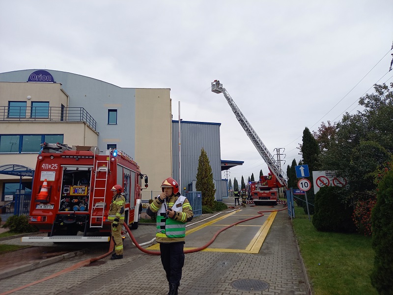 - pierwszy etap dotyczył prowadzenia akcji gaśniczej pożaru, który powstał w magazynie poprodukcyjnym, a następnie rozprzestrzenił się na dach głównej hali magazynowej,