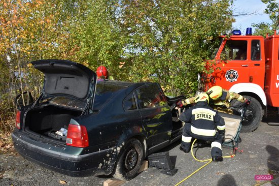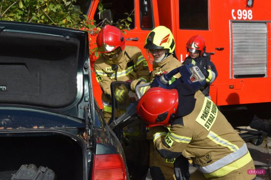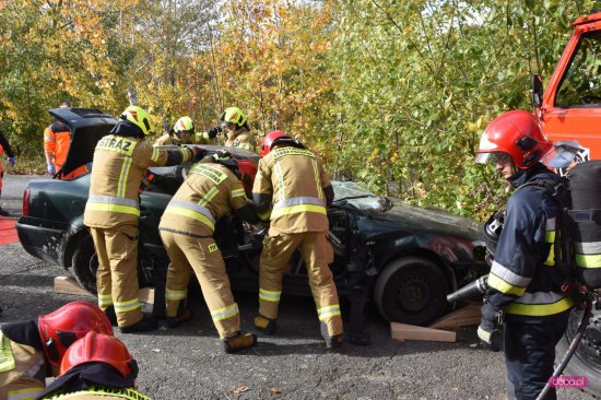 - pierwszy etap ćwiczeń dotyczył podjęcia działań ratowniczych oraz przeprowadzenia ewakuacji osób poszkodowanych uczestniczących w zderzeniu samochodu osobowego z samochodem gaśniczym,