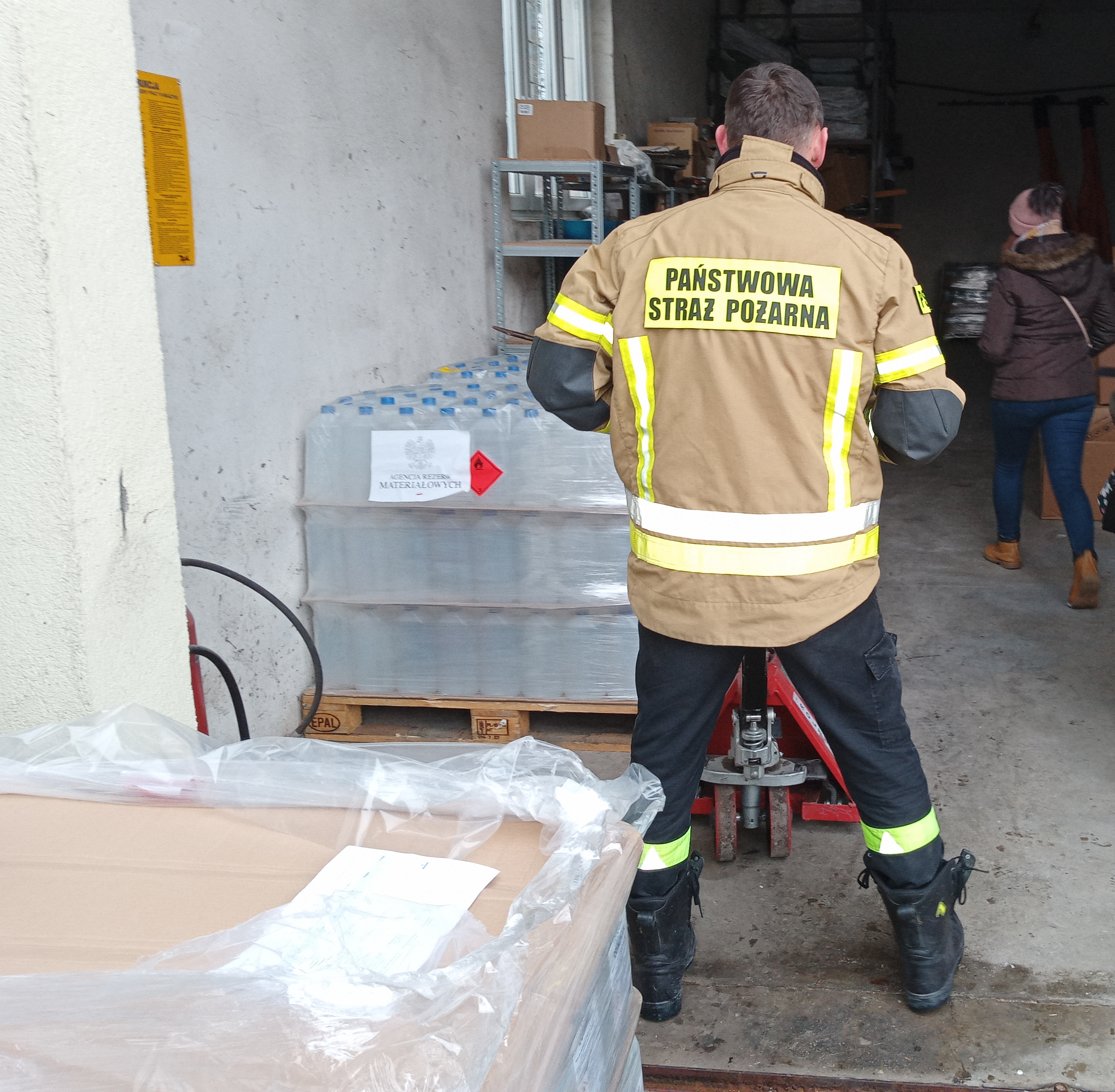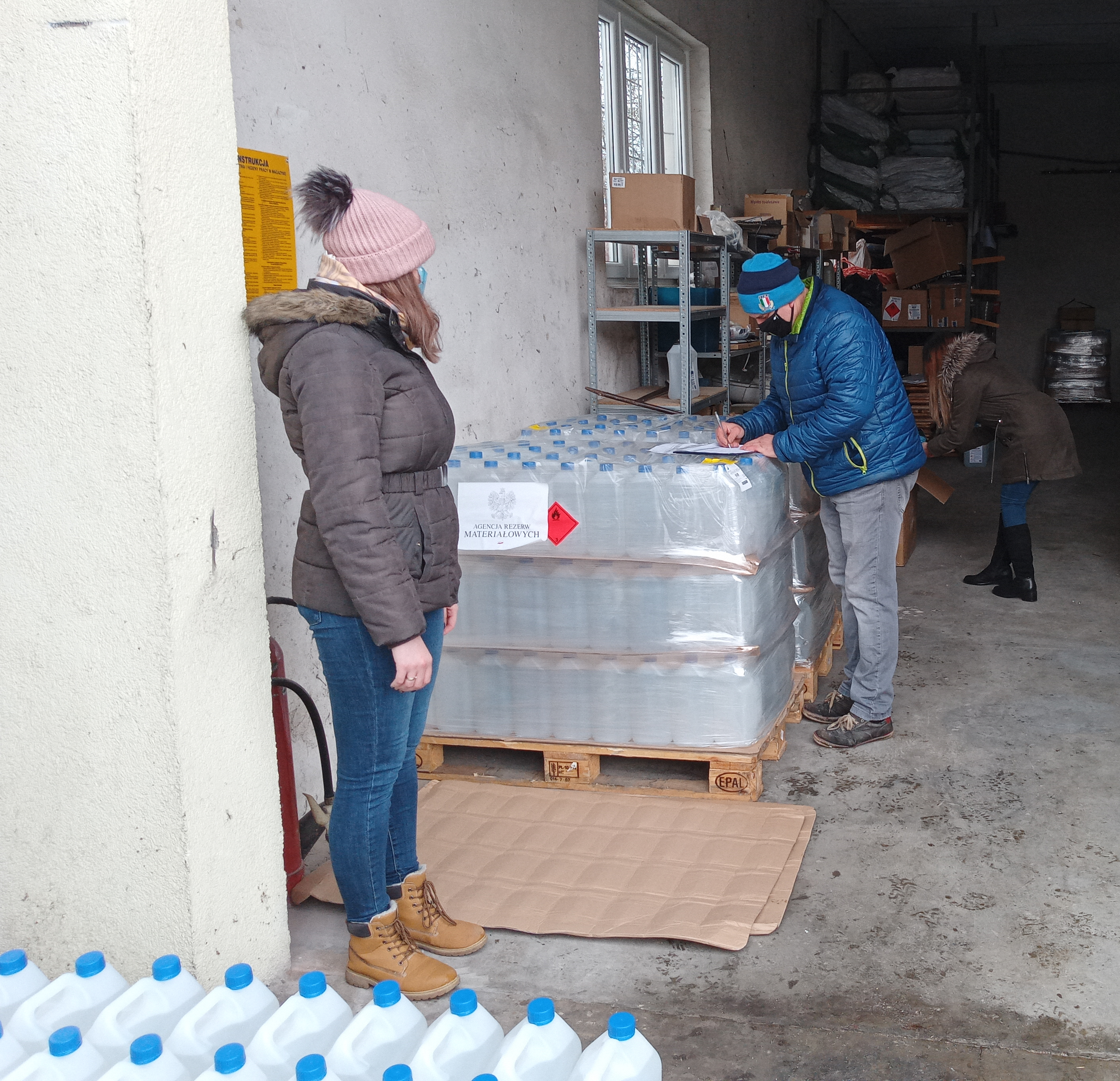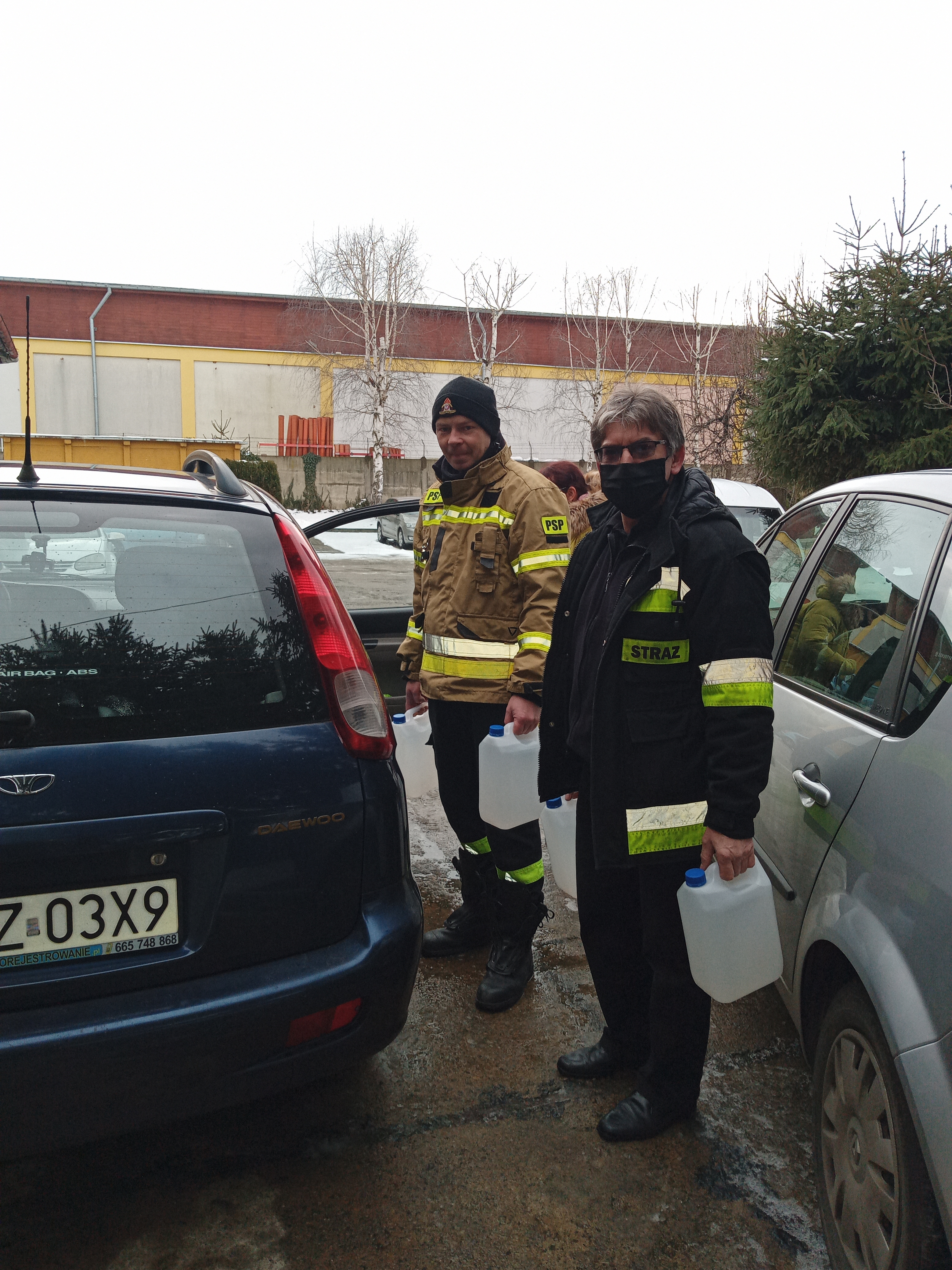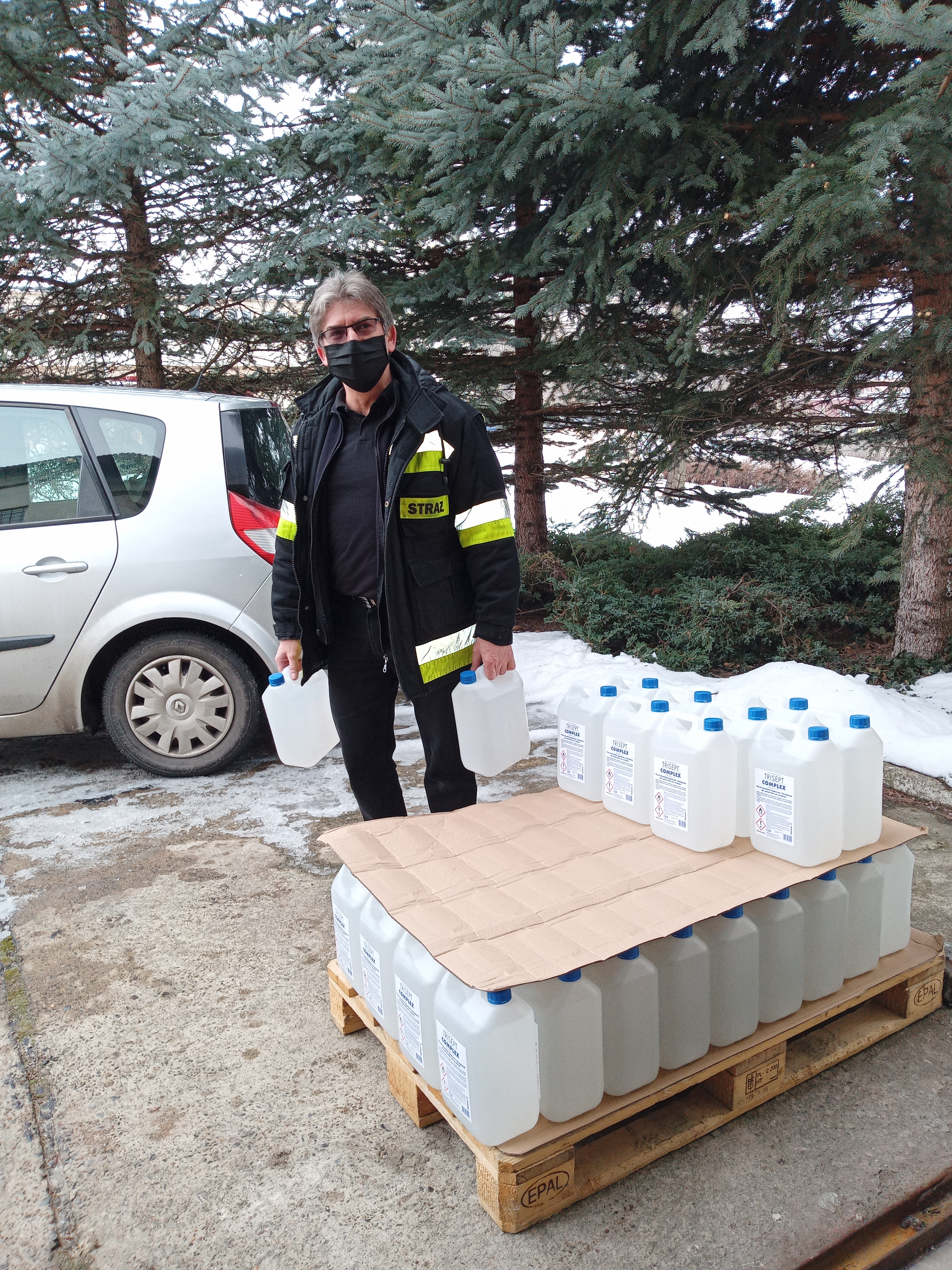 w Dzierżoniowie. W dystrybucję ww. środków zaangażowani byli funkcjonariusze PSP oraz pracownicy Starostwa Powiatowego. Łącznie do placówek oświaty zostało przekazane 1620 litrów płynu dezynfekującego oraz 3000 szt. maseczek ochronnych.
