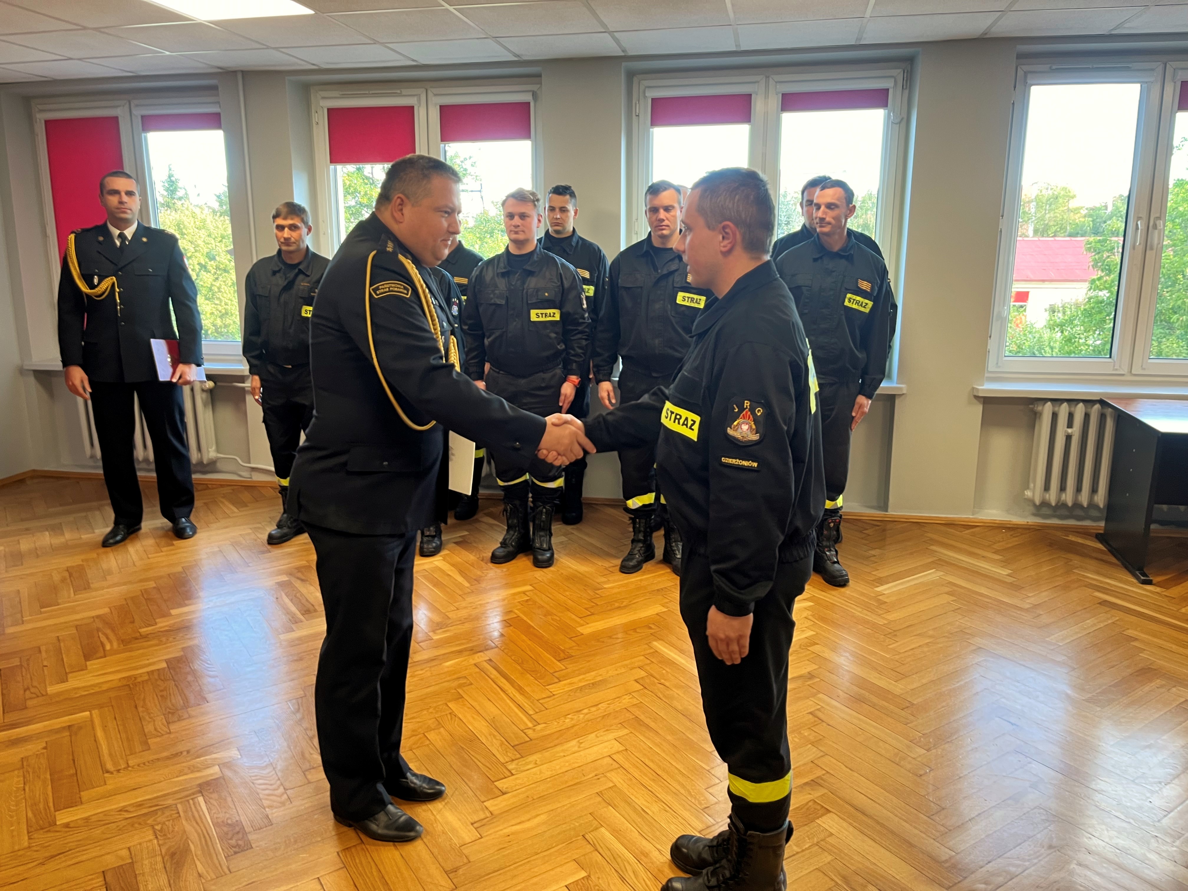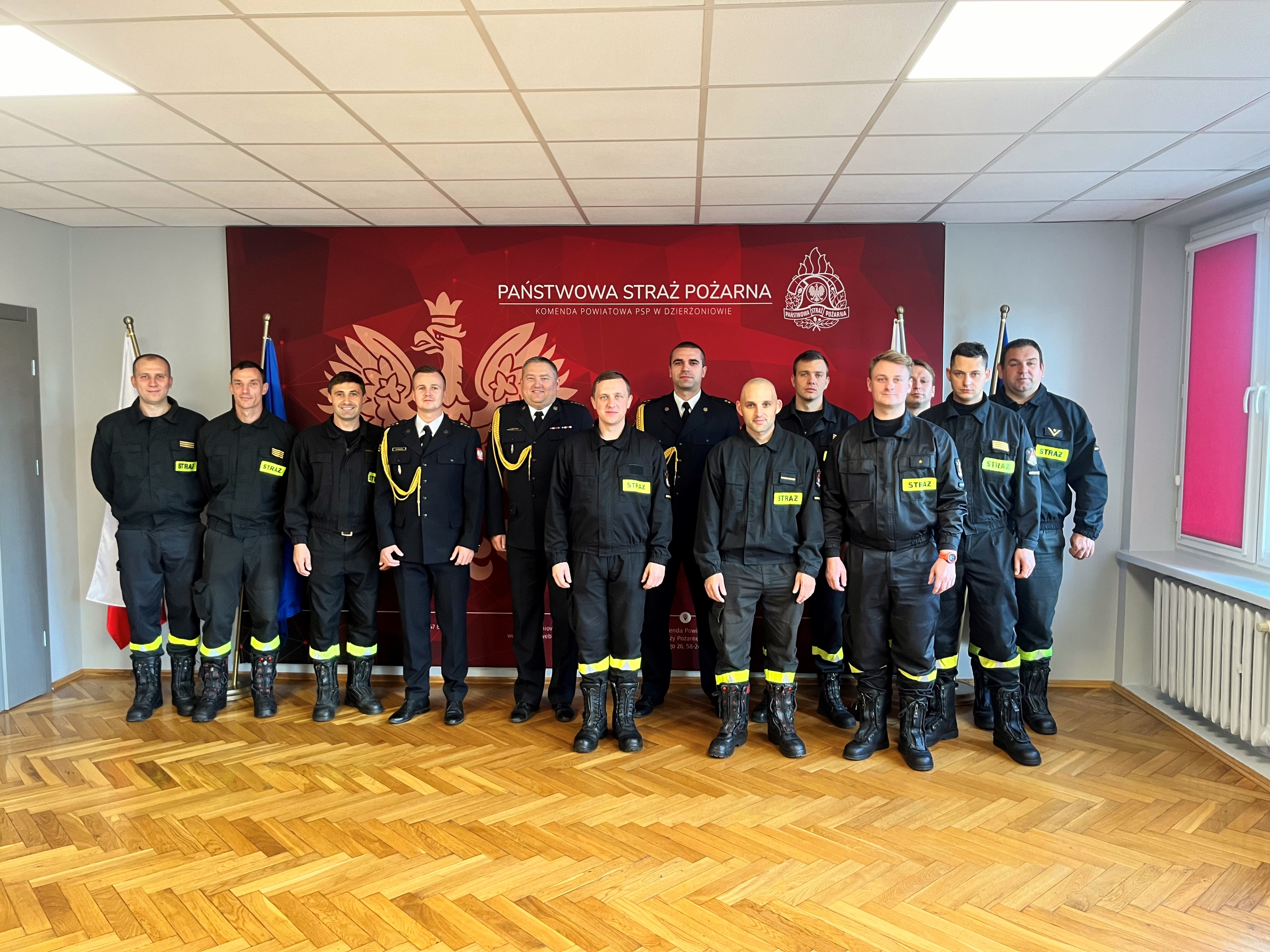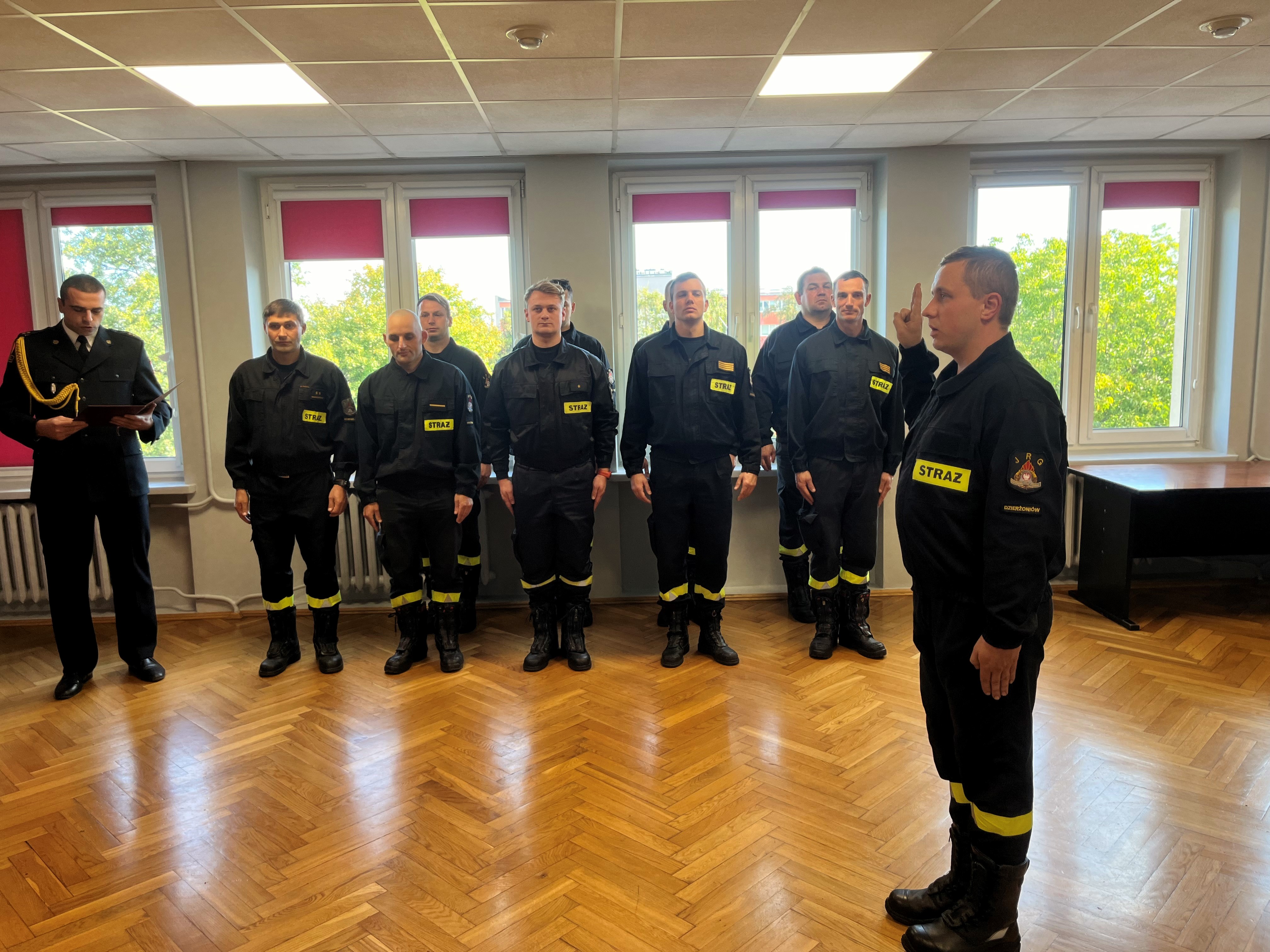 "Ja, obywatel Rzeczypospolitej Polskiej, świadom podejmowanych obowiązków strażaka, uroczyście ślubuję być ofiarnym i mężnym w ratowaniu zagrożonego życia ludzkiego i wszelkiego mienia - nawet z narażeniem życia. Wykonując powierzone mi zadania, ślubuję przestrzegać prawa, dyscypliny służbowej oraz wykonywać polecenia przełożonych. Ślubuję strzec tajemnic związanych ze służbą, a także honoru, godności i dobrego imienia służby oraz przestrzegać zasad etyki zawodowej."