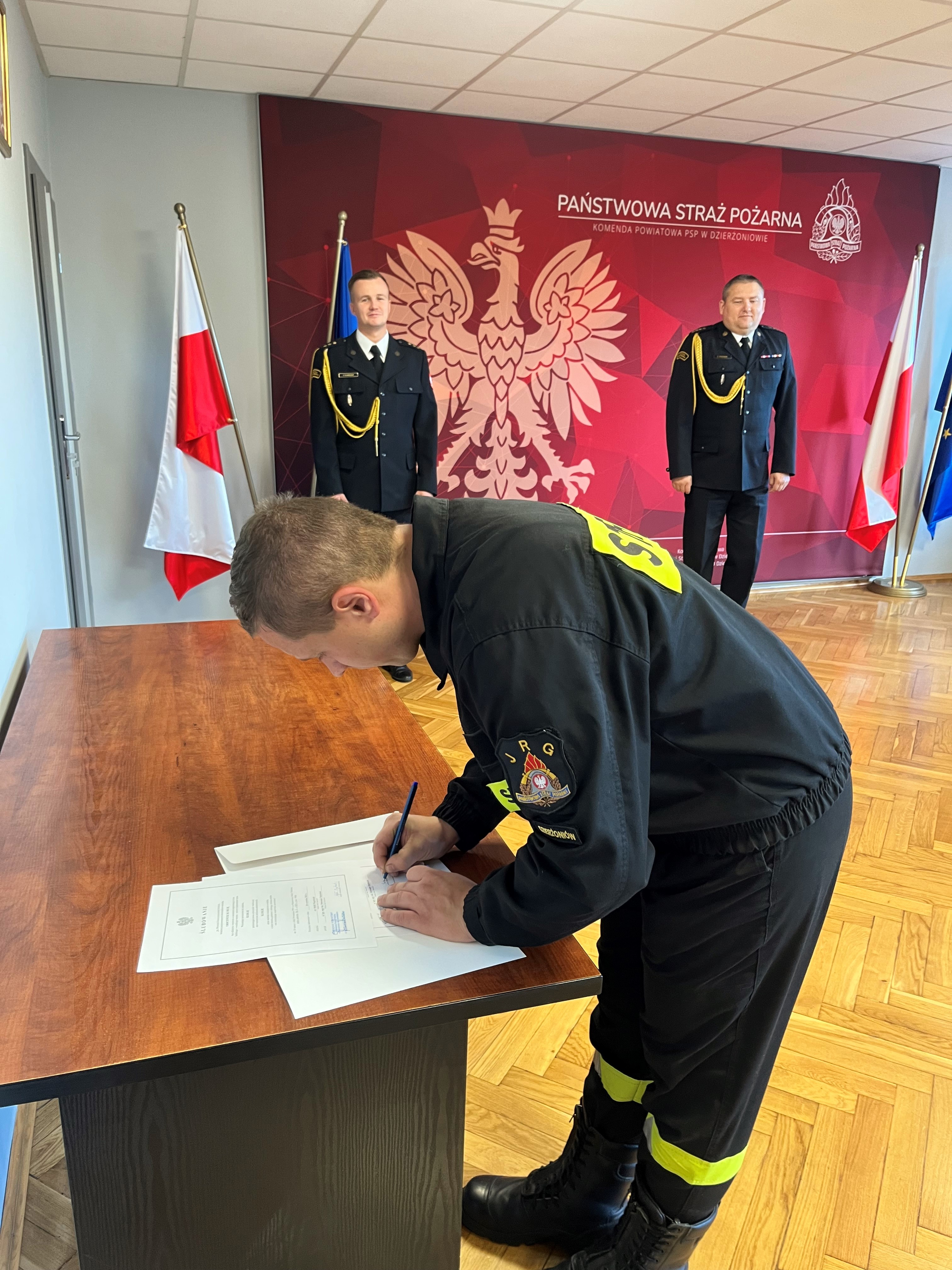 28 września 2022 r. w Komendzie Powiatowej Państwowej Straży Pożarnej w Dzierżoniowie odbyło się uroczyste ślubowanie strażaka Rafała Majchrzaka nowo przyjętego do służby przygotowawczej w KP PSP Dzierżoniów. Ślubowanie przyjął Komendant Powiatowy PSP w Dzierżoniowie – st. kpt. Sławomir Dudziński.