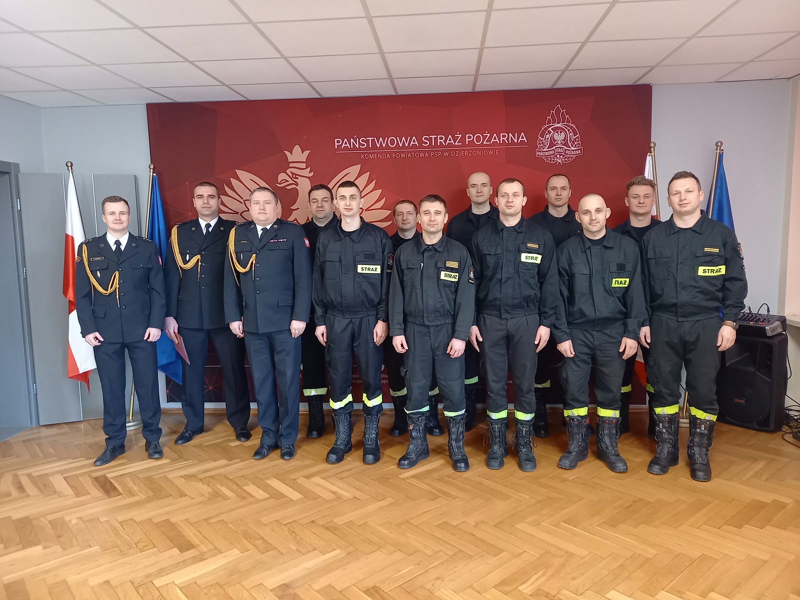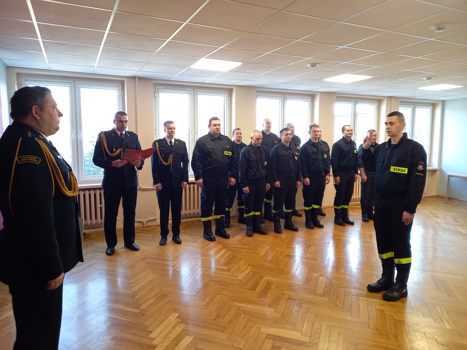 "Ja, obywatel Rzeczypospolitej Polskiej, świadom podejmowanych obowiązków strażaka, uroczyście ślubuję być ofiarnym i mężnym w ratowaniu zagrożonego życia ludzkiego i wszelkiego mienia - nawet z narażeniem życia. Wykonując powierzone mi zadania, ślubuję przestrzegać prawa, dyscypliny służbowej oraz wykonywać polecenia przełożonych. Ślubuję strzec tajemnic związanych ze służbą, a także honoru, godności i dobrego imienia służby oraz przestrzegać zasad etyki zawodowej."