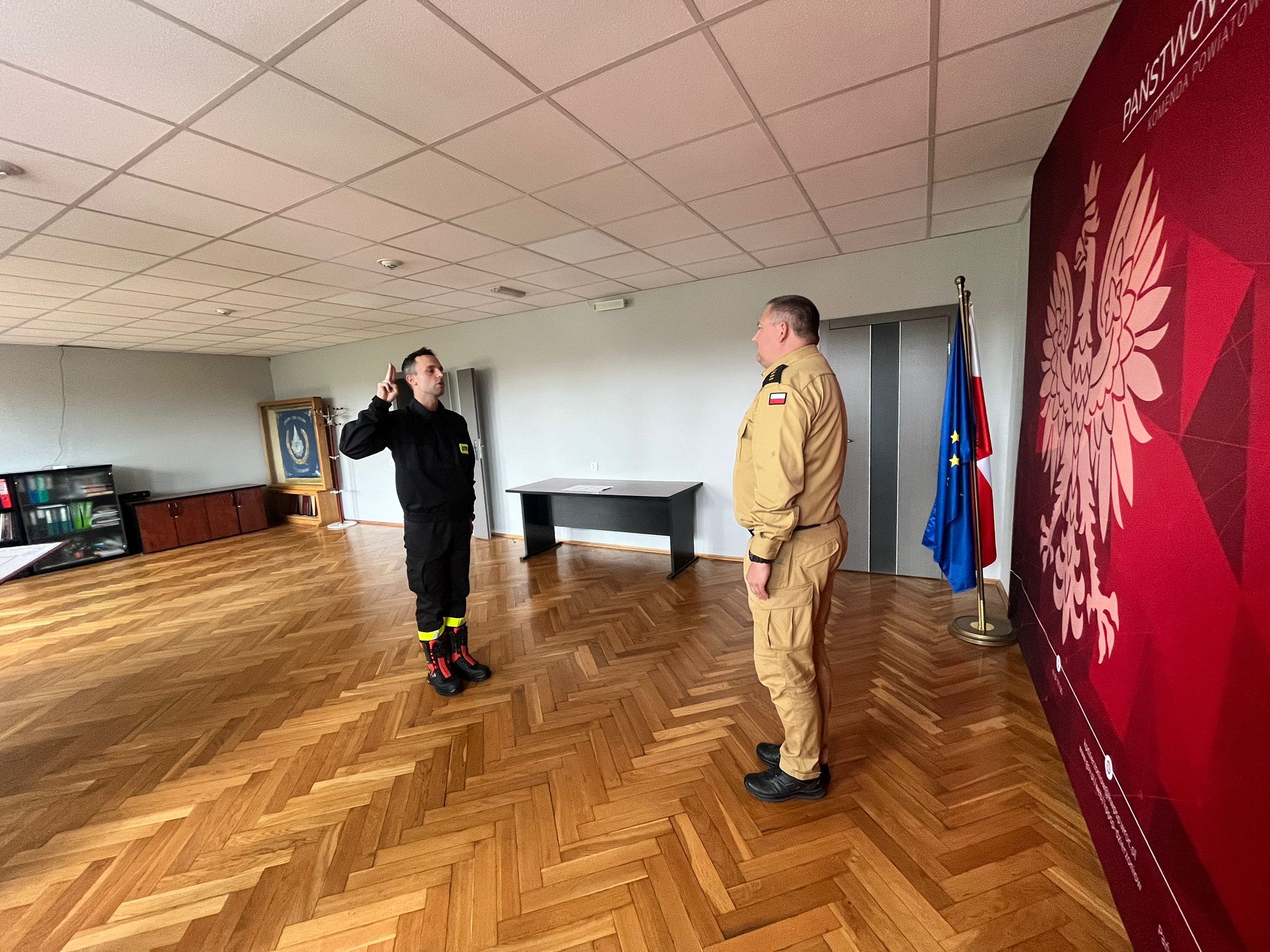 "Ja, obywatel Rzeczypospolitej Polskiej, świadom podejmowanych obowiązków strażaka, uroczyście ślubuję być ofiarnym i mężnym w ratowaniu zagrożonego życia ludzkiego i wszelkiego mienia - nawet z narażeniem życia. Wykonując powierzone mi zadania, ślubuję przestrzegać prawa, dyscypliny służbowej oraz wykonywać polecenia przełożonych. Ślubuję strzec tajemnic związanych ze służbą, a także honoru, godności i dobrego imienia służby oraz przestrzegać zasad etyki zawodowej."