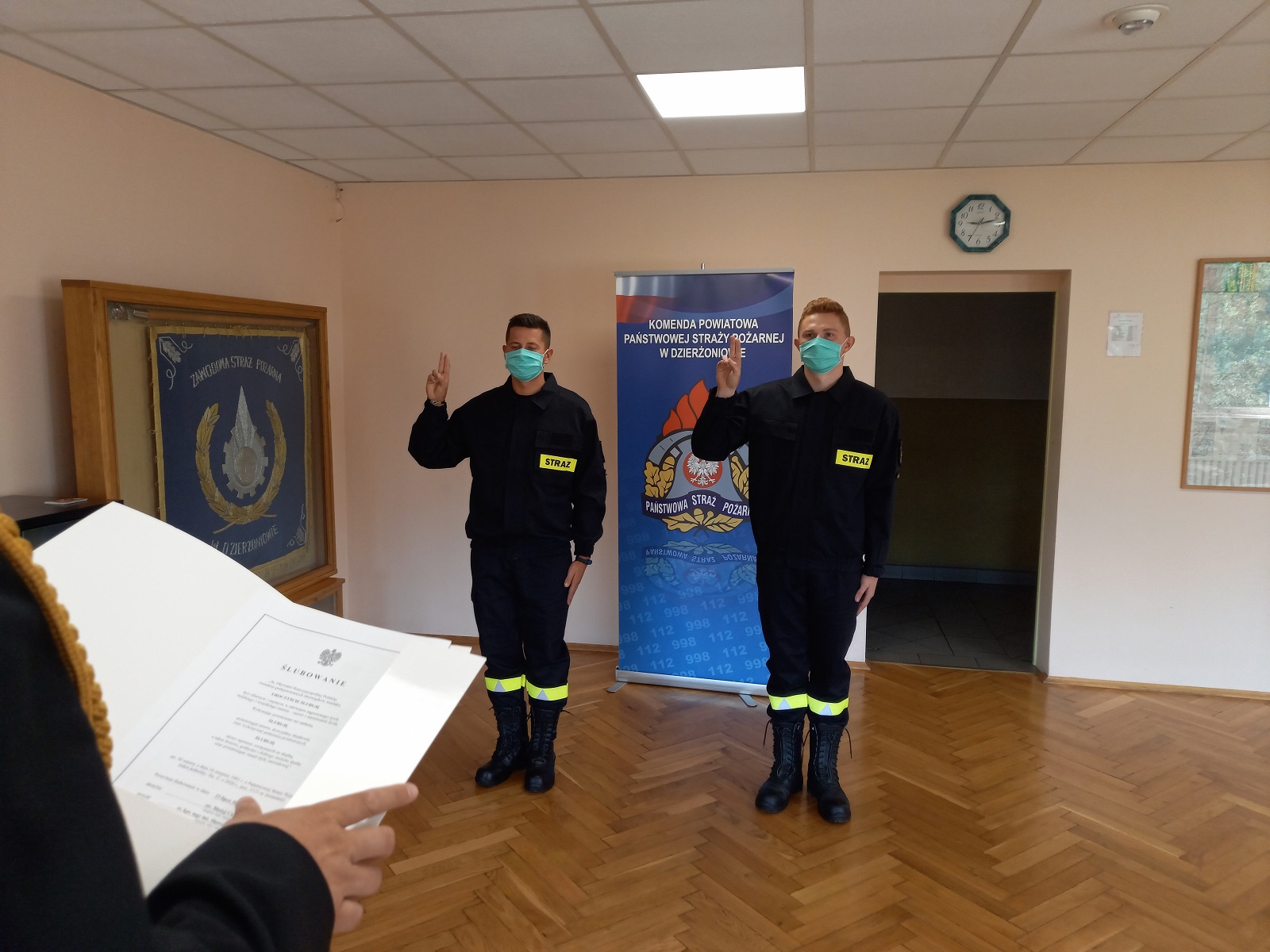 "Ja, obywatel Rzeczypospolitej Polskiej, świadom podejmowanych obowiązków strażaka, uroczyście ślubuję być ofiarnym i mężnym w ratowaniu zagrożonego życia ludzkiego i wszelkiego mienia - nawet z narażeniem życia. Wykonując powierzone mi zadania, ślubuję przestrzegać prawa, dyscypliny służbowej oraz wykonywać polecenia przełożonych. Ślubuję strzec tajemnic związanych ze służbą, a także honoru, godności i dobrego imienia służby oraz przestrzegać zasad etyki zawodowej."