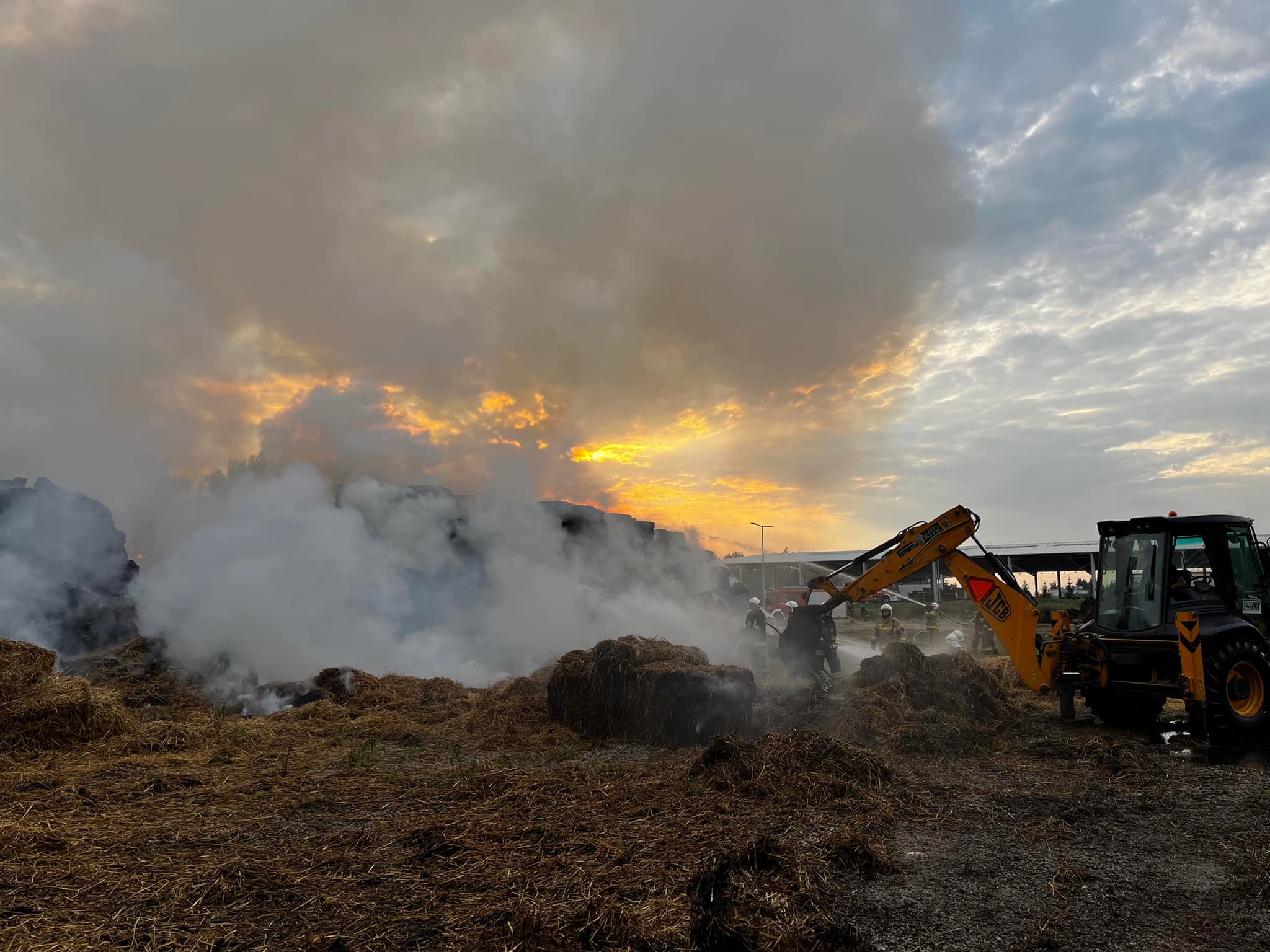 Po przybyciu na miejsce pierwszych zastępów okazało się, że ogniem objęta jest sterta słomy w kostkach oraz 5 pryzm kompostownika w zadaszonej hali. Pierwsze działania polegały na podaniu prądów wody na palący się kompost oraz w obronie pobliskich zabudowań. Dalsze działania polegały na podawaniu kolejnych prądów wody na stertę balotów. Właściciel obiektu zorganizował ciężki sprzęt do rozgarniania słomy ze sterty w celu jej skutecznego przelewania wodą. Pożar został opanowany, działania gaśnicze przy dogaszaniu mogą trwać kilka godzin.