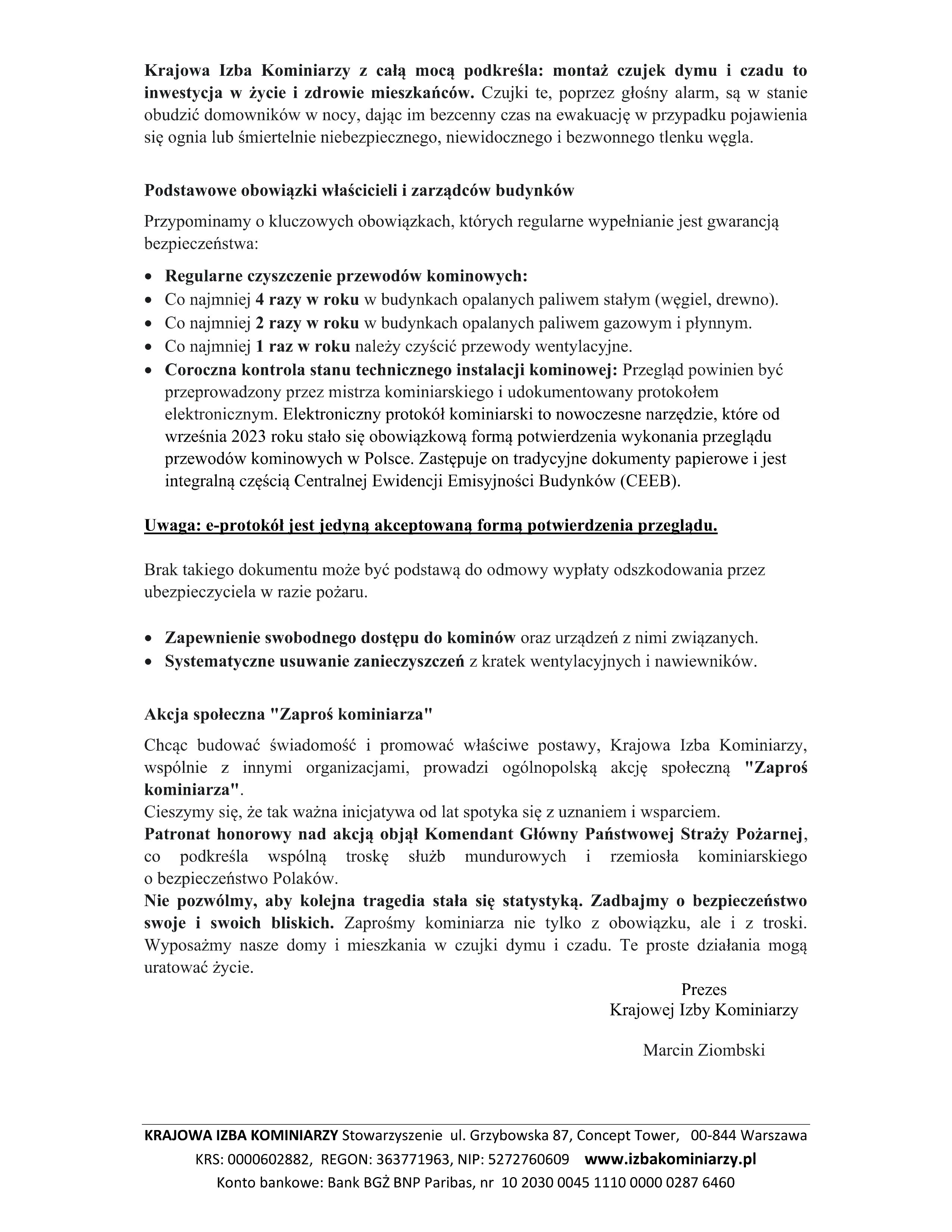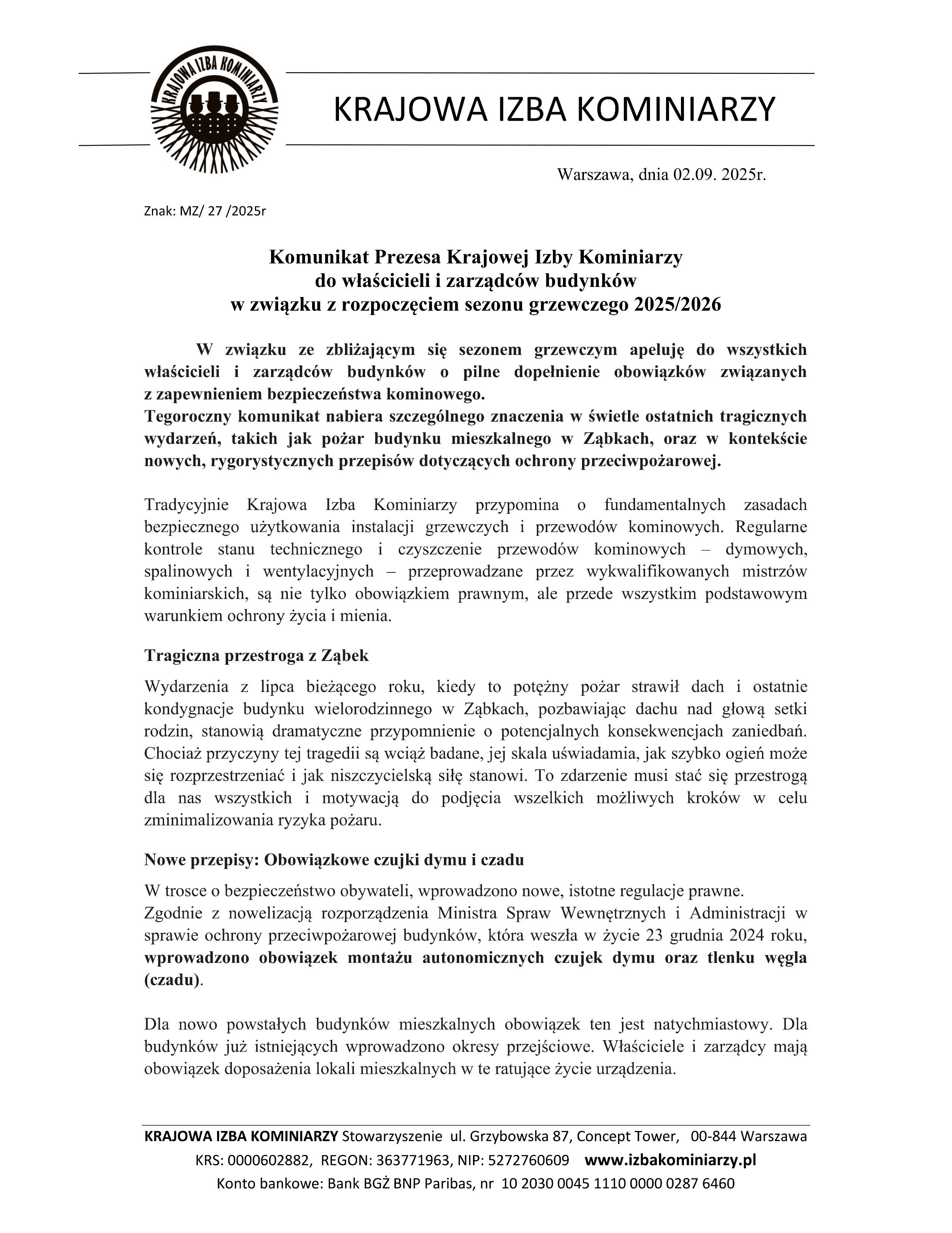 Szanowni Państwo, poniżej przedstawiamy Komunikat Prezesa Krajowej Izby Kominiarzy do właścicieli i zarządców budynków w związku z rozpoczęciem sezonu grzewczego 2025/2026.
