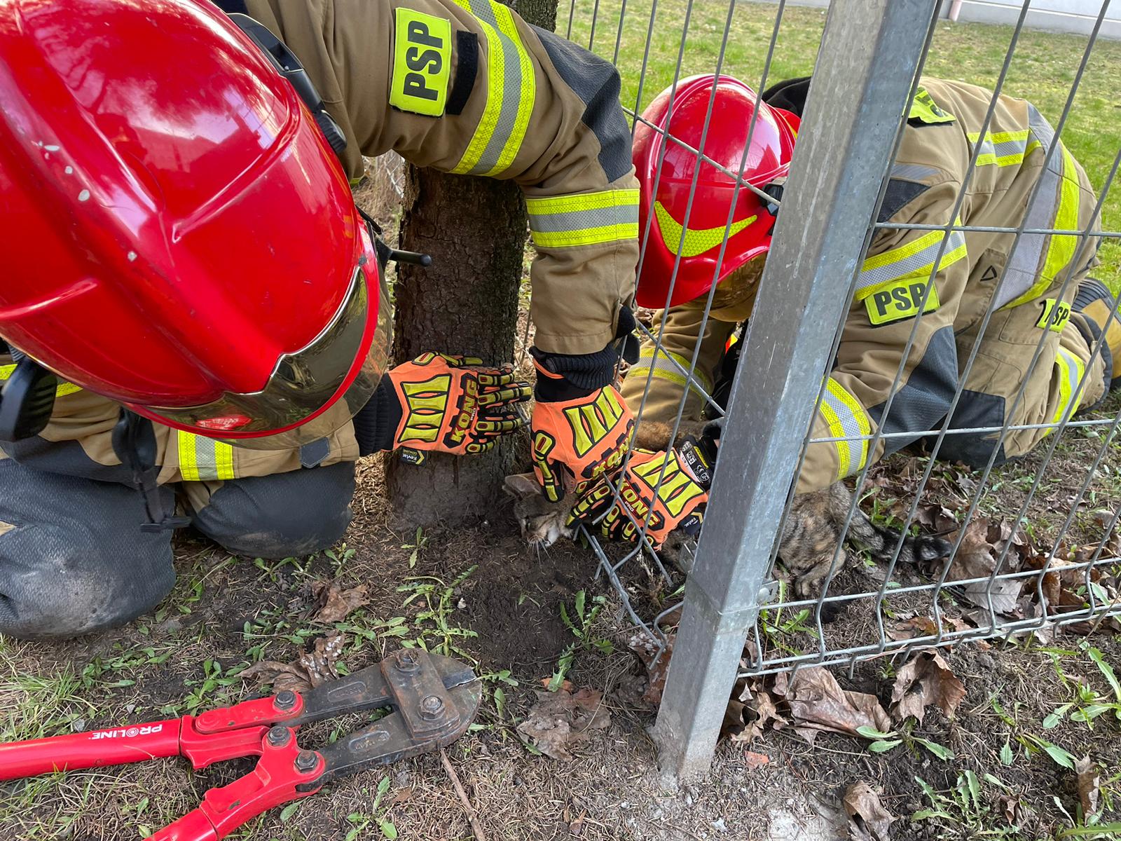 Około godz. 08:40 do Stanowiska Kierowania Komendanta Powiatowego PSP w Ełku wpłynęło zgłoszenie o kocie uwięzionym w ogrodzeniu przy ul. Armii Krajowej. Po dojeździe do wskazanego miejsca Kierujący Działaniem Ratowniczym potwierdził zdarzenie. Głowa przytomnego kota zaklinowana była pomiędzy metalowymi elementami ogrodzenia. Zabezpieczono miejsce zdarzenia i wykonano dostęp do zwierzęcia przy użyciu nożyc do cięcia prętów. Sympatyczny futrzak został przekazany przybyłym na miejsce zdarzenia funkcjonariuszom straży miejskiej, którzy przewieźli go do weterynarza.