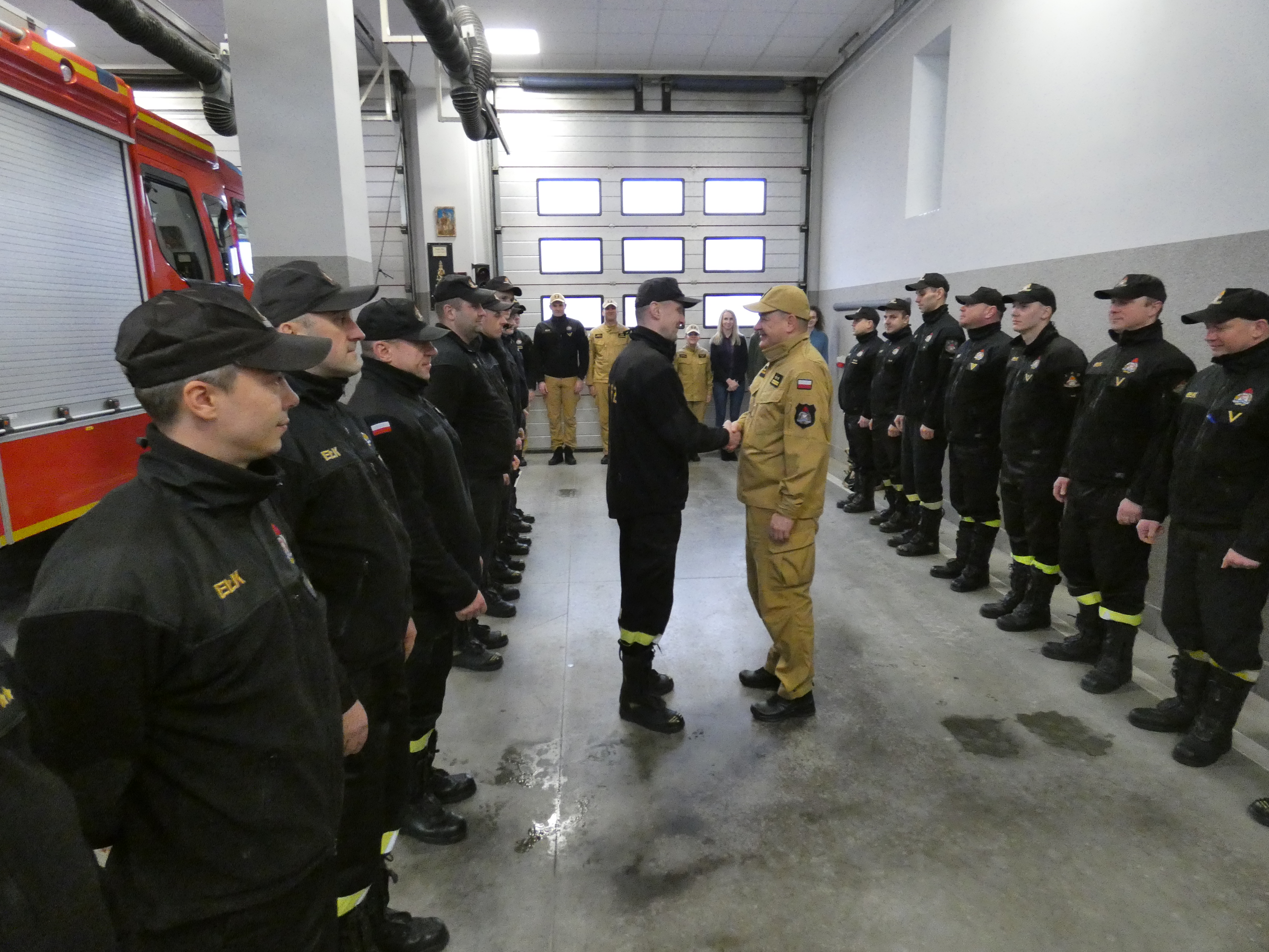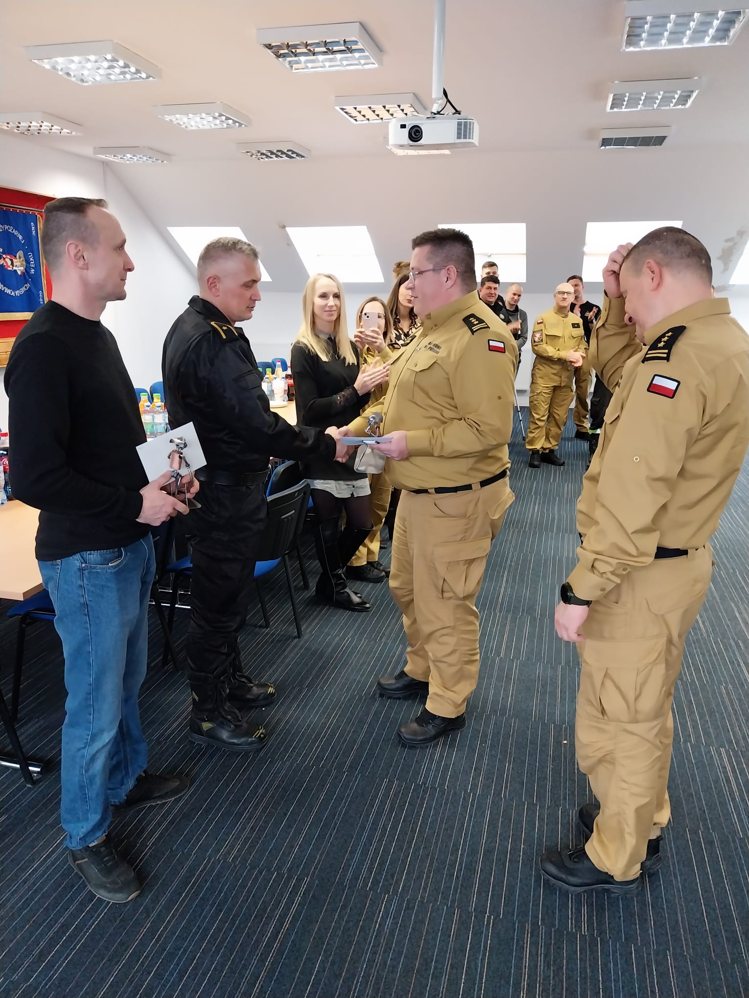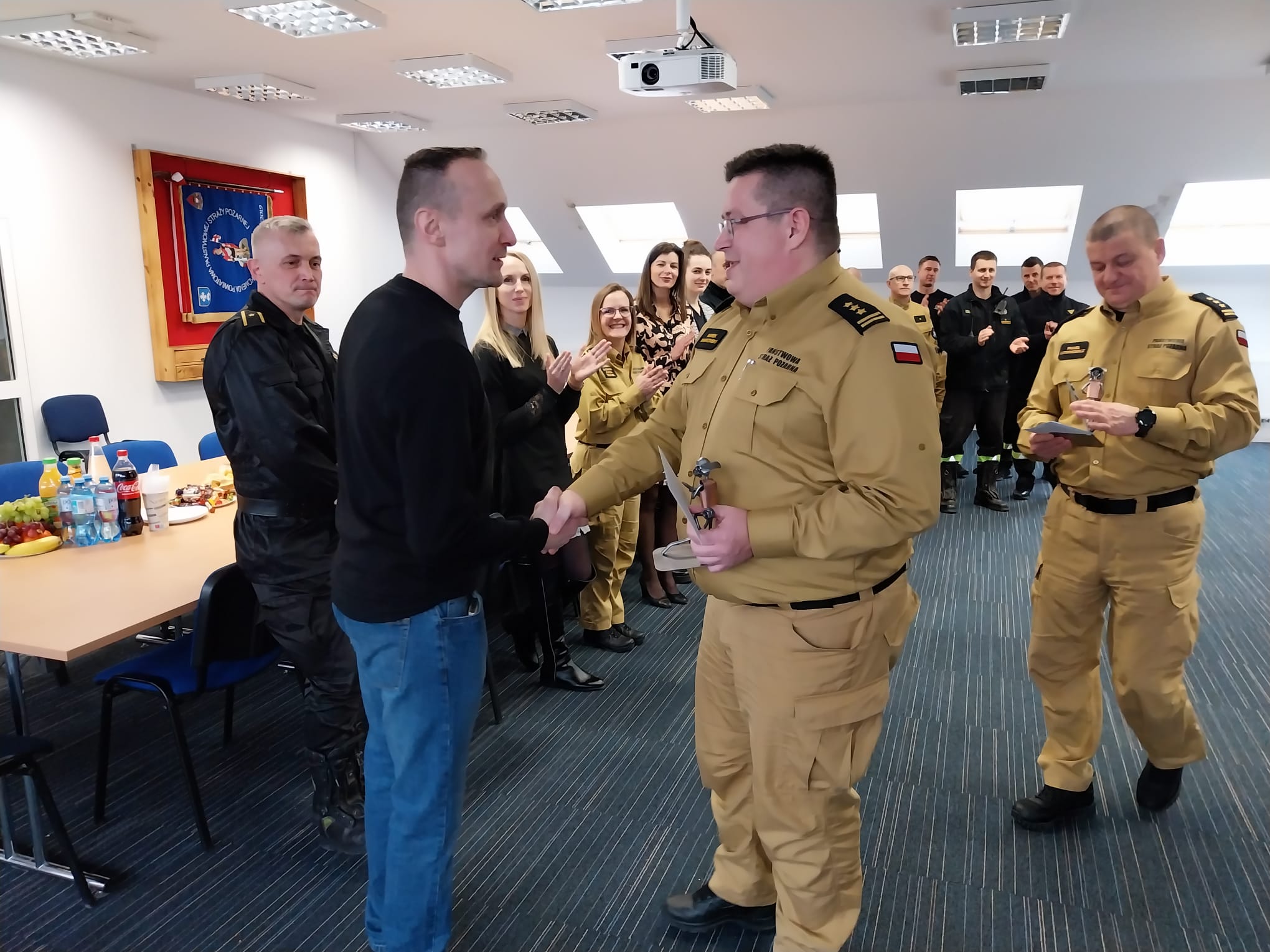 W dniu 28.02.2024 r. odbyła się uroczysta zmiana służby z okazji odejścia na zaopatrzenie emerytalne dwóch funkcjonariuszy KP PSP w Ełku. Po zmianie służby Komendant Powiatowy PSP w Ełku wraz z Zastępcą wręczyli odchodzącym strażakom pamiątkowe statuetki, a następnie świeżo upieczeni emeryci zaprosili całą załogę na słodki poczęstunek. Asp. Roman Bujnarowski pełnił służbę w systemie codziennym jako Kierownik sekcji ds kwatermistrzowsko - technicznych, natomiast st. ogn. Karol Witkowski w JRG Ełk służył w systemie zmianowym na stanowisku Starszego operatora sprzętu. Dziękujemy za lata wspólnej służby oraz życzymy dużo zdrowia i dalszych sukcesów w życiu prywatnym i zawodowym.