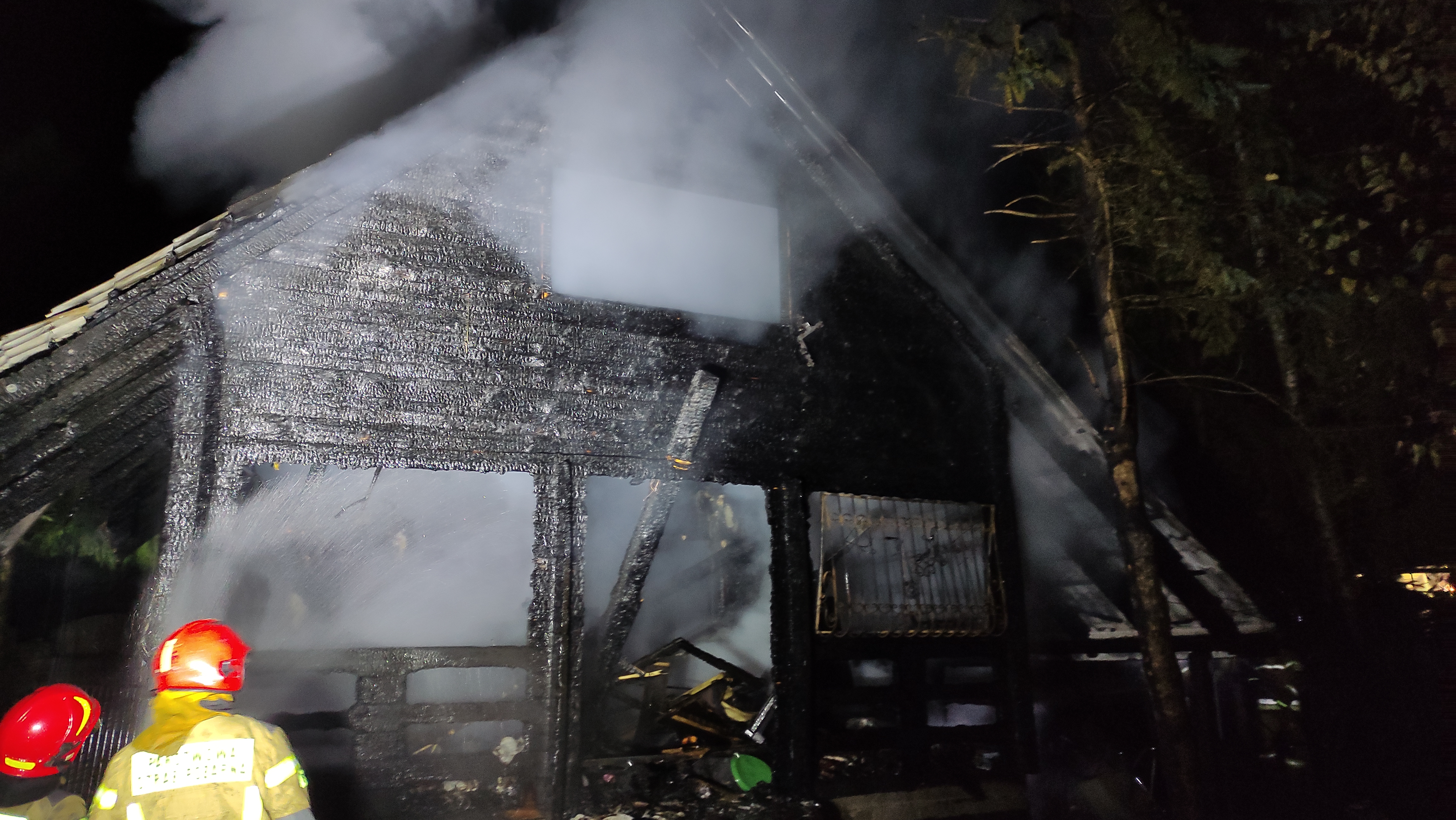 Na miejsce zdarzenia zadysponowano zastępy JRG Ełk oraz OSP Straduny. Dom letniskowy o konstrukcji drewnianej całkowicie objęty pożarem.