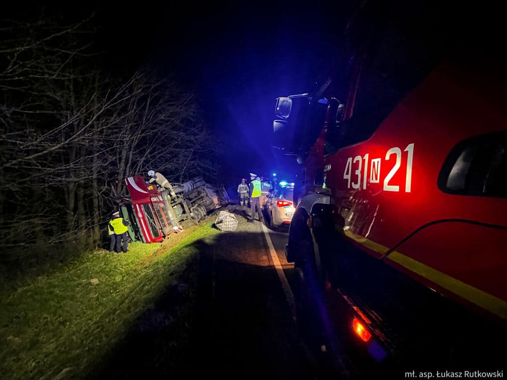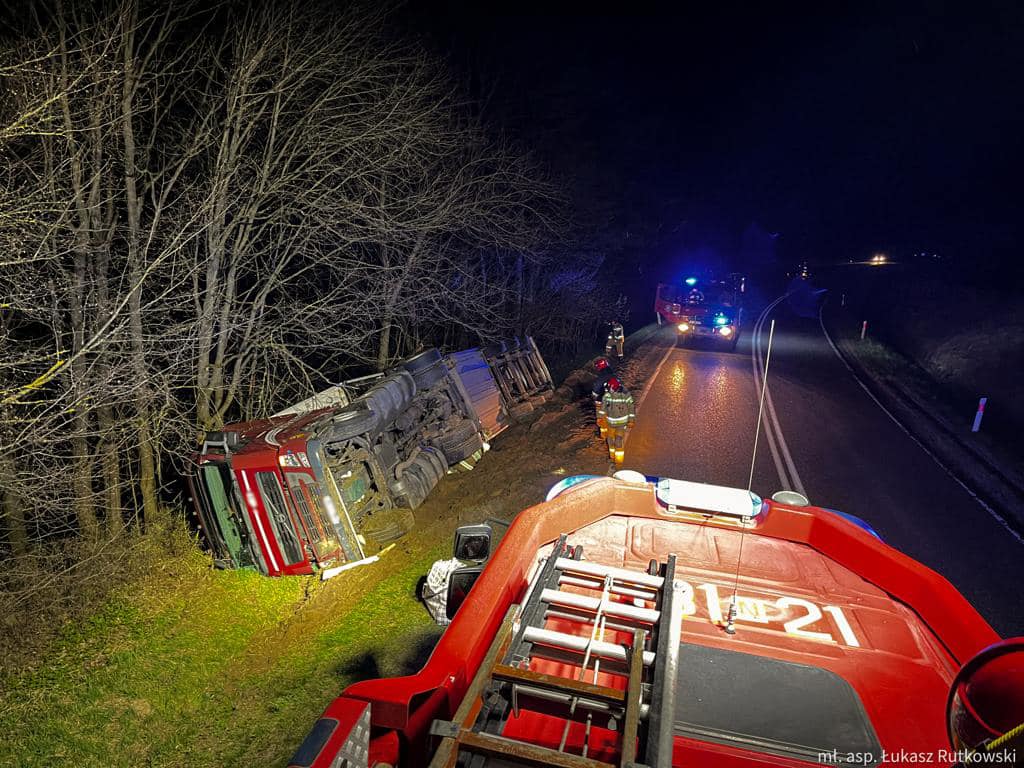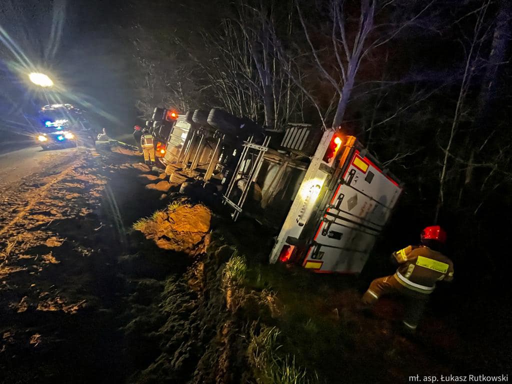 W dniu 13 kwietnia o godzinie 2:19 do SKKP w Ełku wpłynęło zgłoszenie o kolizji pojazdu ciężarowego w miejscowości Golubka, na trasie DK 16 Ełk – Augustów. Po dojeździe pierwszych zastępów na miejsce zdarzenia, Kierujący Działaniem Ratowniczym przekazał informację, iż ciągnik siodłowy z naczepą marki VOLVO znajduje się w przydrożnym rowie przewrócony na prawy bok. Kierowca pojazdu znajdował się w momencie dojazdu Jednostek Ochrony Przeciwpożarowej poza nim i nie potrzebował pomocy medycznej. Działania zastępów polegały na zabezpieczeniu i oświetleniu miejsca zdarzenia a także sorpcji płynów eksploatacyjnych, które wyciekły z auta. W trwającej łącznie 1 godzinę i 36 minut akcji uczestniczyły 3 zastępy Państwowej i Ochotniczej Straży Pożarnej oraz Policja, która wyjaśnia okoliczności zdarzenia.