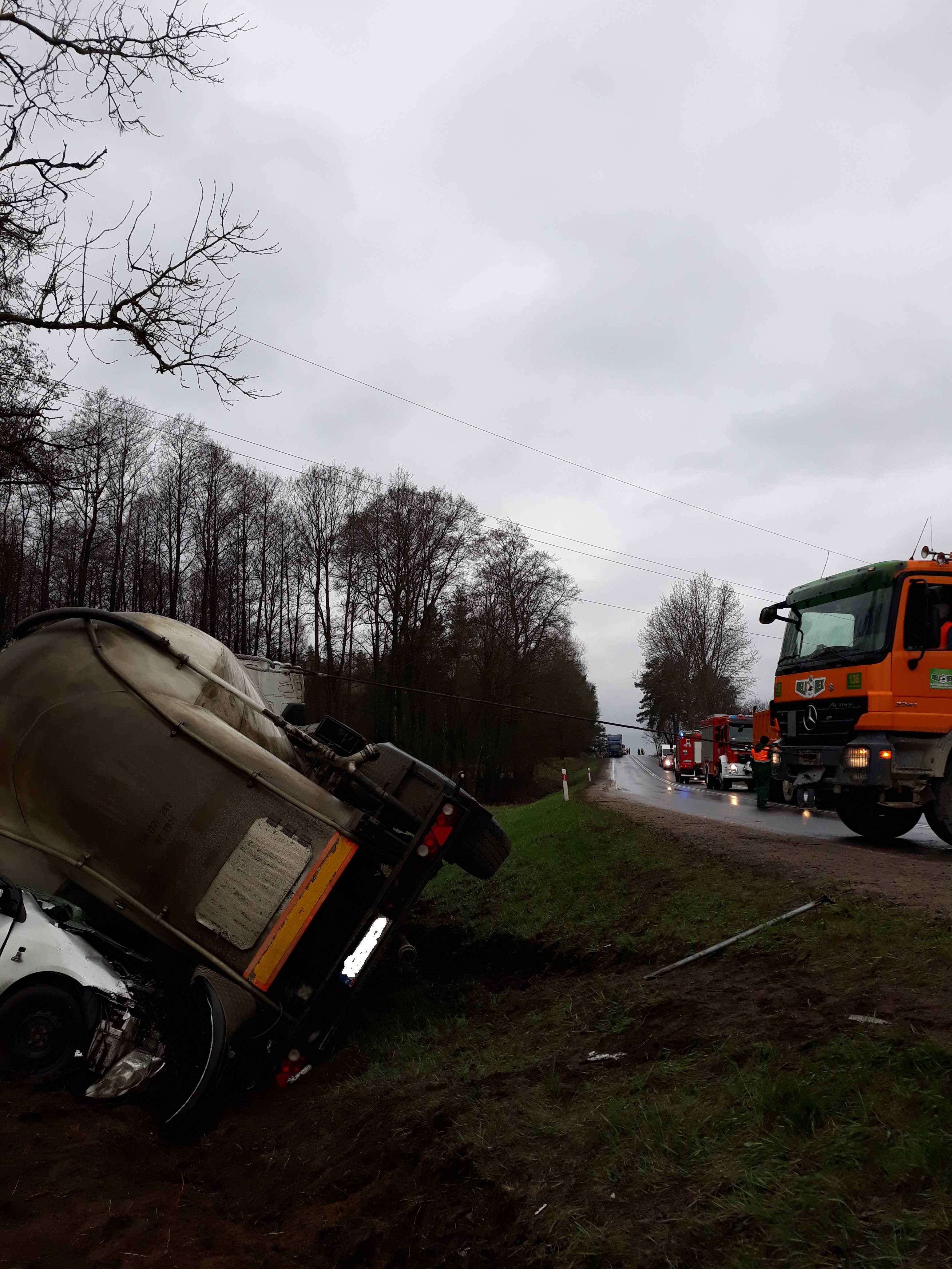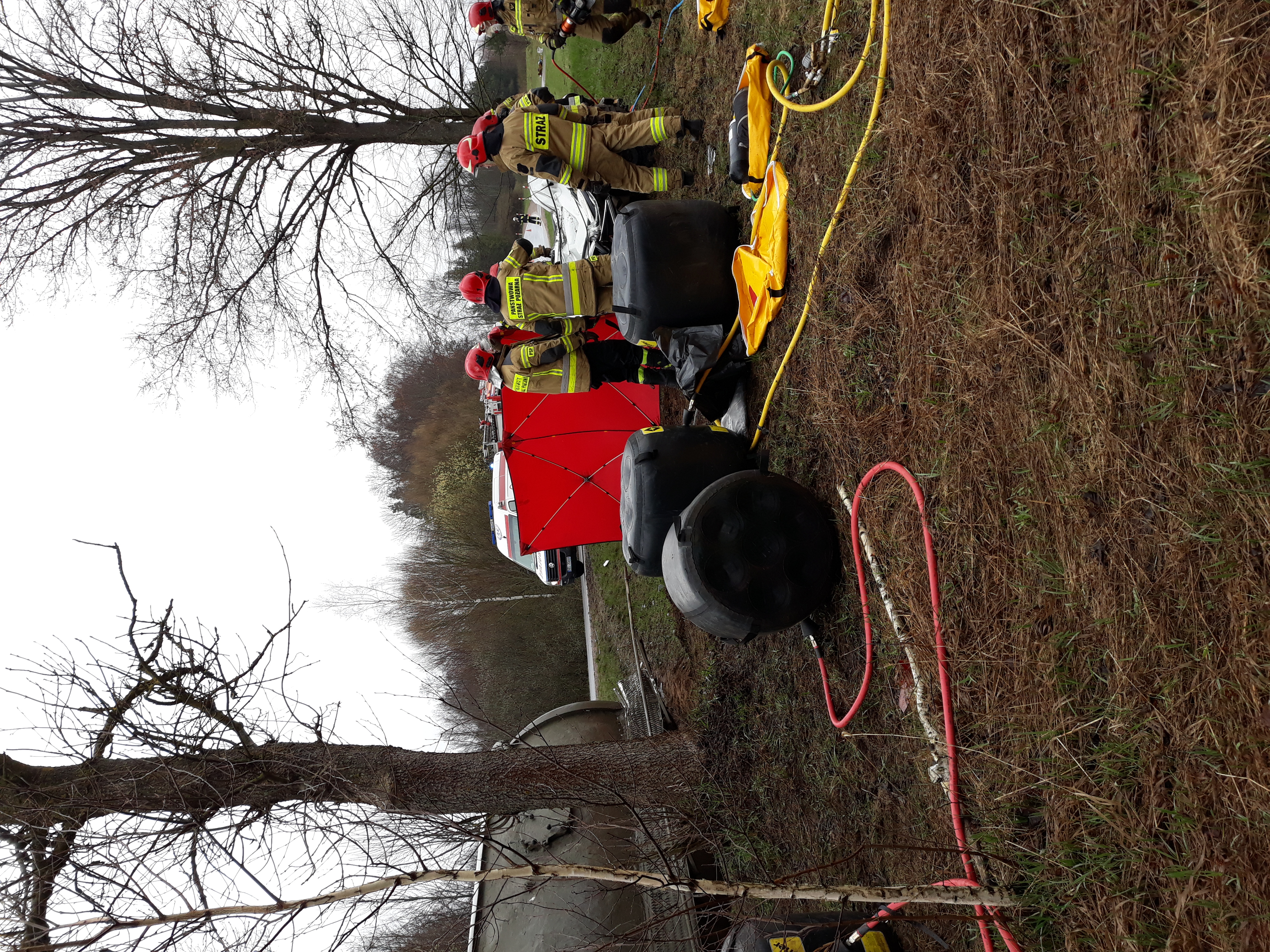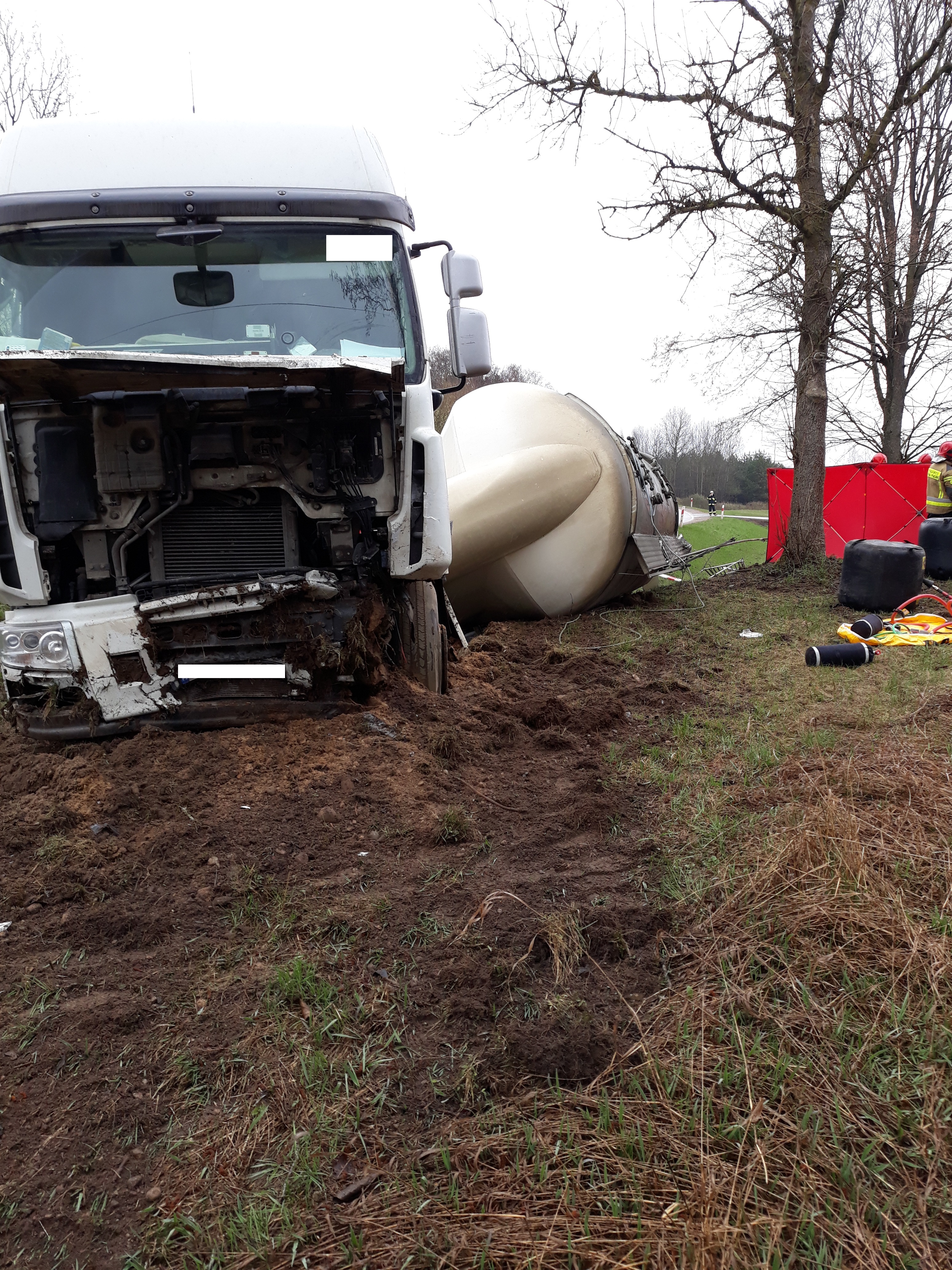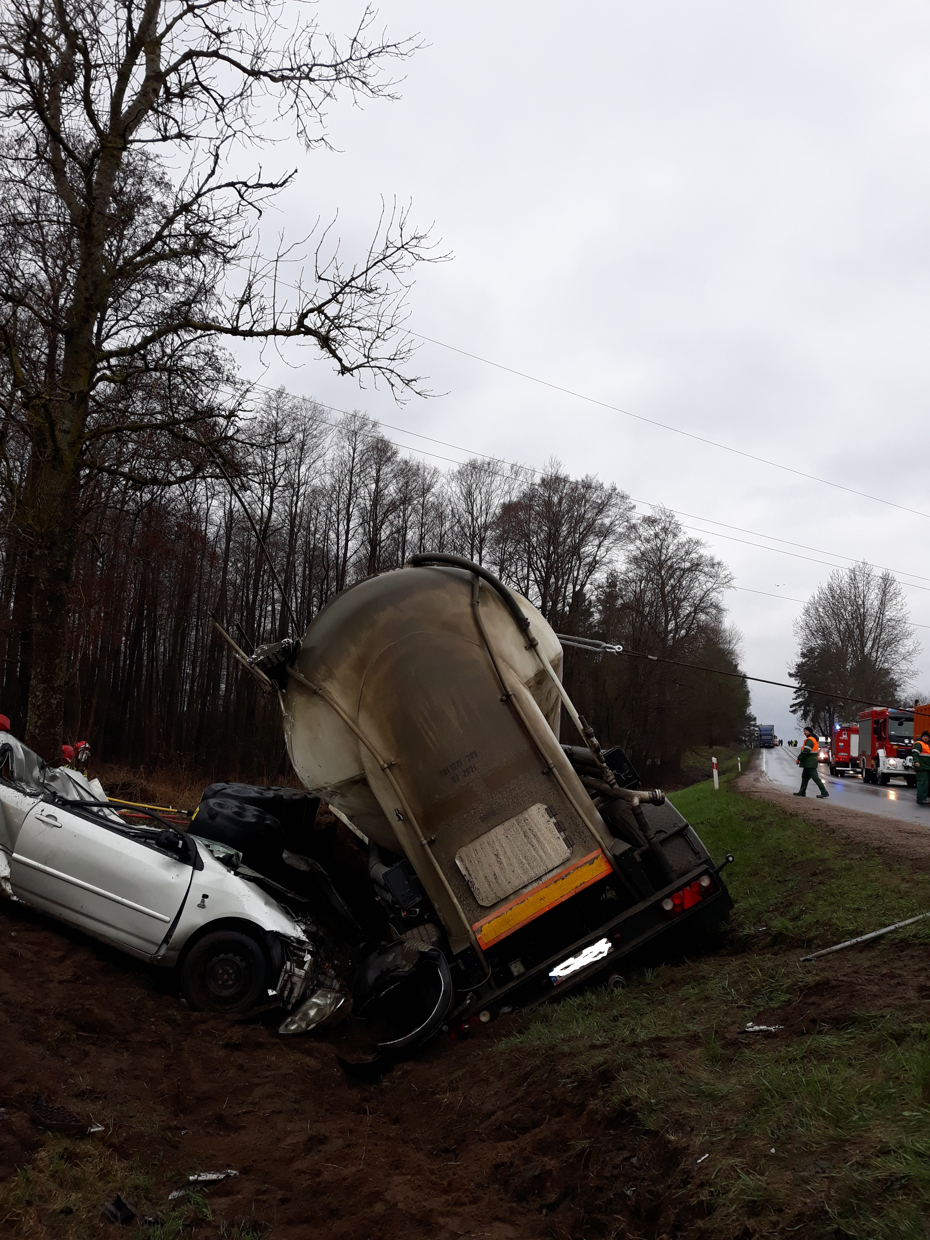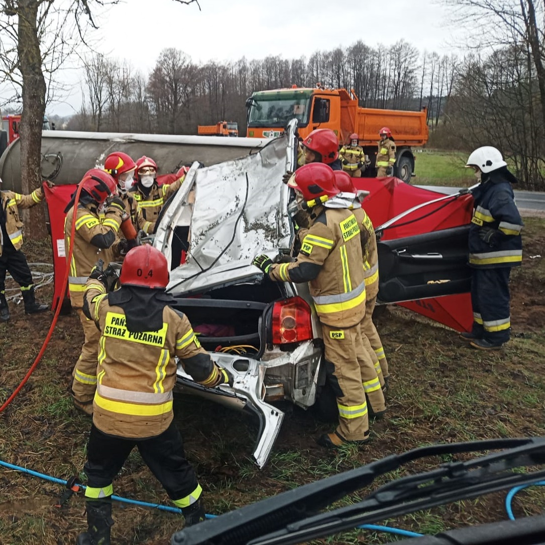 Strażacy z użyciem poduszek pneumatycznych wysokiego podnoszenia, narzędzi hydraulicznych, wyciągarek samochodowych oraz z wykorzystaniem samochodów ciężarowych-wywrotek z pobliskiej budowy, unieśli naczepę cysternę ważącą ponad 30 ton. Dzięki temu możliwe było wydobycie samochodu osobowego a następnie dotarcie i ewakuacja osoby znajdujacej się wewnątrz. Niestety osoba podróżująca samochodem osobowym nie przeżyła wypadku.