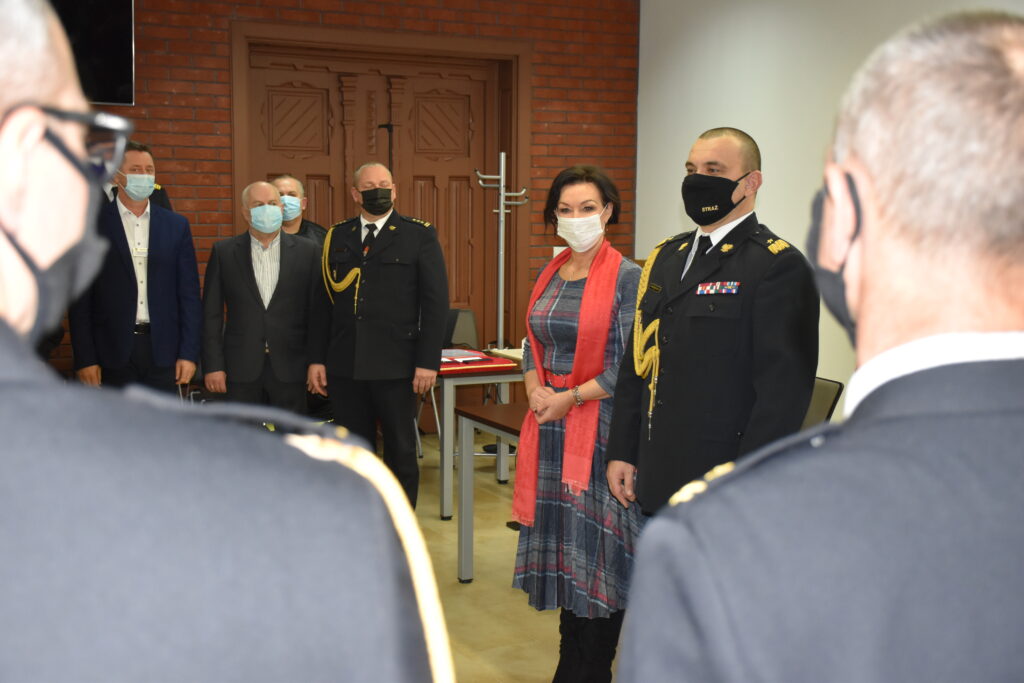 Podczas uroczystej zbiórki zostały wręczone Odznaki "Zasłużony dla Ochrony Przeciwpożarowej" oraz awanse w stopniach oficerskich funkcjonariuszom Państwowej Straży Pożarnej woj. warmińsko - mazurskiego.