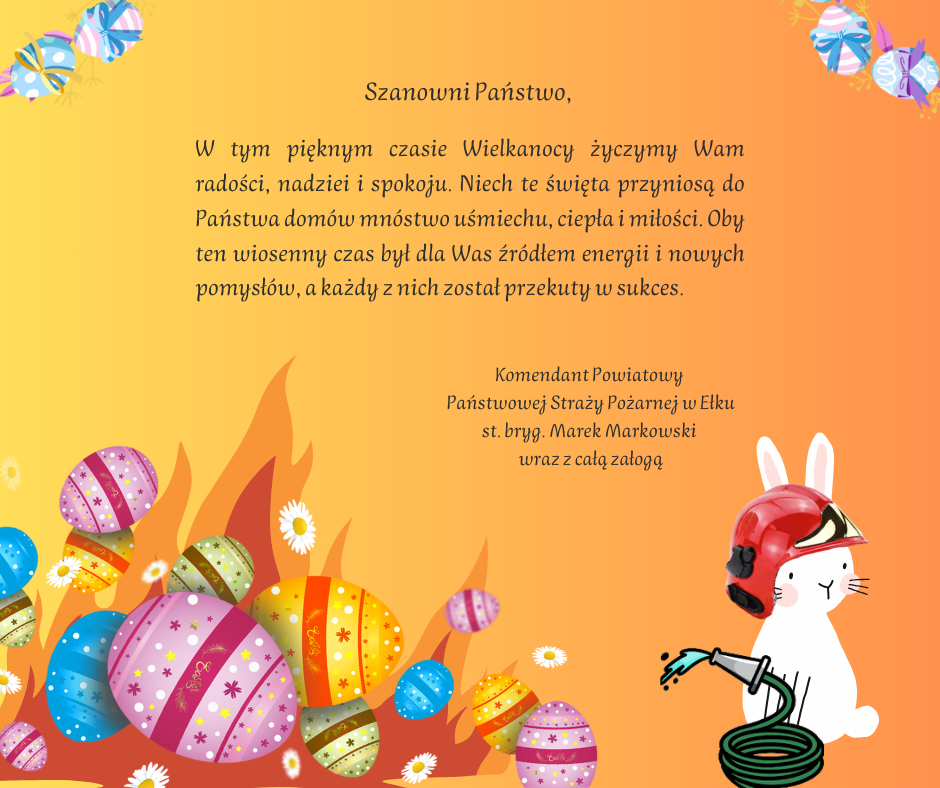 Komendant Powiatowy PSP w Ełku składa Państwu najserdeczniejsze życzenia z okazji Świąt Wielkanocnych: