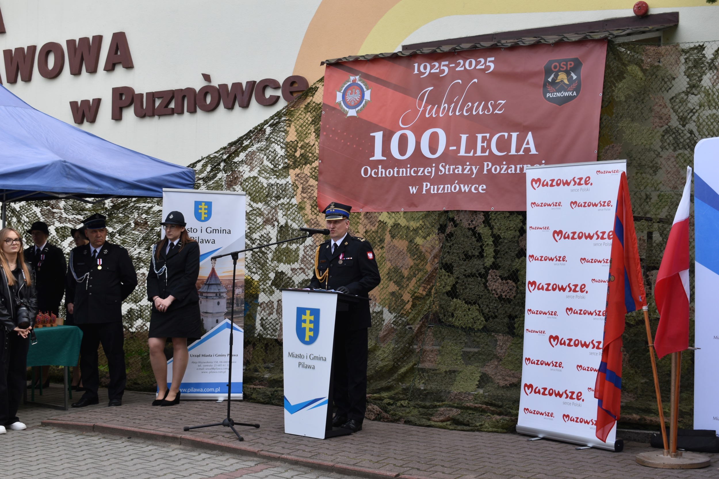 Prezes OSP Puznówka, druh Robert Rosłaniec, powitał zgromadzonych, po czym druhna Oktawia Grzelak przedstawiła rys historyczny jednostki, założonej w 1925 roku. Najważniejszym momentem uroczystości było pożegnanie starego sztandaru oraz prezentacja nowego, ufundowanego przez mieszkańców i przedsiębiorców z gminy Pilawa.