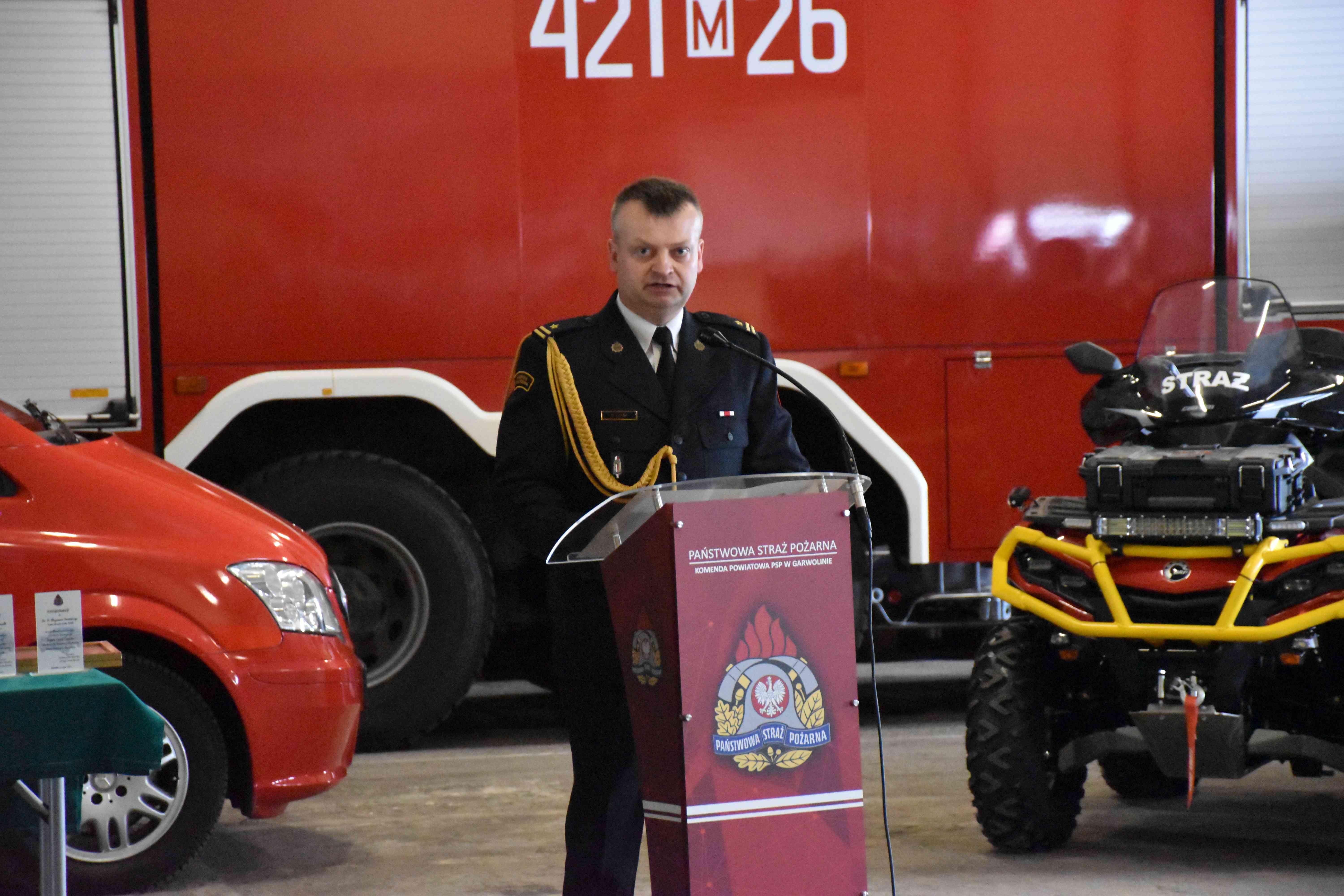 Mł. bryg. Tomasz Biernacki Komendant Powiatowy PSP w Garwolinie przywitał zaproszonych gości, przybliżył strukturę i sposób funkcjonowania Krajowej Systemu Ratowniczo-Gaśniczego na terenie powiatu garwolińskiego oraz złożył życzenia i podziękowania funkcjonariuszom PSP, pracownikom cywilnym i przedstawicielom służb współpracujących z ochroną przeciwpożarową.