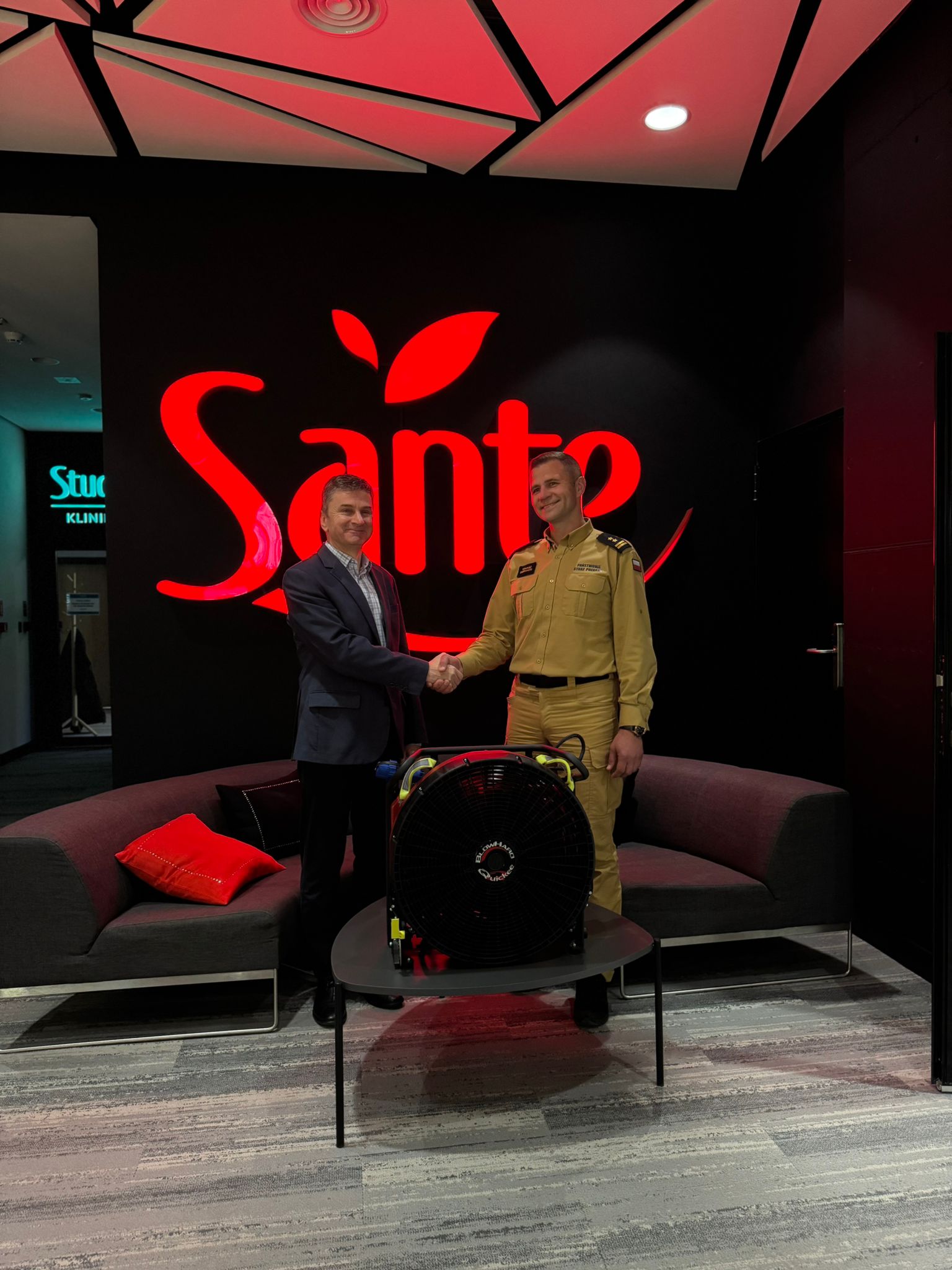 W dniu 14 listopada 2025 r., w siedzibie firmy Sante Sp. z o.o. w Warszawie odbyło się przekazanie przez Członka Zarządu Pana Wojciecha Kowalskiego na ręce Komendanta Powiatowego PSP w Garwolinie, bryg. Tomasza Biernackiego, nowoczesnego turbowentylatora akumulatorowego.