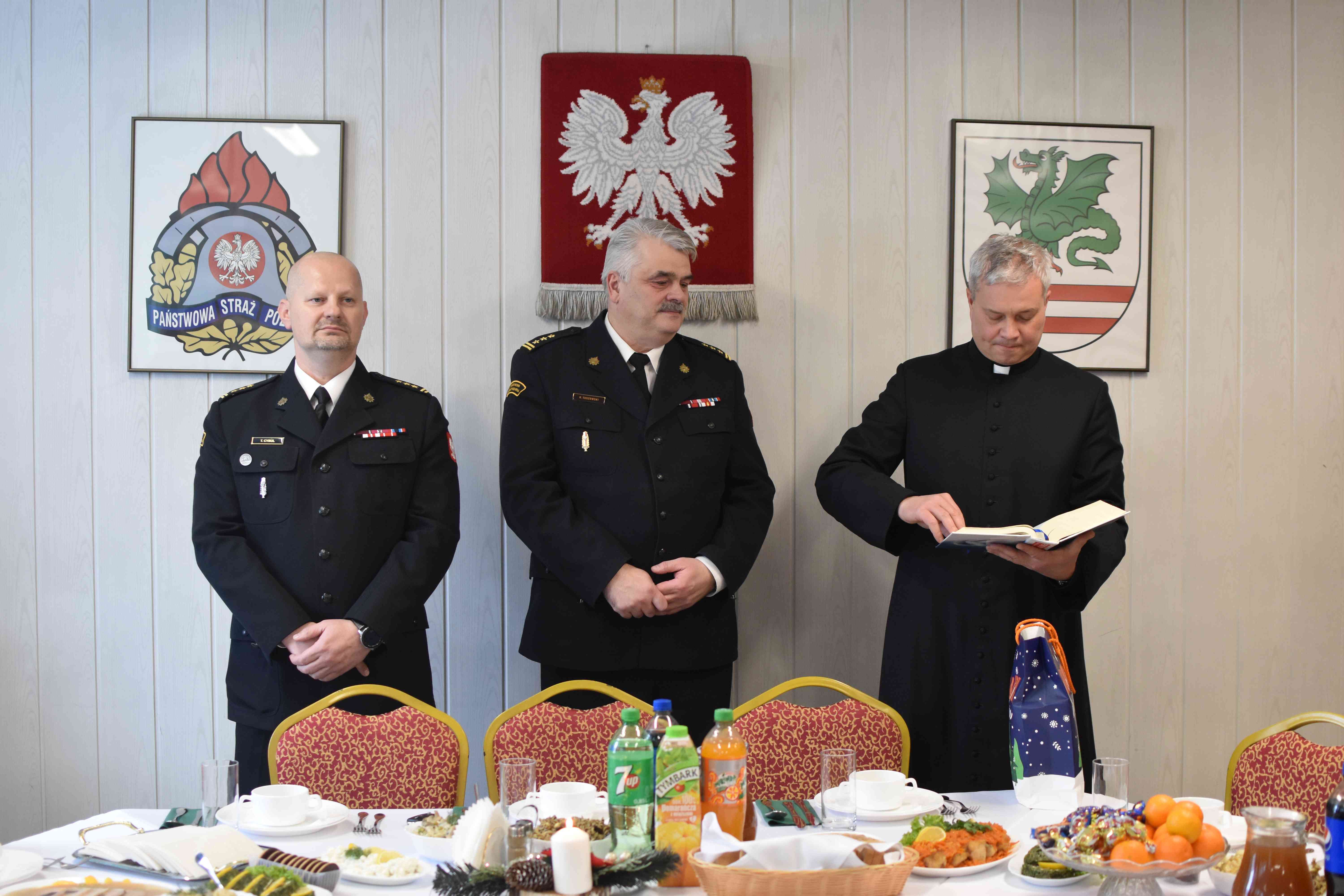 Następnie odczytano fragment Ewangelii o narodzeniu Jezusa, po czym wspólnie odśpiewano kolędę. Zaproszeni goście w swoich przemówieniach życzyli zarówno zdrowia, szczęścia osobistego, rodzinnego, jak i tego bardzo potrzebnego w strażackiej służbie społeczeństwu. W dalszej części spotkania uczestnicy podzielili się opłatkiem i składali sobie najserdeczniejsze życzenia świąteczne.