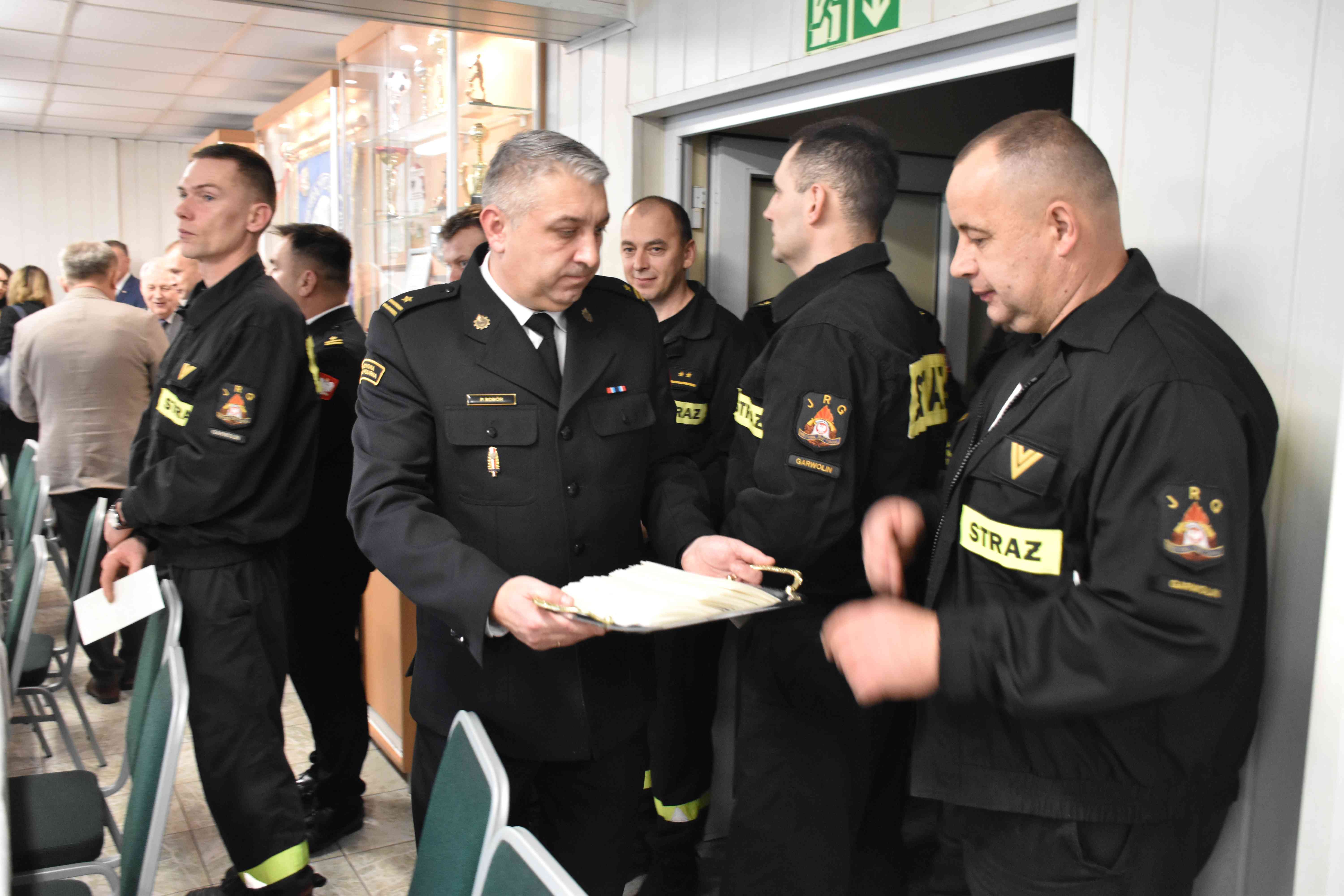 Komendant Powiatowy PSP w Garwolinie mł. bryg. Tomasz Biernacki przywitał przybyłych gości i przekazał najserdeczniejsze życzenia z okazji zbliżających się Świąt Bożego Narodzenia.