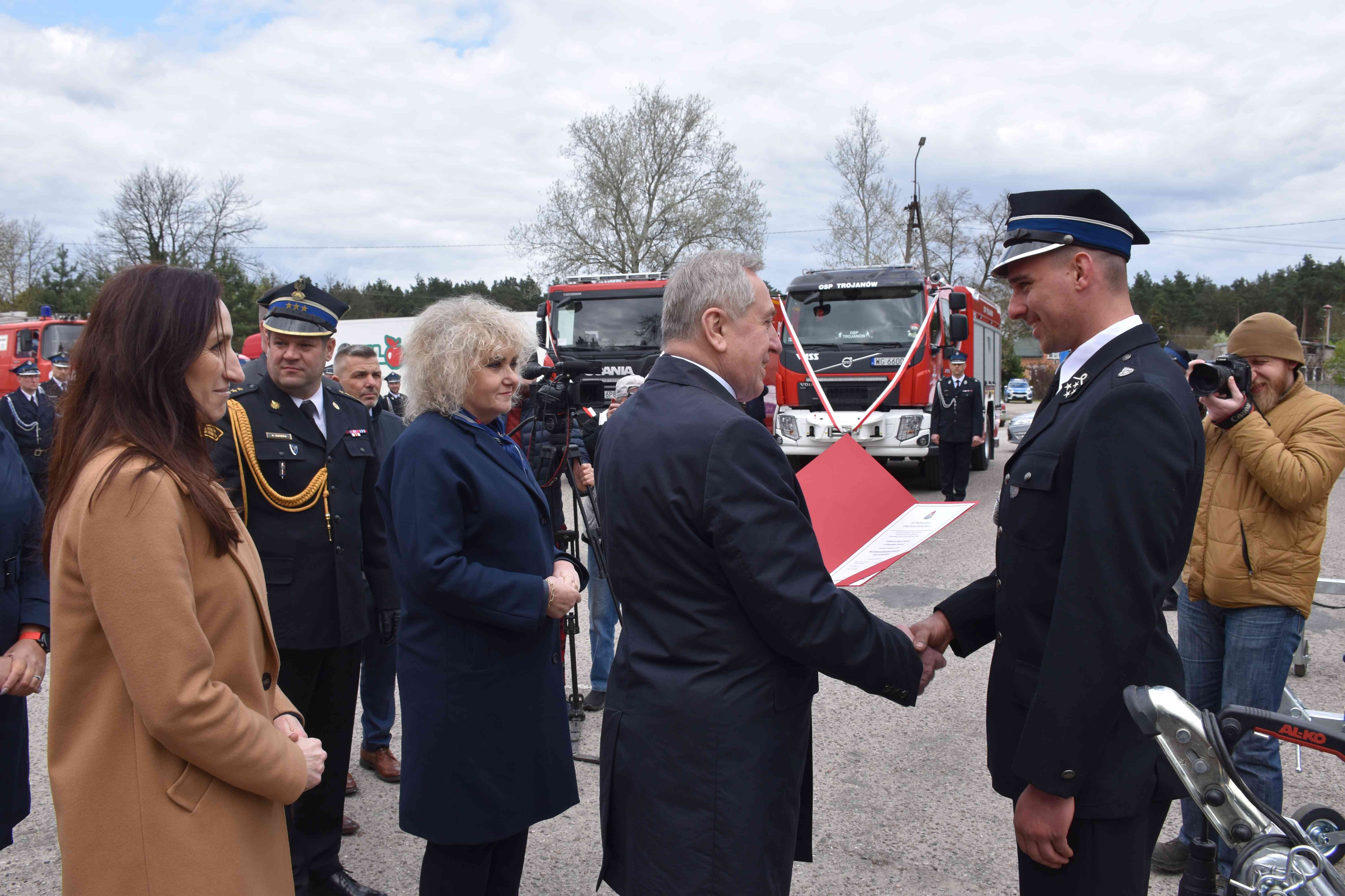 oraz druhowie z jednostek OSP otrzymujących sprzęt i funkcjonariusze KP PSP w Garwolinie.