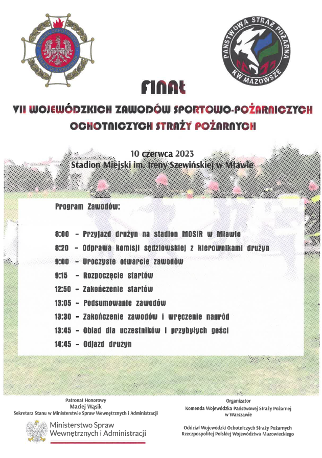 W dniu 10 czerwca na terenie Miejskiego Ośrodka Sportu i Rekreacji w Mławie rozegrany zostanie Finał VII Wojewódzkich Zawodów Sportowo-Pożarniczych OSP, w których udział wezmą następujące drużyny: