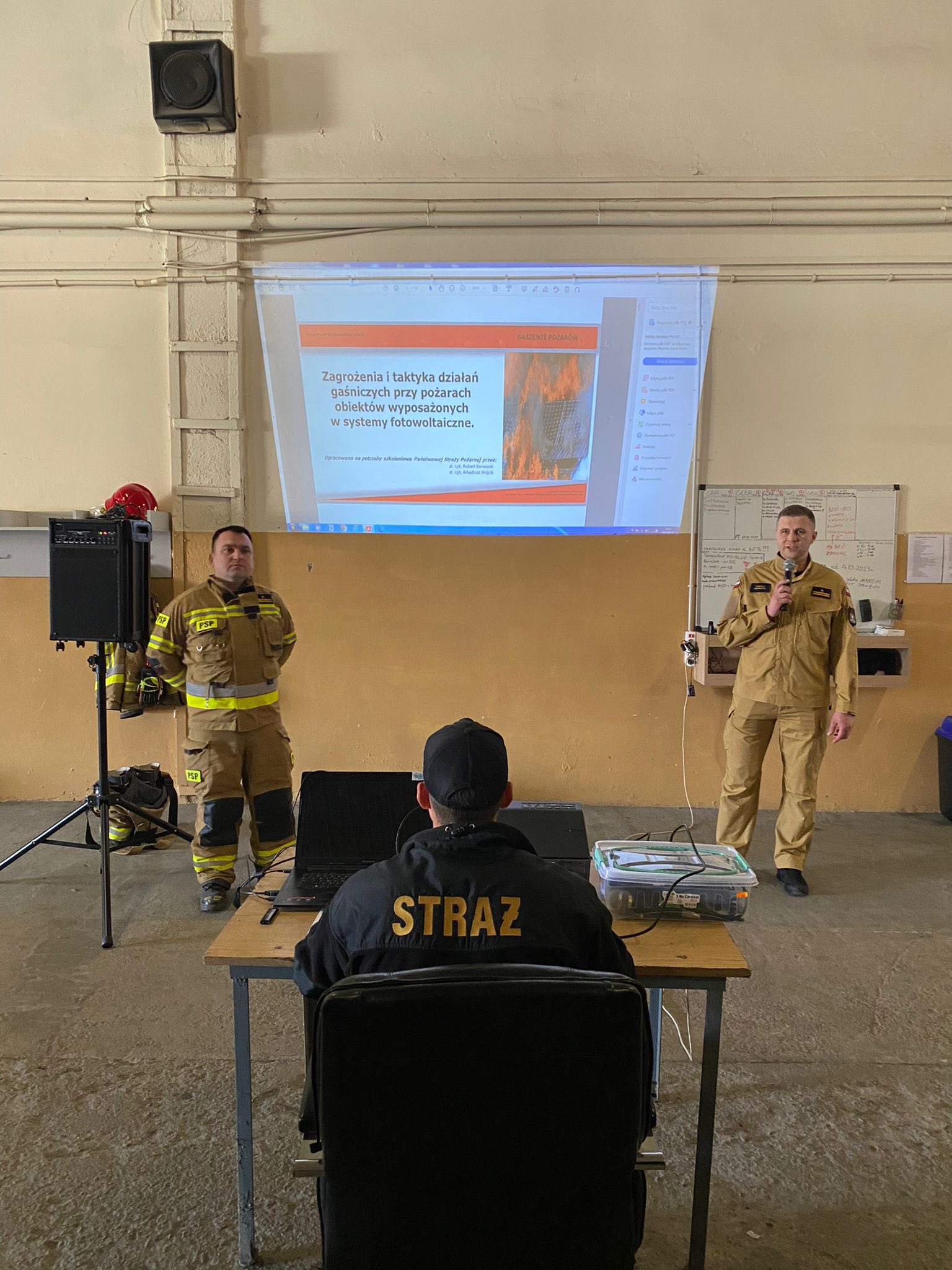 W dniach 13, 20 i 27 kwietnia 2023 roku o godz. 17.00 zostały przeprowadzone warsztaty dla strażaków JRG oraz druhów jednostek Ochotniczych Straży Pożarnych włączonych do Krajowego Systemu Ratowniczo-Gaśniczego z zakresu zasad postępowania przy zdarzeniach z udziałem instalacji fotowoltaicznych. Warsztaty zostały przeprowadzone w oparciu „Standardowe zasady postępowania podczas zdarzeń w obrębie instalacji fotowoltaicznych” zatwierdzone przez Komendanta Głównego Państwowej Straży Pożarnej.