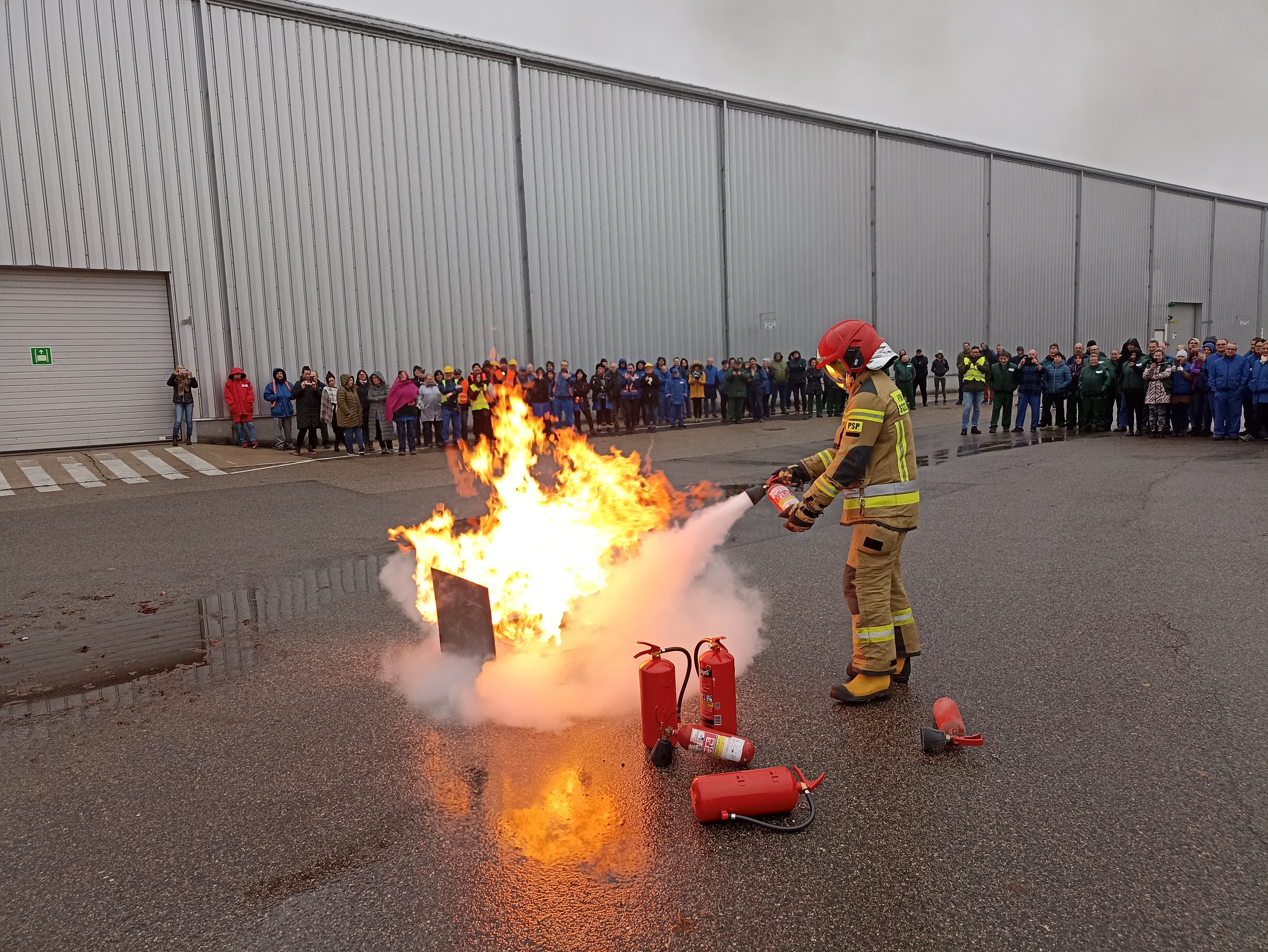 Po zakończeniu ćwiczeń dla pracowników zakładu przygotowana została prelekcja dotycząca podstawowych zasad zachowania się pracowników podczas wystąpienia zagrożenia oraz instruktaż użycia podręcznego sprzętu gaśniczego.
