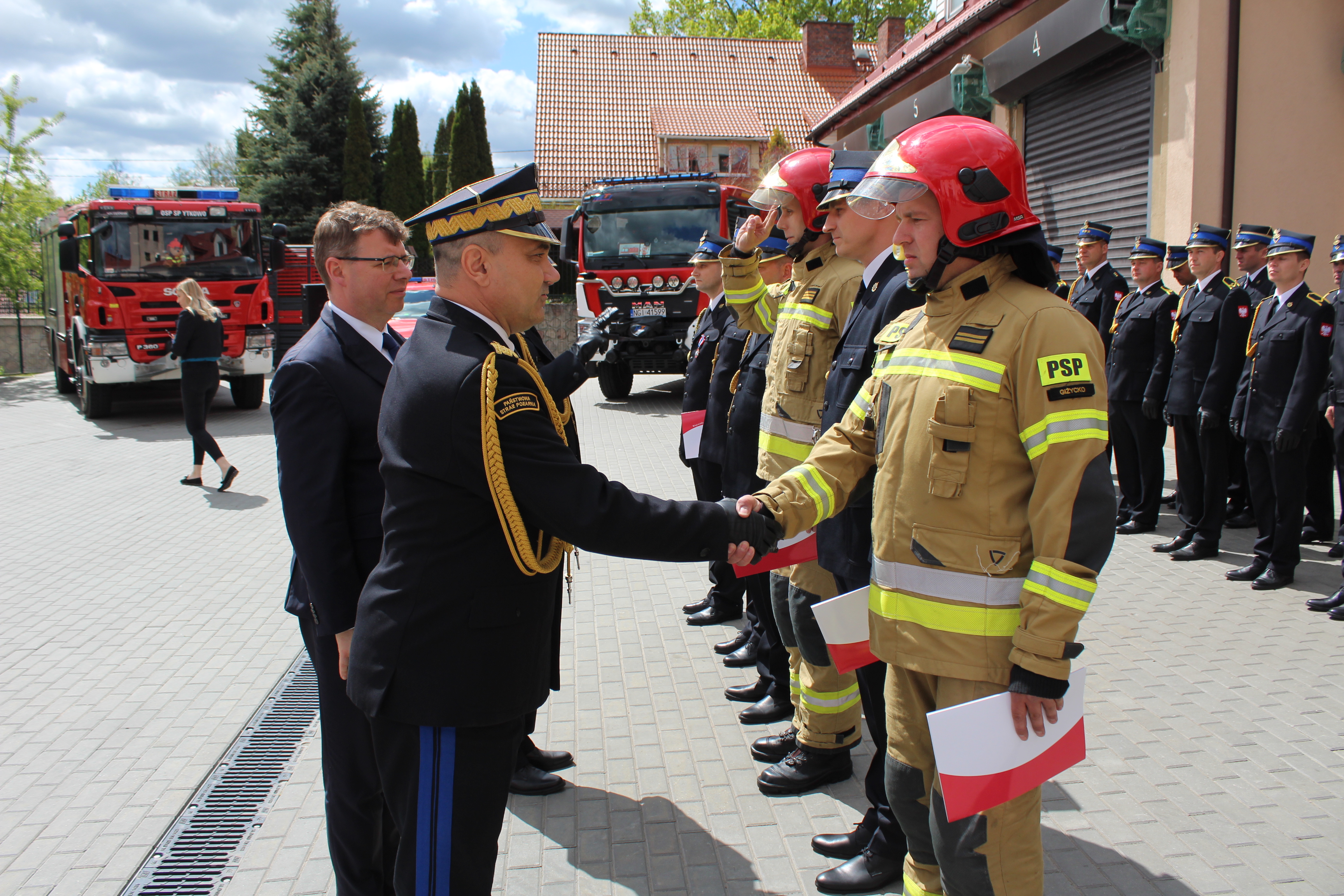 Podczas uroczystości nastąpiło wręczenie odznaczeń i awansów dla funkcjonariuszy. Istotnym elementem obchodów było również wprowadzenie do użytkowania w giżyckiej jednostce ratowniczo-gaśniczej pojazdów pożarniczych. Zakup ciężkiego samochodu ratowniczo-gaśniczego oraz samochodu operacyjnego był możliwy dzięki montażowi finansowemu na który składały się fundusze giżyckiego samorządu oraz środki pochodzące z budżetu państwa. Jednostka OSP Spytkowo również otrzymała pojazd gaśniczy, który dotychczas stacjonował w garażu JRG Giżycko. Aby pojazdy służyły niezawodnie ks. Prałat Kazimierz Gryboś kapelan giżyckich strażaków pobłogosławił i poświęcił pojazdy.
