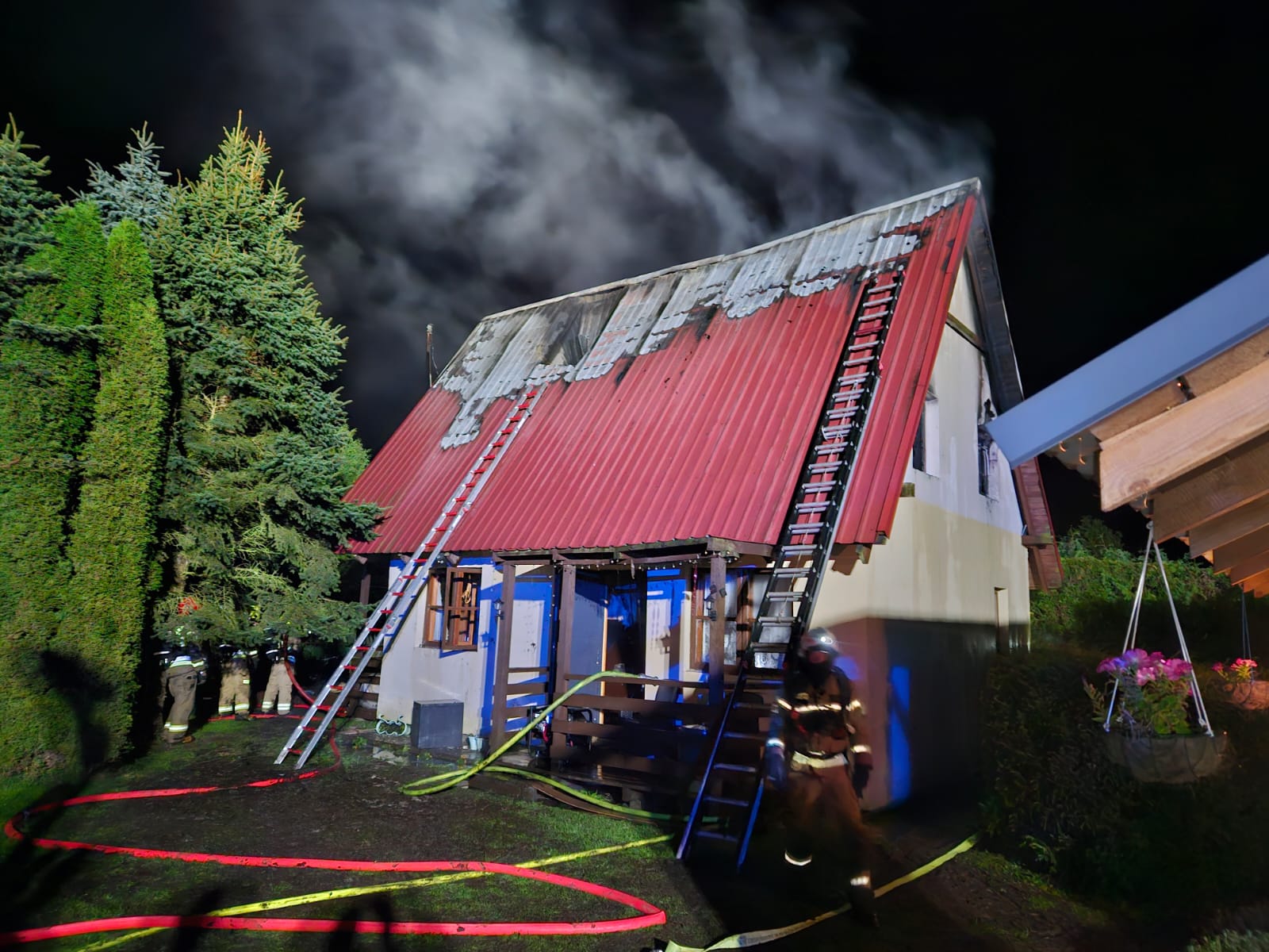 Kierujący działaniem ratowniczym w wyniku rozpoznania stwierdził, iż pali się domek letniskowy. Użytkownicy - dwie osoby dorosłe oraz 3 letnie dziecko opuścili budynek przed przyjazdem strażaków. Działania jednostek ochrony przeciwpożarowej polegały na zabezpieczenia miejsca zdarzenia, podaniu prądów wody na palący się obiekt. Utrudnieniem dla strażaków były bardzo wąskie aleje dojazdowe. Za przyczynę pożaru przyjęto nieszczelność przy piecu kominkowym.