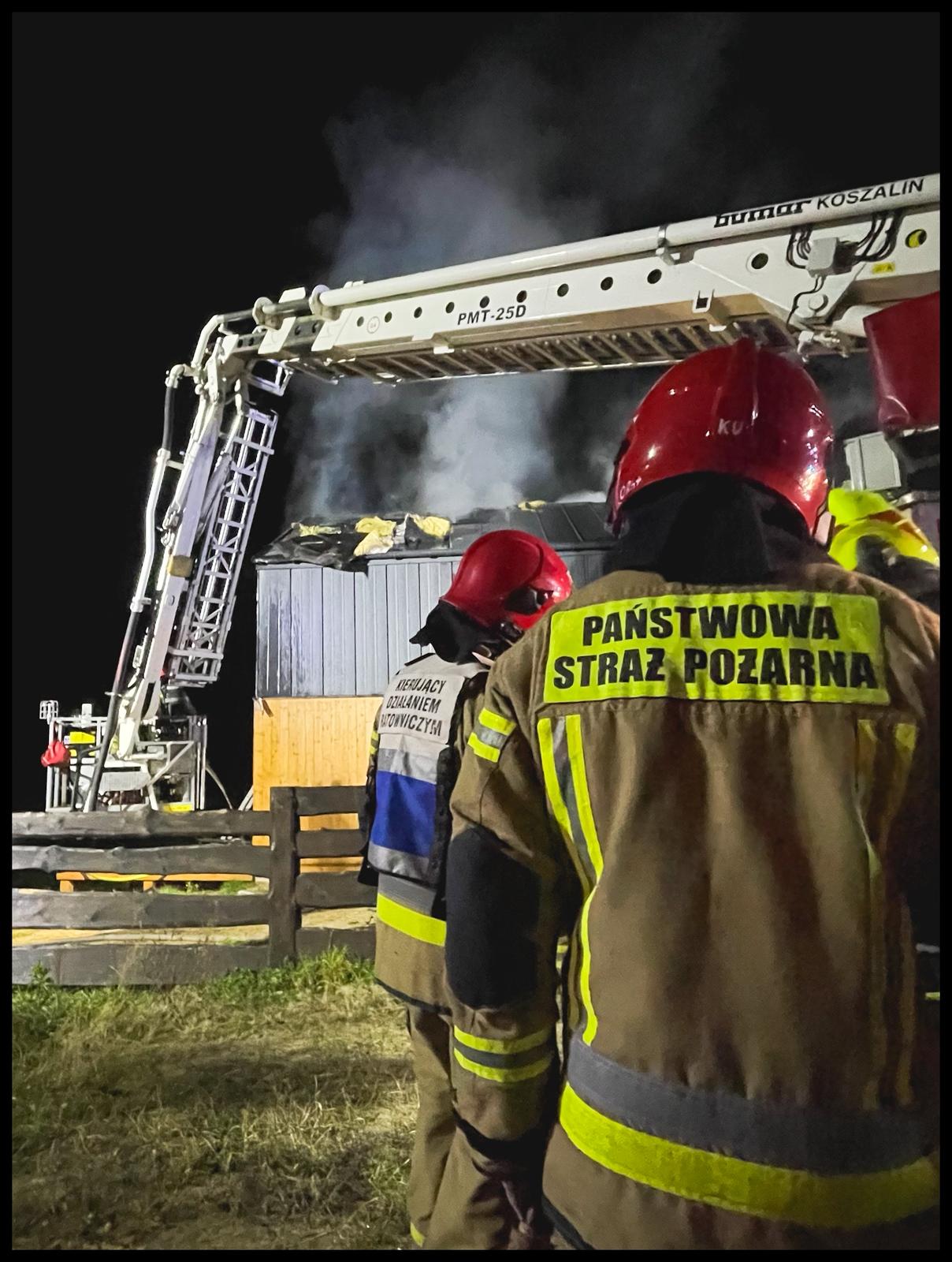 Po przybyciu na miejsce pożaru pierwszych zastępów, KDR stwierdził, że pali się domek letniskowy o konstrukcji drewnianej z dachem dwuspadowym krytym blachą. Pożar obejmuje całe wnętrze budynku na jego dwóch kondygnacjach. Płomienie wychodzą na zewnątrz przez wszystkie otwory okienne i drzwiowe. Z pod połaci dachu również wychodzą płomienie. W momencie zaistnienia pożaru w budynku przebywały trzy osoby. Wszyscy ewakuowali się z budynku przed przybyciem strażaków.