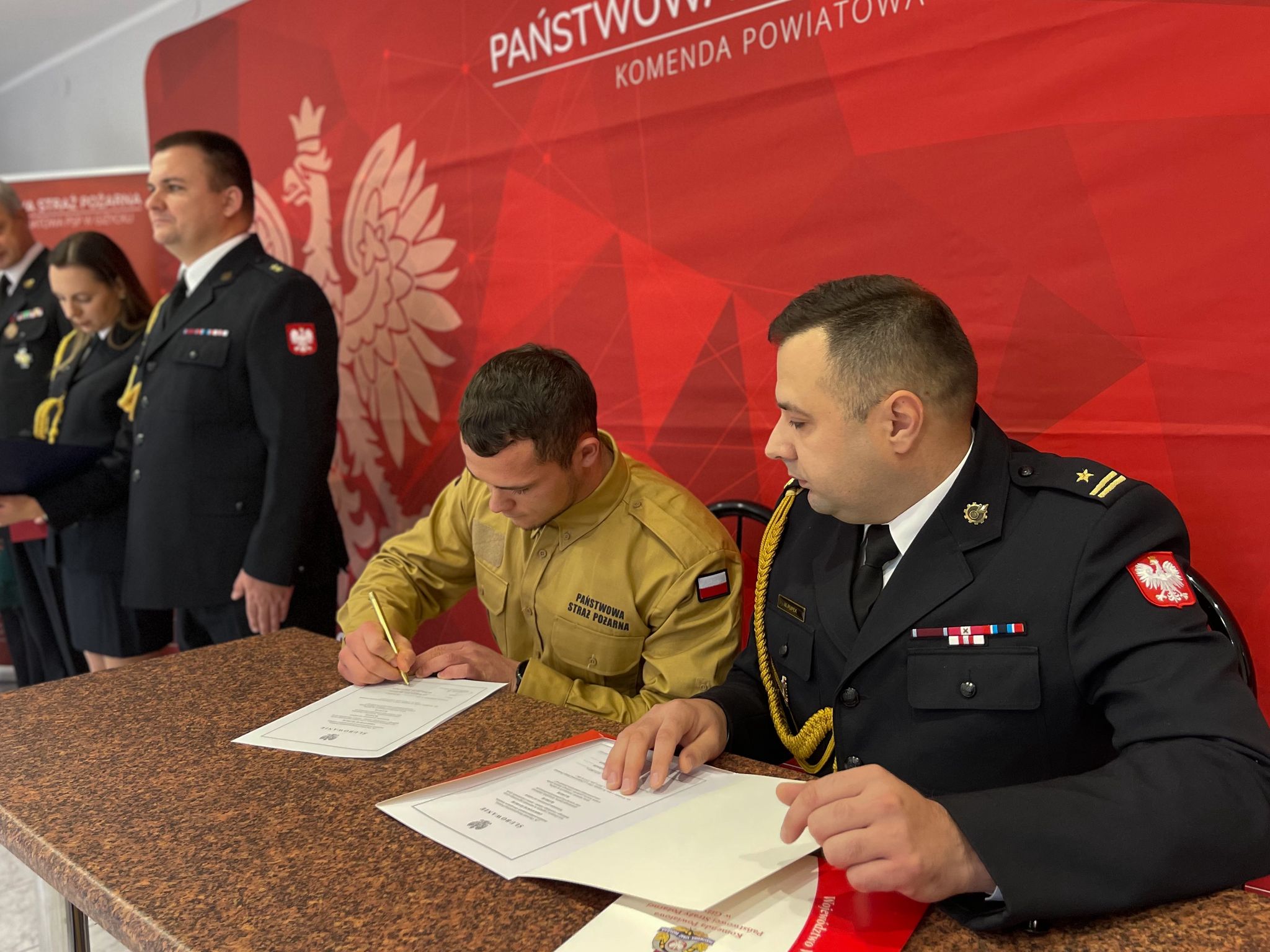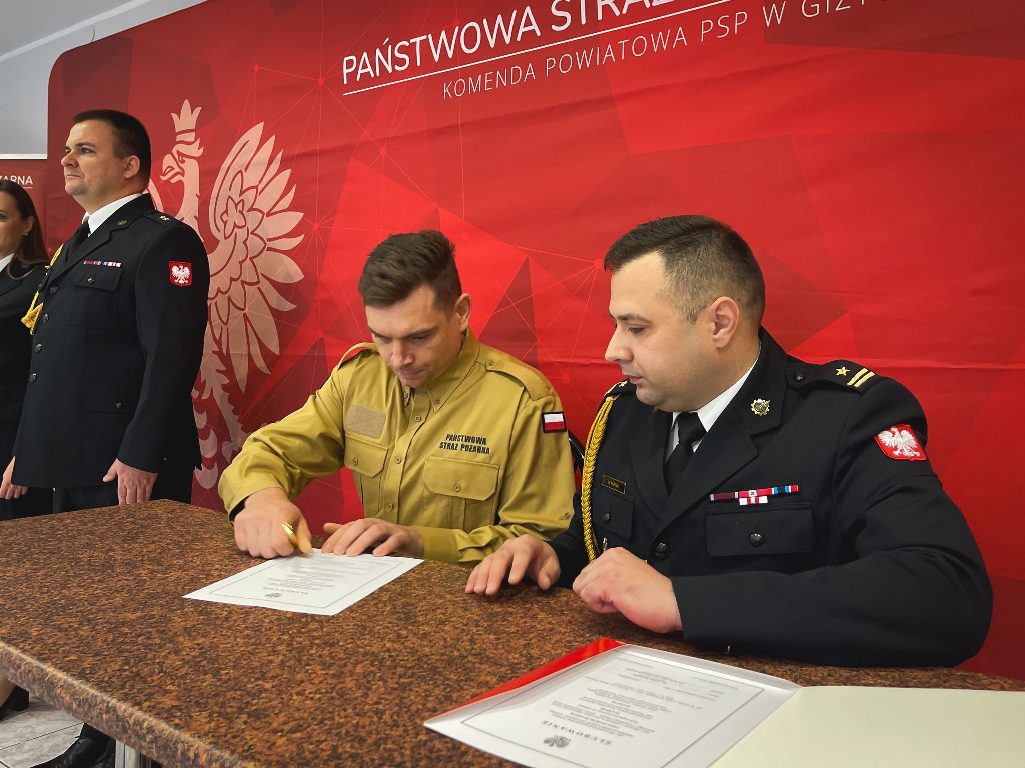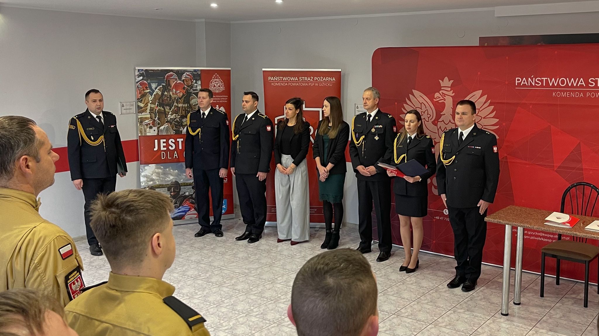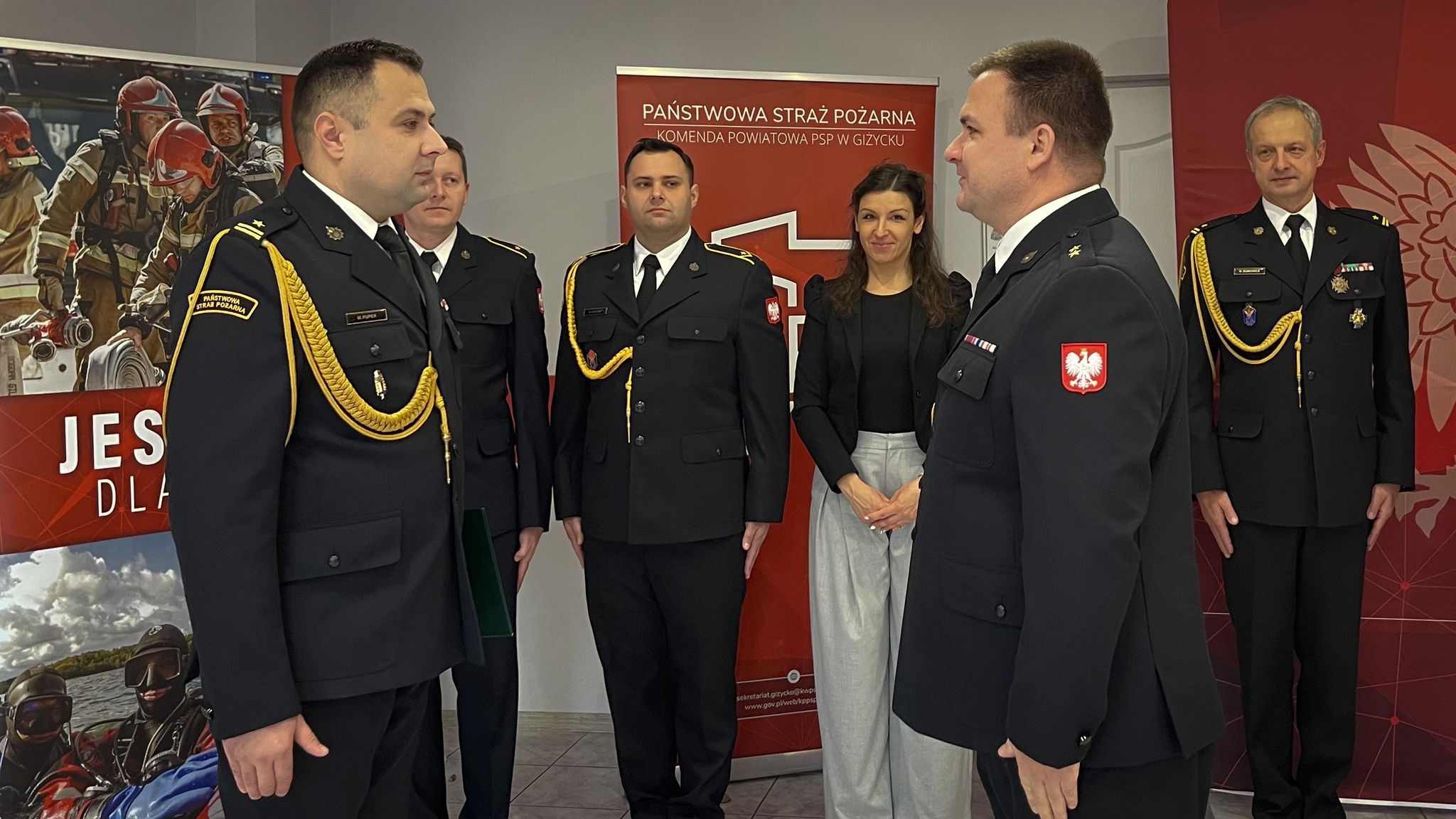 Komendant Powiatowy Państwowej Straży Pożarnej w Giżycku, mł. bryg. Mateusz Pupek wygłosił okolicznościowe przemówienie, w którym podkreślił znaczenie roli strażaka w dzisiejszym społeczeństwie. Zaznaczył, że nowi funkcjonariusze dołączają do elitarnego grona, które każdego dnia stawia czoła różnorodnym wyzwaniom, niosąc pomoc potrzebującym i dbając o bezpieczeństwo mieszkańców.