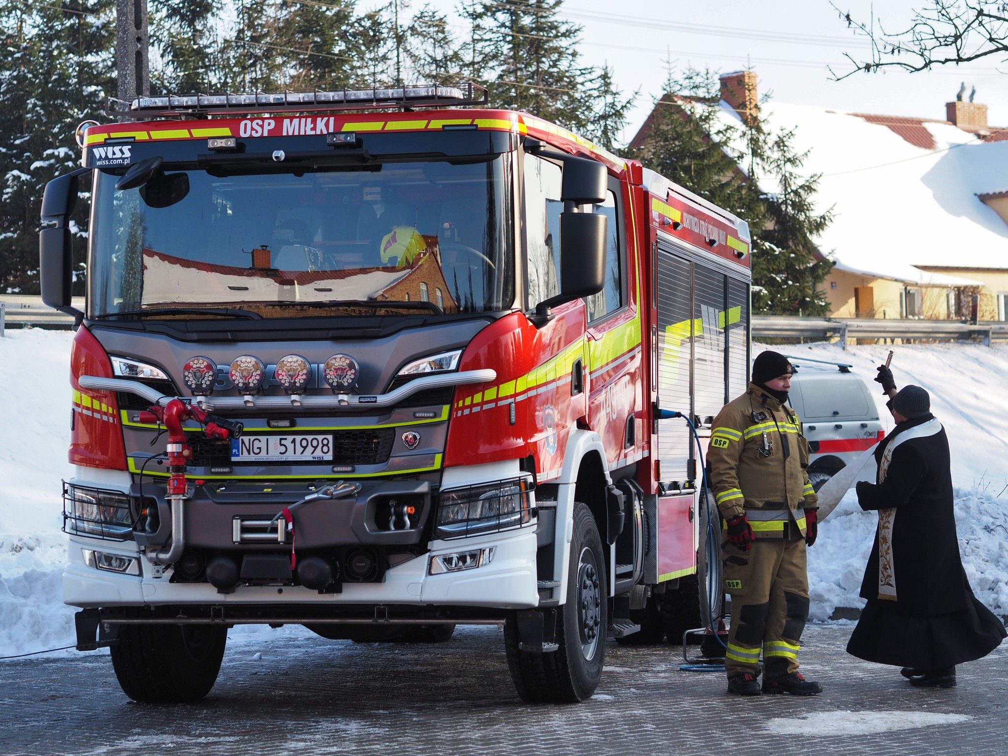 Przy pięknej mroźnej aurze 22 stycznia 2026 roku w Miłkach odbyła się uroczystość oficjalnego przekazania nowego samochodu ratowniczo-gaśniczego Scania P420 dla Ochotniczej Straży Pożarnej w Miłkach.