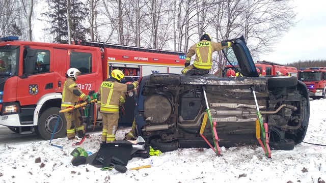 Po przybyciu na miejsce zdarzenia okazało się, że auto znajdowało się poza jezdnią i leżało na boku, a kierowca nie był w stanie samodzielnie się ewakuować. Działania zastępów polegały na zabezpieczeniu miejsca zdarzenia, wykonaniu stabilizacji pojazdu, odłączeniu akumulatorów, udzieleniu kwalifikowanej pierwszej pomocy uczestnikowi zdarzenia oraz jego ewakuacji. Następnie kierowca został przekazany przybyłemu na miejsce Zespołowi Ratownictwa Medycznego. Okoliczności zdarzenia wyjaśniają funkcjonariusze Policji.