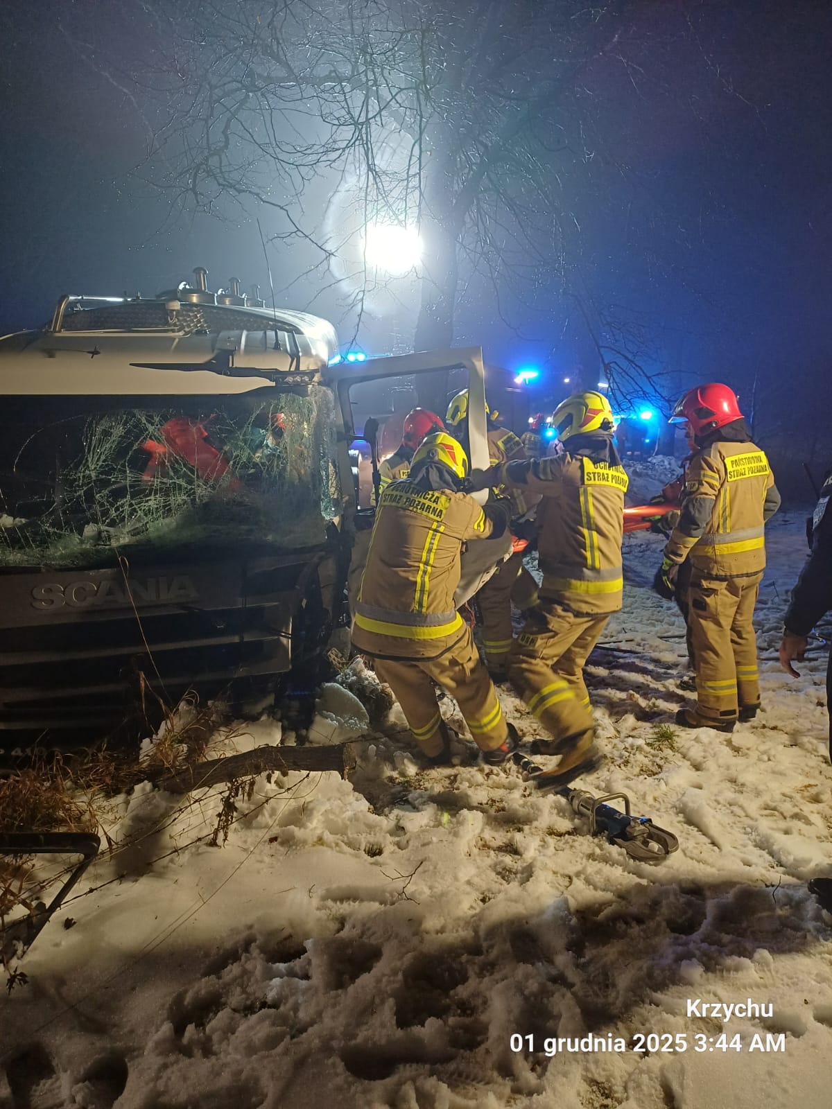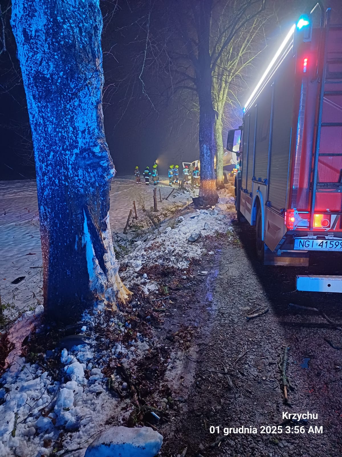 KDR w wyniku rozpoznania ustalił, że samochód ciężarowy po uderzeniu w drzewo wjechał do przydrożnego rowu. W pojeździe znajduje się przytomny mężczyzna, przy którym ratownik medyczny prowadzi medyczne czynności ratunkowe. Poszkodowany reaguje na polecenia głosowe oraz na bodźce bólowe. Z relacji ratownika medycznego wynika, że stan mężczyzny jest ciężki z podejrzeniem obrażeń wewnętrznych jamy brzusznej. Poszkodowany jest zakleszczony i należy go ewakuować z pojazdu ze względu na zagrożenie życia. Działania zastępów polegały na zabezpieczeniu miejsca zdarzenia( ruch na drodze powiatowej został wstrzymany na czas prowadzenia działań ), oświetleniu terenu, wykonaniu dostępu do poszkodowanego w celu jego ewakuacji. Do wykonania dostępu użyto sprzęt hydrauliczny, usuwając drzwi od strony kierowcy . Mężczyzna został zabrany do szpitala w Giżycku.