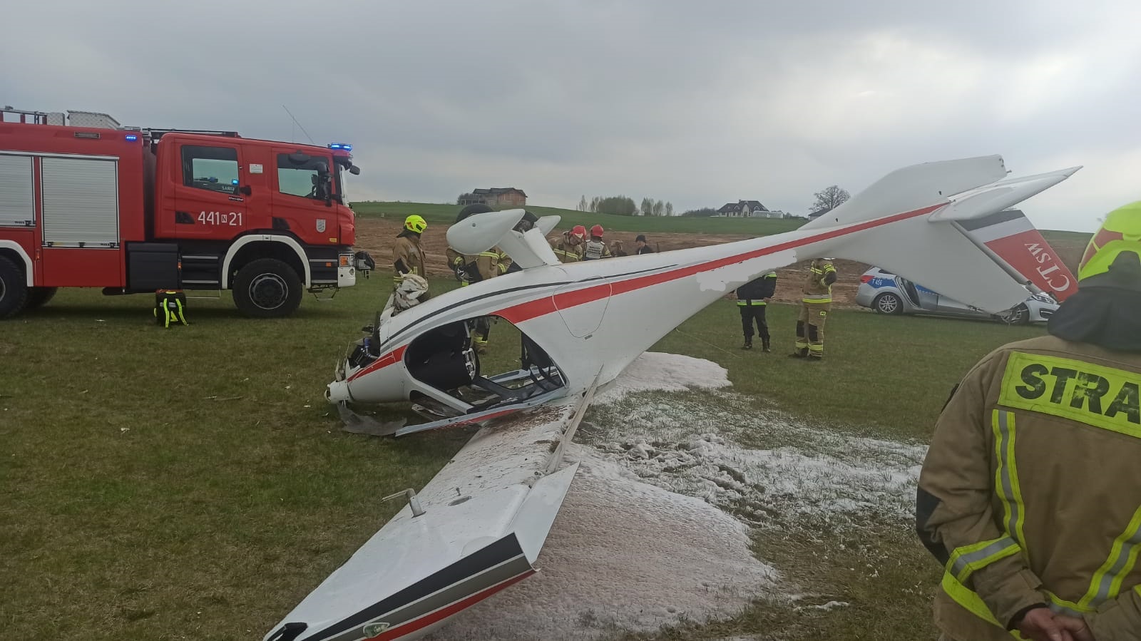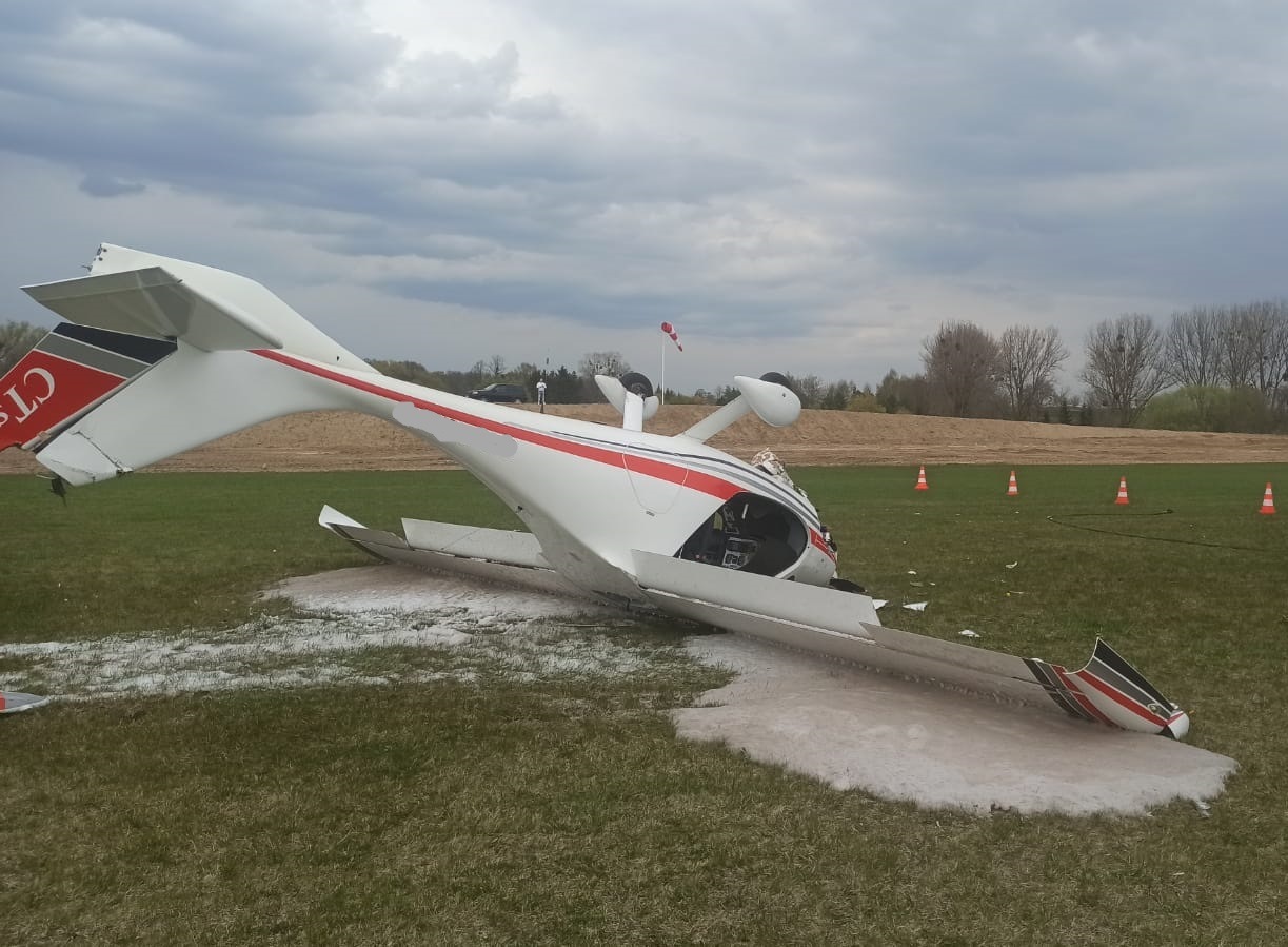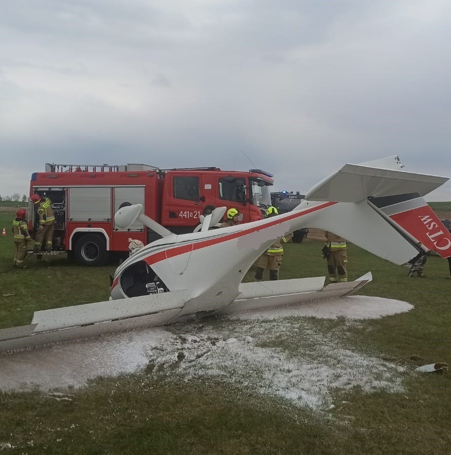 O godzinie 13:47 dyżurny otrzymał informację o zdarzeniu z udziałem awionetki, która podczas manewru lądowania wywróciła się i znajdowała się podwoziem do góry. Dwie osoby załogi opuściły maszynę samodzielnie jedna z nich wymagała dodatkowych badań natomiast druga pozostała na miejscu zdarzenia. Działania zastępów polegały na zabezpieczeniu miejsca zdarzenia oraz wykonaniu poduszki z piany gaśniczej w celu zabezpieczenia ewentualnych wycieków paliwa i płynów eksploatacyjnych.